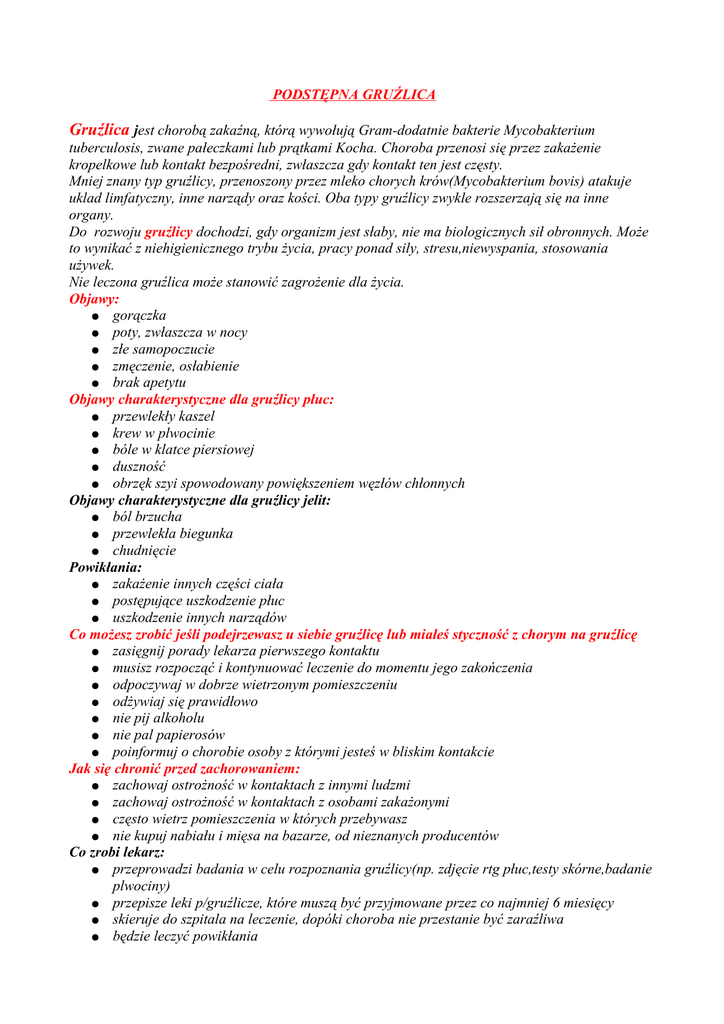 PODSTĘPNA GRUŹLICA Gruźlica jest chorobą zakaźną, którą wywołują Gram-dodatnie bakterie Mycobakterium tuberculosis, zwane pałeczkami lub prątkami Kocha. Choroba przenosi się przez zakażenie kropelkowe lub kontakt bezpośredni, zwłaszcza gdy kontakt ten jest częsty. Mniej znany typ gruźlicy, przenoszony przez mleko chorych krów(Mycobakterium bovis) atakuje uklad limfatyczny, inne narządy oraz kości. Oba typy gruźlicy zwykle rozszerzają się na inne organy. Do rozwoju gruźlicy dochodzi, gdy organizm jest słaby, nie ma biologicznych sił obronnych. Może to wynikać z niehigienicznego trybu życia, pracy ponad sily, stresu,niewyspania, stosowania używek. Nie leczona gruźlica może stanowić zagrożenie dla życia. Objawy: ● gorączka ● poty, zwłaszcza w nocy ● złe samopoczucie ● zmęczenie, osłabienie ● brak apetytu Objawy charakterystyczne dla gruźlicy płuc: ● przewlekły kaszel ● krew w plwocinie ● bóle w klatce piersiowej ● duszność ● obrzęk szyi spowodowany powiększeniem węzłów chłonnych Objawy charakterystyczne dla gruźlicy jelit: ● ból brzucha ● przewlekła biegunka ● chudnięcie Powikłania: ● zakażenie innych części ciała ● postępujące uszkodzenie płuc ● uszkodzenie innych narządów Co możesz zrobić jeśli podejrzewasz u siebie gruźlicę lub miałeś styczność z chorym na gruźlicę ● zasięgnij porady lekarza pierwszego kontaktu ● musisz rozpocząć i kontynuować leczenie do momentu jego zakończenia ● odpoczywaj w dobrze wietrzonym pomieszczeniu ● odżywiaj się prawidłowo ● nie pij alkoholu ● nie pal papierosów ● poinformuj o chorobie osoby z którymi jesteś w bliskim kontakcie Jak się chronić przed zachorowaniem: ● zachowaj ostrożność w kontaktach z innymi ludzmi ● zachowaj ostrożność w kontaktach z osobami zakażonymi ● często wietrz pomieszczenia w których przebywasz ● nie kupuj nabiału i mięsa na bazarze, od nieznanych producentów Co zrobi lekarz: ● przeprowadzi badania w celu rozpoznania gruźlicy(np. zdjęcie rtg płuc,testy skórne,badanie plwociny) ● przepisze leki p/gruźlicze, które muszą być przyjmowane przez co najmniej 6 miesięcy ● skieruje do szpitala na leczenie, dopóki choroba nie przestanie być zaraźliwa ● będzie leczyć powikłania Od 1999 roku refundacją kosztów leczenia gruźlicy objęci są wszyscy także nieubezpieczeni. Szczepienia: ● (zgodnie z obowiązującym kalendarzem szczepień w 2007r.) szczepionką BCG szczepi się zakwalifikowane do szczepienia przez lekarza pediatrę noworodki w ciągu 24 godzin po urodzeniu. Statystyka: ● W walce z gruźlicą dzieli nas od krajów zachodnich 25 lat. Co roku w Polsce umiera na tę chorobę ok. 1000 osób, chociaż jest ona całkowicie wyleczalna.W 2000 r. zanotowano w Polsce 12 tys. zachorowań. To dwa razy więcej niż np.w Czechach i na Słowacji. PSSE w Wieruszowie