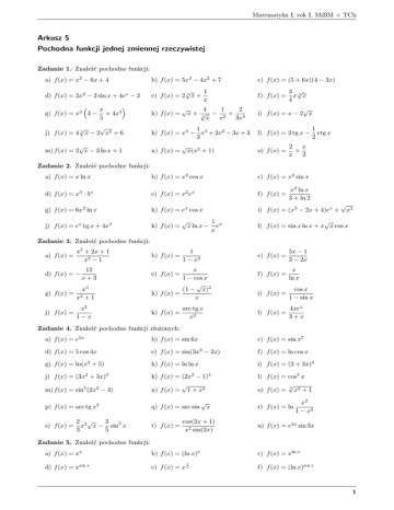 Matematyka I, rok I, MiBM + TCh Arkusz 5 Pochodna funkcji jednej zmiennej rzeczywistej Zadanie 1. Znaleźć pochodne funkcji: a) f (x) = x2 − 6x + 4 b) f (x) = 5x3 − 4x2 + 7 c) f (x) = (5 + 6x)(4 − 3x) d) f (x) = 2x2 − 2 sin x + 4ex − 2 √ 1 e) f (x) = 2 3 x + x f) f (x) = x g) f (x) = x3 3 − + 4x3 5 h) f (x) = √ √ j) f (x) = 4 3 x − 2 x5 + 6 1 k) f (x) = x4 − x3 + 2x2 − 3x + 3 3 √ m) f (x) = 2 x − 3 ln x + 1 n) f (x) = √ √ 2 4 1 x+ √ − 2+ 5 3 3x x x x(x2 + 1) 3 √ x3x 4 √ i) f (x) = x − 2 x l) f (x) = 2 tg x − o) f (x) = 1 ctg x 2 2 x + x 2 Zadanie 2. Znaleźć pochodne funkcji: a) f (x) = x ln x b) f (x) = x2 cos x c) f (x) = x2 sin x d) f (x) = x3 · 5x e) f (x) = x2 ex f) f (x) = g) f (x) = 6x2 ln x h) f (x) = ex cos x i) f (x) = (x2 − 2x + 4)ex + j) f (x) = ex tg x + 4x3 k) f (x) = √ x ln x − 1 x e x x2 ln x 3 + ln 2 √ x3 √ l) f (x) = sin x ln x + x x cos x Zadanie 3. Znaleźć pochodne funkcji: a) f (x) = x2 + 2x + 1 x3 − 1 d) f (x) = − 12 x+3 g) f (x) = x3 +1 j) f (x) = x2 x3 1−x b) f (x) = 1 1 − x2 x 1 − cos x √ (1 − x)2 h) f (x) = x e) f (x) = k) f (x) = arc tg x x2 c) f (x) = 5x − 1 3 − 2x f) f (x) = x ln x i) f (x) = cos x 1 − sin x l) f (x) = 4xex 3+x Zadanie 4. Znaleźć pochodne funkcji złożonych: a) f (x) = e5x b) f (x) = sin 6x c) f (x) = sin x7 d) f (x) = 5 cos 4x e) f (x) = sin(3x2 − 2x) f) f (x) = ln cos x g) f (x) = ln(x2 + 5) h) f (x) = ln ln x i) f (x) = (2 + 3x)5 j) f (x) = (3x2 + 3x)3 m) f (x) = sin5 (2x2 − 3) k) f (x) = (2x3 − 1)4 √ n) f (x) = 1 + x2 l) f (x) = cos3 x √ o) f (x) = 3 x2 + 1 p) f (x) = arc tg x2 q) f (x) = arc sin s) f (x) = 2 3√ 3 x x − sin5 x 3 5 t) f (x) = √ x cos(2x + 1) x2 sin(2x) r) f (x) = ln x2 1 − x2 u) f (x) = e3x sin 3x Zadanie 5. Znaleźć pochodne funkcji: a) f (x) = xx b) f (x) = (ln x)x d) f (x) = xsin x e) f (x) = x x 1 c) f (x) = xln x f) f (x) = (ln x)sin x 1