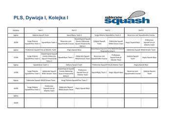 PLS, Dywizja I, Kolejka I Godzina Kort 1 Kort 2 Kort 3 Kort 4 Sędzia Zadyma Squash Team Squash4you Team 1 Surge Polonia Squash4You Team 2 Reservise com Squashmafia Cracow 10:00 Sędzia 12:00 Sędzia 14:00 Sędzia 16:00 Sędzia 18:00 Dawid Kapral Squash Surge Polonia Reservise com Events Zabierzów Squash4you Team 1 Squash4You Team 2 Squashmafia Cracow Squash Powered By Intruz C ProKennex-SquashTime pl-Atlantic Team Angry Squash Boys Zadyma Squash Team Dawid Kapral Squash Events Zabierzów Squash Powered By Intruz C Dawid Kapral Squash Events Zabierzów Zabierzów Squash Reservise com Surge Polonia Squash4you Team 1 WIGO Dream Team Squashmafia Cracow Squash4You Team 2 Squash Powered By Intruz C Squash4you Team 1 Zadyma Squash Team Dawid Kapral Squash Surge Polonia Zabierzów Squash Events Zabierzów Squash4You Team 2 WIGO Dream Team Squash Powered By Intruz C Zabierzów Squash WIGO Dream Team Surge Polonia Squash4You Team 2 ProKennexSquashTime plAtlantic Team ProKennexSquashTime plAtlantic Team Surge Polonia Squash4You Team 2 Zabierzów Squash WIGO Dream Team Angry Squash Boys Zabierzów Squash WIGO Dream Team ProKennexSquashTime plAtlantic Team ProKennex-SquashTime pl-Atlantic Team Squash4you Team 1 Angry Squash Boys Angry Squash Boys ProKennexSquashTime plAtlantic Team Zabierzów Squash WIGO Dream Team Zadyma Squash Team Angry Squash Boys Angry Squash Boys Reservise com Squashmafia Cracow Zadyma Squash Team