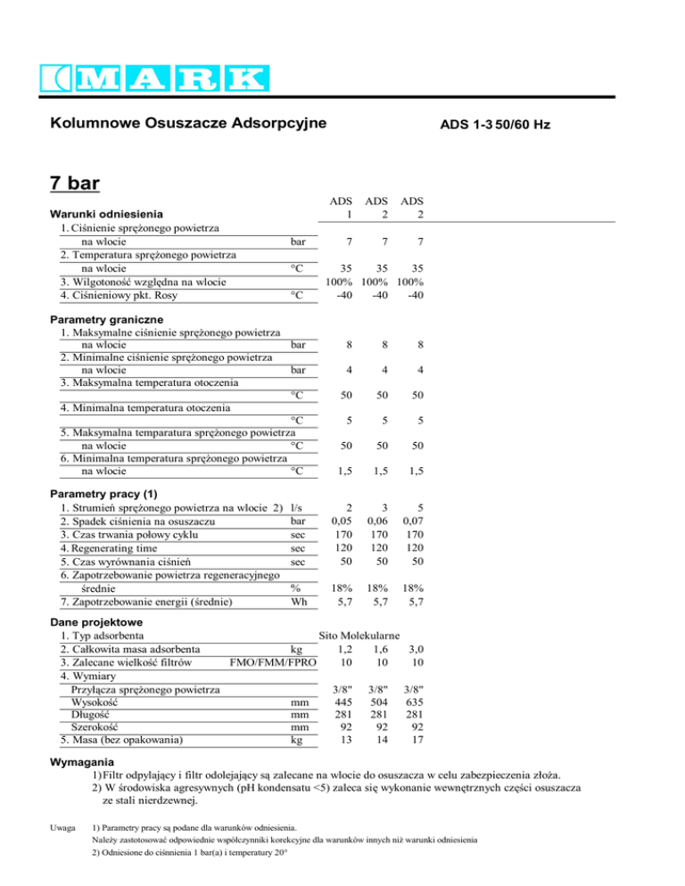Kolumnowe Osuszacze Adsorpcyjne ADS 1-3 50/60 Hz 7 bar Warunki odniesienia 1. Ci Compressed nienie spraironego effective powietrza na wlocie 2. Temperatura spr onego powietrza na wlocie 3. Wilgotono wzgl dna na wlocie 4. Ci nieniowy pkt. Rosy bar °C °C Parametry graniczne 1. Maksymalne ci nienie spr onego powietrza na wlocie bar 2. Minimalne ci nienie spr onego powietrza na wlocie bar 3. Maksymalna temperatura otoczenia °C 4. Minimalna temperatura otoczenia °C 5. Maksymalna temparatura spr onego powietrza na wlocie °C 6. Minimalna temperatura spr onego powietrza na wlocie °C Parametry pracy (1) 1. Strumie spr onego powietrza na wlocie 2) 2. Spadek ci nienia na osuszaczu 3. Czas trwania po owy cyklu 4. Regenerating Czas regeneracji time 5. Czas wyrównania ci nie 6. Zapotrzebowanie powietrza regeneracyjnego rednie 7. Zapotrzebowanie energii ( rednie) ADS 1 ADS 2 ADS 2 7 7 7 35 35 35 100% 100% 100% -40 -40 -40 8 8 8 4 4 4 50 50 50 5 5 5 50 50 50 1,5 1,5 1,5 l/s bar sec sec sec 2 0,05 170 120 50 3 0,06 170 120 50 5 0,07 170 120 50 % Wh 18% 5,7 18% 5,7 18% 5,7 Dane projektowe 1. Typ adsorbenta Sito Molekularne kg 1,2 1,6 2. Ca kowita masa adsorbenta FMO/FMM/FPRO 10 10 3. Zalecane wielko filtrów 4. Wymiary 3/8" 3/8" Przy cza spr onego powietrza Wysoko mm 445 504 ugo mm 281 281 Szeroko mm 92 92 5. Masa (bez opakowania) kg 13 14 3,0 10 3/8" 635 281 92 17 Wymagania 1) Filtr odpylaj cy i filtr odolejaj cy s zalecane na wlocie do osuszacza w celu zabezpieczenia z a. 2) W rodowiska agresywnych (pH kondensatu <5) zaleca si wykonanie wewn trznych cz ci osuszacza ze stali nierdzewnej. Uwaga 1) Parametry pracy s podane dla warunków odniesienia. Nale y zastotosowa odpowiednie wspó czynniki korekcyjne dla warunków innych ni warunki odniesienia 2) Odniesione do ci nnienia 1 bar(a) i temperatury 20° 06-06