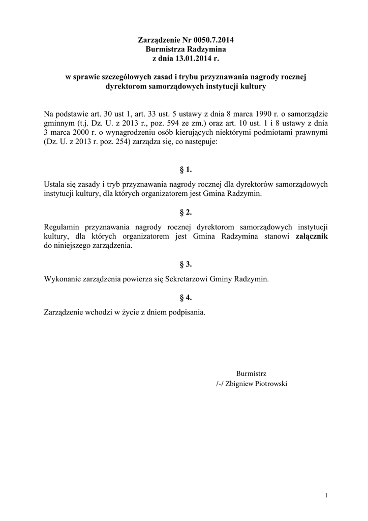 Zarządzenie Nr 0050.7.2014 Burmistrza Radzymina z dnia 13.01