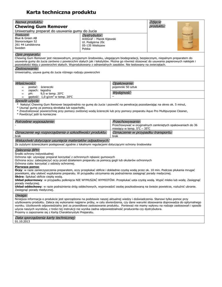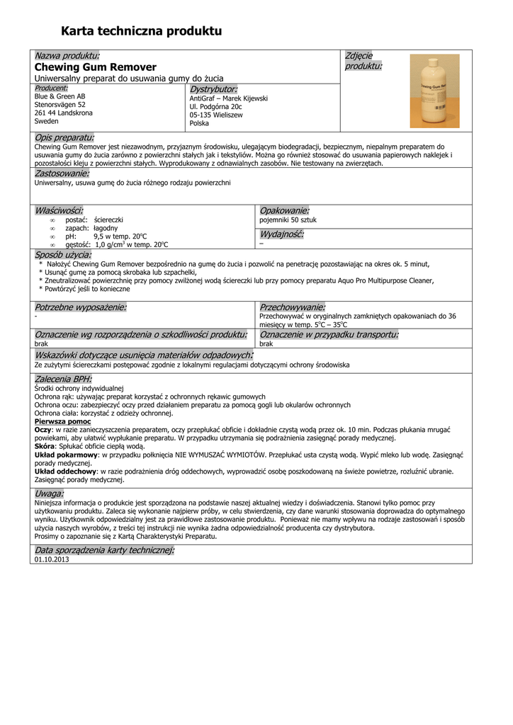 Karta techniczna produktu Nazwa produktu: Zdjęcie produktu: Chewing Gum Remover Uniwersalny preparat do usuwania gumy do żucia Producent: Dystrybutor: Blue & Green AB Stenorsvägen 52 261 44 Landskrona Sweden AntiGraf – Marek Kijewski Ul. Podgórna 20c 05-135 Wieliszew Polska Opis preparatu: Chewing Gum Remover jest niezawodnym, przyjaznym środowisku, ulegającym biodegradacji, bezpiecznym, niepalnym preparatem do usuwania gumy do żucia zarówno z powierzchni stałych jak i tekstyliów. Można go również stosować do usuwania papierowych naklejek i pozostałości kleju z powierzchni stałych. Wyprodukowany z odnawialnych zasobów. Nie testowany na zwierzętach. Zastosowanie: Uniwersalny, usuwa gumę do żucia różnego rodzaju powierzchni Właściwości: • • • • postać: zapach: pH: gęstość: Opakowanie: ściereczki łagodny 9,5 w temp. 20oC 1,0 g/cm3 w temp. 20oC pojemniki 50 sztuk Wydajność: – Sposób użycia: * * * * Nałożyć Chewing Gum Remover bezpośrednio na gumę do żucia i pozwolić na penetrację pozostawiając na okres ok. 5 minut, Usunąć gumę za pomocą skrobaka lub szpachelki, Zneutralizować powierzchnię przy pomocy zwilżonej wodą ściereczki lub przy pomocy preparatu Aquo Pro Multipurpose Cleaner, Powtórzyć jeśli to konieczne Potrzebne wyposażenie: Przechowywanie: - Przechowywać w oryginalnych zamkniętych opakowaniach do 36 miesięcy w temp. 5oC – 35oC Oznaczenie wg rozporządzenia o szkodliwości produktu: Oznaczenie w przypadku transportu: brak brak Wskazówki dotyczące usunięcia materiałów odpadowych: Ze zużytymi ściereczkami postępować zgodnie z lokalnymi regulacjami dotyczącymi ochrony środowiska Zalecenia BPH: Środki ochrony indywidualnej Ochrona rąk: używając preparat korzystać z ochronnych rękawic gumowych Ochrona oczu: zabezpieczyć oczy przed działaniem preparatu za pomocą gogli lub okularów ochronnych Ochrona ciała: korzystać z odzieży ochronnej. Pierwsza pomoc Oczy: w razie zanieczyszczenia preparatem, oczy przepłukać obficie i dokładnie czystą wodą przez ok. 10 min. Podczas płukania mrugać powiekami, aby ułatwić wypłukanie preparatu. W przypadku utrzymania się podrażnienia zasięgnąć porady medycznej. Skóra: Spłukać obficie ciepłą wodą. Układ pokarmowy: w przypadku połknięcia NIE WYMUSZAĆ WYMIOTÓW. Przepłukać usta czystą wodą. Wypić mleko lub wodę. Zasięgnąć porady medycznej. Układ oddechowy: w razie podrażnienia dróg oddechowych, wyprowadzić osobę poszkodowaną na świeże powietrze, rozluźnić ubranie. Zasięgnąć porady medycznej. Uwaga: Niniejsza informacja o produkcie jest sporządzona na podstawie naszej aktualnej wiedzy i doświadczenia. Stanowi tylko pomoc przy użytkowaniu produktu. Zaleca się wykonanie najpierw próby, w celu stwierdzenia, czy dane warunki stosowania doprowadza do optymalnego wyniku. Użytkownik odpowiedzialny jest za prawidłowe zastosowanie produktu. Ponieważ nie mamy wpływu na rodzaje zastosowań i sposób użycia naszych wyrobów, z treści tej instrukcji nie wynika żadna odpowiedzialność producenta czy dystrybutora. Prosimy o zapoznanie się z Kartą Charakterystyki Preparatu. Data sporządzenia karty technicznej: 01.10.2013