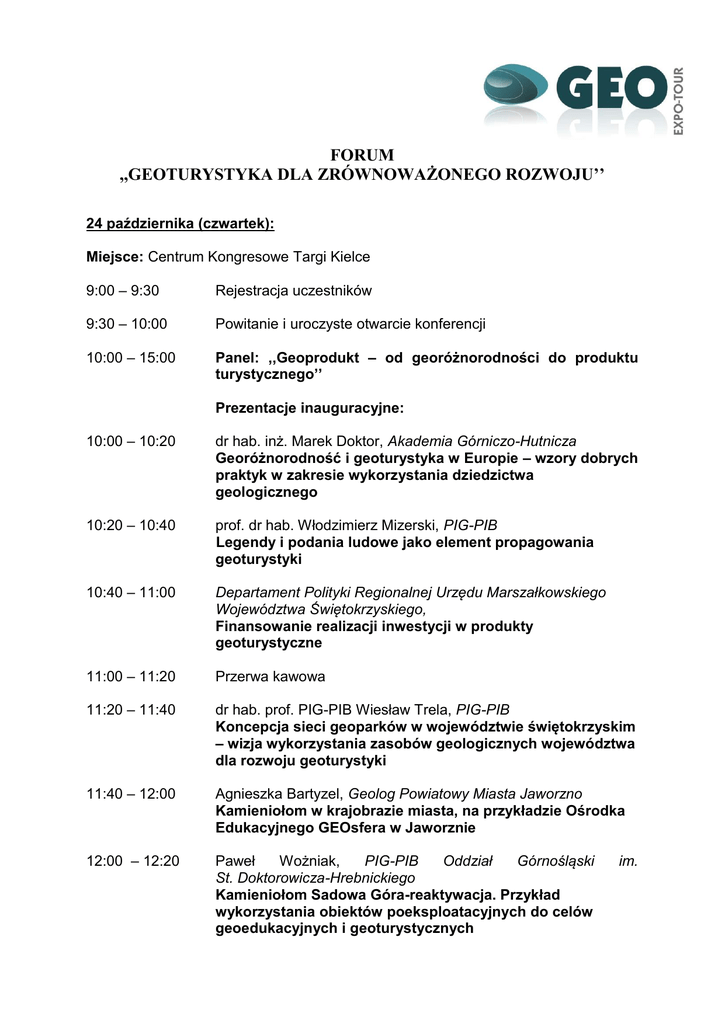 FORUM ,,GEOTURYSTYKA DLA ZRÓWNOWAŻONEGO ROZWOJU’’ 24 października (czwartek): Miejsce: Centrum Kongresowe Targi Kielce 9:00 – 9:30 Rejestracja uczestników 9:30 – 10:00 Powitanie i uroczyste otwarcie konferencji 10:00 – 15:00 Panel: ,,Geoprodukt – od georóżnorodności do produktu turystycznego’’ Prezentacje inauguracyjne: 10:00 – 10:20 dr hab. inż. Marek Doktor, Akademia Górniczo-Hutnicza Georóżnorodność i geoturystyka w Europie – wzory dobrych praktyk w zakresie wykorzystania dziedzictwa geologicznego 10:20 – 10:40 prof. dr hab. Włodzimierz Mizerski, PIG-PIB Legendy i podania ludowe jako element propagowania geoturystyki 10:40 – 11:00 Departament Polityki Regionalnej Urzędu Marszałkowskiego Województwa Świętokrzyskiego, Finansowanie realizacji inwestycji w produkty geoturystyczne 11:00 – 11:20 Przerwa kawowa 11:20 – 11:40 dr hab. prof. PIG-PIB Wiesław Trela, PIG-PIB Koncepcja sieci geoparków w województwie świętokrzyskim – wizja wykorzystania zasobów geologicznych województwa dla rozwoju geoturystyki 11:40 – 12:00 Agnieszka Bartyzel, Geolog Powiatowy Miasta Jaworzno Kamieniołom w krajobrazie miasta, na przykładzie Ośrodka Edukacyjnego GEOsfera w Jaworznie 12:00 – 12:20 Paweł Wożniak, PIG-PIB Oddział Górnośląski St. Doktorowicza-Hrebnickiego Kamieniołom Sadowa Góra-reaktywacja. Przykład wykorzystania obiektów poeksploatacyjnych do celów geoedukacyjnych i geoturystycznych im. 12:20 – 13:20 Lunch 13:20 – 13.40 dr Ryszard Chybiorz, dr Jerzy Nita, Uniwersytet Śląski, Atrakcje turystyczne i geoturystyczne wyrobisk powierzchniowych województwa śląskiego 13:40 – 14:00 S. Kosakowski, A. Rybak, Kopalnia Ćwiczebna Muzeum Miejskiego "Sztygarka" - wykorzystanie obiektu do celów geoturystycznych 14.00 – 14.20 Szymon Bartosik, Krzysztof Bochenek, Małopolska Organizacja Turystyczna, Pod i na ziemi – Małopolska geoturystyczna mekka 14.20 – 14.40 dr inż. Jan Urban, Instytut Ochrony Przyrody PAN, Jaskinie jako obiekty geoturystyczne 18:00 Spotkanie integracyjne 25 października (piątek): Miejsce: Centrum Kongresowe Targi Kielce 10:00 – 15:00 Panel: ,,Górnictwo dla zrównoważonego rozwoju’’ Prezentacje inauguracyjne: 10:00 – 10:20 dr Magdalena Sidorczuk, PIG-PIB Geoturystyka - wykorzystanie terenów górniczych na rzecz turystyki zrównoważonej 10:20 – 10:40 mgr inż. Tadeusz Mierzwa, Prezes Stowarzyszenia Inżynierów i Techników Górnictwa, Oddział w Kielcach Zrekultywowane obiekty pogórnicze wizytówką regionu Świętokrzyskiego 10:40 – 11:00 Marek Waldemar Jończyk, Renata Martyniak, PGE GiEK S.A. Oddział Kopalnia Węgla Brunatnego Bełchatów, Ochrona skarbów ziemi, edukacja, promocja, badania naukowe i geoturystyka jako elementy działalności służby geologicznej Kopalni Bełchatów 11:00 – 11:20 Przerwa kawowa 11.20 – 11.40 Aleksander Czepek, Karol Niszczota, Pracownia Projektowania Budowlanego STATYK Bydgoszcz, Kopalnia Kowala - Dyckerhoff Polska - od historii po kierunki rekultywacji - wizualizacja 11.40 – 12.20 Prezentacje konferencyjne (2 prezentacje po 20 minut) 12:20 – 13:20 Lunch 13:20 – 14:20 Prezentacje konferencyjne (3 prezentacje po 20 minut) 14:20 – 14:40 Przerwa kawowa 14:40 – 15:00 Dyskusja 15:00 – 15:15 Podsumowanie i zakończenie Panelu - Konferencji 26 października (sobota): Sesja terenowa 10:00 Zbiórka uczestników pod Centrum Konferencyjnym (przejazd autokarem do obiektów geoturystycznych na terenie Kielc) 10:30 – 11:00 Ślichowice – Rezerwat Skalny im. Jana Czarnockiego 11:20 – 12:20 Kadzielnia – przykład rewitalizacji terenu pogórniczego pod potrzeby kultury, edukacji i wypoczynku (w ramach wycieczki zwiedzanie Parku i Amfiteatru Kadzielnia oraz podziemnej trasy turystycznej) 12:40 – 14:00 Wietrznia z Centrum Geoedukacji – od eksploatacji surowców skalnych do geoturystyki i edukacji geologicznej (prezentacja obiektu wraz z Galerią Ziemi i sesją w kinie 5D) Uwaga! – w zależności od warunków atmosferycznych program sesji terenowej dotyczący obiektów znajdujących się na wolnym powietrzu może ulec zmianie