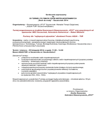 Serdecznie zapraszamy na XII TURNIEJ PŁYWACKI OSÓB NIEPEŁNOSPRAWNYCH „Skok do w ody” - Szczecinek 2014 Organizatorzy: - Stowarzyszenie „ATUT” Szczecinek - Warsztat Terapii Zajęciowej - „AQUA-TUR” Szczecinek (Basen) Turniej zorganizowano ze środków finansowych Stowarzyszenia ,,ATUT” oraz pozyskanych od sponsorów: MEC Szczecinek, Kancelaria Komornicza – Robert Wisłocki Puchary dla “najlepszych pływaków” ufundował Prezes AQUA – TUR Uczestnicy - osoby z niepełnosprawnością fizyczną, intelektualną bądź psychiczną, podopieczni placówek : warsztatów terapii zajęciowej i środowiskowych domów samopomocy z Kołobrzegu, Turowa, Bornego Sulinowa, Czarnego, Modrzewca i Szczecinka oraz z PSOUU Koło w Szczecinku(7 placówek) Termin i miej sce – 29 listopada 2014r. w godz. 11.00 – 14.00 Basen AQUA-TUR w Szczecinku ul. Szczecińska 2 Założenia Turnieju: pokazanie możliwości osób niepełnosprawnych budowanie świadomości pozytywnego odbioru osób niepełnosprawnych (poprzez przekaz medialny – telewizyjny, prasowy) wzmacnianie poczucia wartości osób niepełnosprawnych poprzez pokonywanie własnych słabości i ograniczeń; integracja społeczna poprzez zacieranie barier dostępu do życia społecznego; pobudzanie sportowego ducha i popularyzowanie rekreacji na basenie; a przede wszystkim wyłonienie spośród zawodników “najlepszych pływaków niepełnosprawnych na dystansie 25m, 50m, 100m. Niepełnosprawnym uczestnikom Turnieju pomagać będą wolontariusze – młodzież szkolna. W tym dniu nie zabraknie kibiców: rodziców, przyjaciół i sąsiadów zawodników. Pozdrawiam w imieniu Organizatorów Emilia Komorska Sekretarz Stowarzyszenia „ATUT”