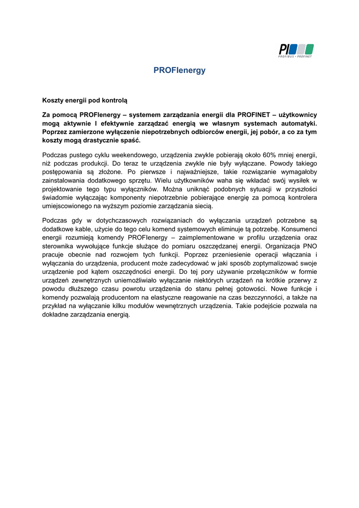 PROFIenergy Koszty energii pod kontrolą Za pomocą PROFIenergy – systemem zarządzania energii dla PROFINET – użytkownicy mogą aktywnie I efektywnie zarządzać energią we własnym systemach automatyki. Poprzez zamierzone wyłączenie niepotrzebnych odbiorców energii, jej pobór, a co za tym koszty mogą drastycznie spaść. Podczas pustego cyklu weekendowego, urządzenia zwykle pobierają około 60% mniej energii, niż podczas produkcji. Do teraz te urządzenia zwykle nie były wyłączane. Powody takiego postępowania są złożone. Po pierwsze i najważniejsze, takie rozwiązanie wymagałoby zainstalowania dodatkowego sprzętu. Wielu użytkowników waha się wkładać swój wysiłek w projektowanie tego typu wyłączników. Można uniknąć podobnych sytuacji w przyszłości świadomie wyłączając komponenty niepotrzebnie pobierające energię za pomocą kontrolera umiejscowionego na wyższym poziomie zarządzania siecią. Podczas gdy w dotychczasowych rozwiązaniach do wyłączania urządzeń potrzebne są dodatkowe kable, użycie do tego celu komend systemowych eliminuje tą potrzebę. Konsumenci energii rozumieją komendy PROFIenergy – zaimplementowane w profilu urządzenia oraz sterownika wywołujące funkcje służące do pomiaru oszczędzanej energii. Organizacja PNO pracuje obecnie nad rozwojem tych funkcji. Poprzez przeniesienie operacji włączania i wyłączania do urządzenia, producent może zadecydować w jaki sposób zoptymalizować swoje urządzenie pod kątem oszczędności energii. Do tej pory używanie przełączników w formie urządzeń zewnętrznych uniemożliwiało wyłączanie niektórych urządzeń na krótkie przerwy z powodu dłuższego czasu powrotu urządzenia do stanu pełnej gotowości. Nowe funkcje i komendy pozwalają producentom na elastyczne reagowanie na czas bezczynności, a także na przykład na wyłączanie kilku modułów wewnętrznych urządzenia. Takie podejście pozwala na dokładne zarządzania energią. Zużycie energii podczas przerw bez i z użyciem PROFIenergy, na podstawie krzywych operacyjnych urządzenia. Zarządzanie energią z PROFIenergy w prawdziwym świecie Ze względu na optymalizację aplikacji działających zgodnie z nowym profilem w rzeczywistych warunkach, w porozumieniu z użytkownikami zostały zdefiniowane poniższe przypadki. Są one podstawą dla reszty profilu PROFIenergy. UC 1: Włączanie i wyłączanie dla krótkich przerw W tym przypadku system selektywnie zatrzymuje urządzenia, np.: podczas przerw obiadowych, i wyłącza tych konsumentów energii, którzy oszczędzają energię podczas krótkich przerw i którzy muszą być szybko powtórne zasileni i gotowi do pracy. Zgodnie z tym adresowane są tylko pojedyncze urządzenia lub ich pojedyncze komponenty. Uruchamiane są podstawowe funkcje oszczędzania energii. Kiedy na powrót rusza proces produkcyjny, system aktywuje konsumentów energii w zdefiniowanej kolejności i sprawdza czy wszystkie urządzenia wystartowały prawidłowo. Jeśli tak, proces produkcyjny jest wznawiany. UC 2: Włączanie i wyłączanie dla długich przerw Ten przypadek jest bardzo podobny do poprzedniego. Z powodu dłuższej przerwy, większa ilość urządzeń i wewnętrznych modułów może być wyłączona UC 3: Włączanie i wyłącznie przy nieplanowanych przerwach W odróżnieniu od poprzednich przypadków tutaj godzina oraz długość przerw nie są znane. Przerwania wywołane awarią sprzętu są typowym przykładem tego typu przerw. Z tego powodu zapotrzebowanie na energię jest redukowane początkowo tak, jak dla krótkich przerw. Jeśli okaże się, że prace naprawcze się przedłużają, istnieje możliwość ustawienia urządzeń w stan, w którym oszczędność energii jest większa. UC 4:Pobieranie danych pomiarowych Dodatkowy przypadek uwzględnia stan pobierania danych pomiarowych. W porównaniu do zwykłych urządzeń pomiarowych, tutaj pewna liczba urządzeń jest zgrupowana w jedno, które mierzy bezwzględną wartość pobieranej energii. Typowym przykładem są tutaj przetworniki częstotliwości. Te cztery przypadki są podstawą do tworzenia dalszych aplikacji. Dla przykładu PROFIenergy pozwala na pracę systemów przy znacznych obciążeniach, jak i unikanie obciążeń szczytowych. Prostota obsługi Obsługa nie mogła być prostsza. Użytkownik przesyła do urządzenia komendę zawierającą dane z długością przerwy. Urządzenie podrzędne decyduje następnie autonomicznie, które z bloków wewnętrznych mogą zostać wyłączone, aby utrzymać status gotowości kiedy czas ten dobiegnie końca. Nie ma różnicy czy jest to proste urządzenie, jak napęd, czy bardziej skomplikowane. Aby przywrócić urządzenie z powrotem do stanu gotowości użytkownik musi jedynie wysłać komendę włączającą. Urządzenie jest podnoszone do stanu gotowości w sposób zgodny z całością aplikacji. Urządzenia dostarczają użytkownikowi dane na temat swojego czasu powrotu do stanu gotowości, aby możliwe było skoordynowanie startu urządzeń z różnymi czasami wstawania. Użytkownik w takim przypadku może obliczyć czasy podawane w komendzie włączającej. Z PROFIenergy przewody do komunikacji cyfrowej z zewnętrznymi przekaźnikami nie są potrzebne, aby wyłączać pojedyncze urządzenia. Zapotrzebowanie na prostotę obsługi jako główny czynnik przyciągający większą ilość użytkowników jest tu spełnione. Włożony wysiłek inżynierski jest zminimalizowany. Użytkownik musi zaimplementować tylko dwie komendy w swoim programie. W ten sposób można w prosty sposób oddzielić aktualną logikę procesową od zarządzania energią. Producenci urządzeń i systemów mogą także wspierać użytkowników poprzez rozwój odpowiednich modułów, np. dodając mechanizmy komunikacji. Biorąc pod uwagę żądania użytkowników dotyczące podniesienia wersji oraz kompatybilności, omawiane komendy będą mapowane w dotychczasowych, przetestowanyc