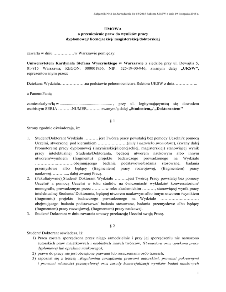 Załącznik Nr 2 do Zarządzenia Nr 58/2015 Rektora UKSW z dnia 19 listopada 2015 r. UMOWA o przeniesienie praw do wyników pracy dyplomowej/ licencjackiej/ magisterskiej/doktorskiej zawarta w dniu ……………w Warszawie pomiędzy: Uniwersytetem Kardynała Stefana Wyszyńskiego w Warszawie z siedzibą przy ul. Dewajtis 5, 01-815 Warszawa; REGON: 000001956, NIP: 525-19-00-946, zwanym dalej „UKSW", reprezentowanym przez: Dziekana Wydziału………………na podstawie pełnomocnictwa Rektora UKSW z dnia…………….. a Panem/Panią zamieszkałym/łą w .................................................. , przy ul. legitymującym/cą się dowodem osobistym SERIA ……….NUMER………. zwanym/ą dalej „Studentem„/ „Doktorantem’’ §1 Strony zgodnie oświadczają, iż: 1. 2. 3. Student/Doktorant Wydziału ………. jest Twórcą pracy powstałej bez pomocy Uczelni/z pomocą Uczelni, stworzonej pod kierunkiem …………………(imię i nazwisko promotora), (zwany dalej Promotorem) pracy dyplomowej (inżynierskiej/licencjackiej, magisterskiej) stanowiącej wynik pracy intelektualnej Studenta/Doktoranta, będącej utworem naukowym albo innym utworem/wynikiem (fragmentu) projektu badawczego prowadzonego na Wydziale …………….…………obejmującego badania podstawowe/badania stosowane, badania przemysłowe albo będący (fragmentem) pracy rozwojowej, (fragmentem) pracy naukowej………...., dalej zwanej Pracą. (Fakultatywnie) Student/ Doktorant Wydziału ……….jest Twórcą Pracy powstałej bez pomocy Uczelni/ z pomocą Uczelni w toku studiów na ćwiczeniach/ wykładzie/ konwersatorium/ monografie, prowadzonym przez ……….w roku akademickim ………, stanowiącej wynik pracy intelektualnej Studenta/ Doktoranta, będącej utworem naukowym albo innym utworem /wynikiem (fragmentu) projektu badawczego prowadzonego na Wydziale …………….………… obejmującego badania podstawowe/ badania stosowane, badania przemysłowe albo będący (fragmentem) pracy rozwojowej, (fragmentem) pracy naukowej. Student/ Doktorant w dniu zawarcia umowy przekazuję Uczelni swoją Pracę. §2 Student/ Doktorant oświadcza, iż: 1) Praca została sporządzona przez niego samodzielnie i przy jej sporządzeniu nie naruszono autorskich praw majątkowych i osobistych innych twórców, (Promotora oraz opiekuna pracy dyplomowej lub opiekuna naukowego); 2) prawo do pracy nie jest obciążone prawami lub roszczeniami osób trzecich; 3) zapoznał się z treścią „Regulaminu zarządzania prawami autorskimi, prawami pokrewnymi i prawami własności przemysłowej oraz zasady komercjalizacji wyników badań naukowych 1 Załącznik Nr 2 do Zarządzenia Nr 58/2015 Rektora UKSW z dnia 19 listopada 2015 r. i prac rozwojowych w Uniwersytecie Kardynała Stefana Wyszyńskiego w Warszawie " , zwanego dalej „Regulaminem', a w tym postanowień § 14 ust. 2-4 i zobowiązuje się do przestrzegania Regulaminu. §3 Jeżeli złożone przez Studenta /Doktoranta oświadczenie o którym mowa w § 2 umowy, nie jest zgodne z rzeczywistością, jak również w przypadku naruszenia zobowiązania zawartego w tym postanowieniu, Student/ Doktorant zobowiązuje się do naprawienia wszelkich szkód, poniesionych w związku z tym przez Uczelnię lub osoby trzecie. §4 1. Student/ Doktorant przenosi na Uczelnię autorskie prawa majątkowe do pracy z chwilą jej przekazania oraz wyraża zgodę na rozporządzanie i korzystanie z prawa zależnego do opracowań pracy bez dodatkowego wynagrodzenia. 2. Przeniesienie autorskich praw majątkowych do pracy obejmuje następujące pola eksploatacji: utrwalanie, zwielokrotnianie dowolną techniką, wprowadzanie do obrotu (w tym użyczanie, najem, dzierżawa) oryginału albo egzemplarzy, na których utrwalono wyniki bez ograniczeń ilościowych, przedmiotowych i terytorialnych, ani ze względu na krąg odbiorców, przygotowanie pracy na swoje potrzeby, w szczególności do obróbki redakcyjnej i komputerowej, prowadzanie do pamięci komputera, wystawianie, wyświetlanie, odtwarzanie i wykonywanie publiczne (w tym udostępnianie on-line w bibliotece cyfrowej/sieci wewnętrznej, najem, dzierżawa, lub udzielanie licencji na wykorzystywanie), udostępnianie pracy w taki sposób, aby pojedyncze osoby miały do niej dostęp w różnych miejscach i w różnym, wybranym przez siebie, czasie, włączenie pracy, jej fragmentu lub fragmentów do publikacji zbiorowej, wykorzystywanie pracy we wszelkich formach promocji i reklamy. Uczelni przysługuje wyłączne prawo zezwalania na wykonywanie zależnych praw autorskich w odniesieniu do pracy. 3. Postanowienia ust. 1-2 stosuje się odpowiednio do części Pracy. 4. Z tytułu przeniesienia autorskich praw majątkowych, o których mowa w niniejszym paragrafie, Studentowi/Doktorantowi nie przysługuje wynagrodzenie, z zastrzeżeniem § 6 niniejszej umowy. 5. Prawo do nadzoru nad sposobem korzystania z utworu Student/ Doktorant może realizować po uprzednim uzgodnieniu formy korzystania z Pracy z kierownikiem jednostki naukowej, w której Praca została wykonana. §5 1. Student/Doktorant przenosi na rzecz Uczelni prawo do projektów wynalazczych i rozwiązań innowacyjnych, powstałych w związku z wykonywaniem …………………………. . 2. Z tytułu przeniesienia praw, o których mowa w niniejszym paragrafie, Studentowi/ Doktorantowi nie przysługuje wynagrodzenie, z zastrzeżeniem § 6 niniejszej umowy. 3. Studentowi/ Doktorantowi służy prawo do uznania go za twórcę lub współtwórcę zawartych w pracy projektów wynalazczych i rozwiązań innowacyjnych, w przypadku ich zgłoszenia do Urzędu Patentowego RP, zwany dalej „UPRP", w celu objęcia prawami ochronnymi oraz wyrażenia przez UKSW na to zgody w trybie, określonym w § 15 Regulaminu. 4. Zgłoszenie, o którym mowa w ust. 3, powinno nastąpić na druku, stanowiącym załącznik do Regulaminu, w celu rozpoczęcia procedury zgłoszeniowej przez CENTIR. Wszelkie inf