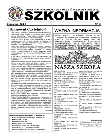 SZKOLNIK BIULETYN INFORMACYJNY UCZNIÓ W SZKO ŁY POLSKIEJ C ZERWIEC 2 0 1 2 N° 2 Szanowni Czytelnicy! Rok Szkolny 2011/2012 przyśpieszył i nabrał rozpędu jak lokomotywa Juliana Tuwima by dotrzeć do celu – wyczekiwanego odpoczynku ! Nasza Szkoła bogatsza o następny rok zamyka swoje drzwi na 2 miesiące wakacji. Dzieci otrzymują od nauczycieli świadectwa, w których zostaje oceniony cały rok pracy. Niektóre są celujące, inne troszkę słabsze ale najważniejsze,że wszyscy uczniowie są promowani do następnej klasy! Tradycyjnie Komitet Rodzicielski zafundował wszystkim uczniom polskie książki, by podkreślić uroczystość i wynagrodzić cotygodniowy wysiłek wkładany w przyjazd ,czasem z bardzo daleka, na te przecież dodatkowe zajęcia w szkole polskiej i tym samym zaprosić do lektury w języku ojczystym. W tym roku 43 uczniów klas VI ukończyło podstawowy cykl nauczania. Mamy nadzieję,że powrócą do nas już jako Gimnazjaliści.!!! Szczególnie żegnamy naszych najstarszych Gimnazjalistów, których w tym roku było w III klasie 9 -cioro i życzymy samych sukcesów na kolejnych szczeblach edukacji. Księdzu Proboszczowi, Księdzu Piotrowi,wszystkim Nauczycielom , oraz Naszej Pani Sekretarce, podziękowania za ten pracowity rok . Niech odpoczną w ciszy od szkolnej wrzawy i zgiełku a kiedy już zatęsknią niech wracają do szkoły! Duże podziękowania dla wszystkich Rodziców a szczególnie dla tych, którzy tak chętnie pomagali i tworzyli duszę tej szkoły. By szkoła nie tylko była nauka ale też i takim czasem, który pozwoli dzieciom, które nie zawsze rozumieją jeszcze jej sens , przeżyć kolejny rok zachowując miłe wspomnienia. Ale przede wszystkim wszystkim dzieciom życzymy wesołych , słonecznych i bezpiecznych wakacji oraz miłego wypoczynku . Niech każdy dzień wakacyjnych przygód pozostanie w Waszej pamięci jako dzień, o którym można powiedzieć, że to był dobry dzień. Odpoczywajcie, nabierajcie sił i „ładujcie akumulatory”. Wielu z Was będzie mieć możliwość poznawania najpiękniejszych zakątków naszej Ojczyzny. Wędrówki szlakami górskimi, jeziora, morze – pozostaną na zawsze najpiękniejszymi wspomnieniami z dzieciństwa. Odwiedzicie rodzinne strony, najbliższe sercu okolice, spotkacie bliskich i przyjaciół. Kochani uczniowie opowiadajcie im o polskiej szkole, bo to jest Wasza szkoła i istnieje tylko dla Was i dzięki Wam! I nie zapomnijcie o pocztówkach dla Księdza Proboszcza! Zawsze czeka na nie i z radością o nich mówi! Redakcja Podsumowanie wydarzeń II semestru: Uroczyste imieniny Naszego Proboszcza Akademia 3 maja Pierwsze komunie Pielgrzymka do Lourdes Wycieczka klas 6 do Futuroscopu Wycieczka kl II na Père Lachaise Wycieczki szkolne do THOIRY i St Denis WAŻNA INFORMACJA NASZĄ GAZETKĘ , W KOLORZE, MOŻNA BĘDZIE OGLĄDNĄĆ NA STRONIE INTERNETOWEJ PARAFII W RUBRYCE „SZKOŁA POLSKA” BĘDĄ TAM TEŻ ZAMIESZCZONE INFORMACJE DOTYCZĄCE PODRECZNIKÓW ORAZ DOKŁADNY PLAN ROZPOCZĘCIA NOWEGO ROKU SZKOLNEGO KTÓRY WYZNACZONY ZOSTAŁ NA SOBOTĘ 1 WRZEŚNIA. NASZA SZKOŁA Mija dzień, rok, Do Szkoły przy Parafii Świętej Genowefy chodzimy wciąż. Niektórzy mówią, że tu jest źle, Lecz oni z pewnością mylą się! Szkoła nasza to jest to! Nie ma tu wstępu żadne zło! Bo każdy z nas Mile tu spędza czas! Pani od polskiego bardzo miła jest, I z cierpliwością nam przygląda się, Bo chociaż niekiedy znieść nas nie da się, To ona z nami zawsze porozmawiać chce. Są tu również nasi księżą : Józef i Piotr Dlatego nie ma tu wstępu żaden łotr Uczą pokory i dobroci Przy Pana Jezusa pomocy. A nasi drodzy nauczyciele Pomagają im w tym nawet i w niedziele. Uczą nas pilnie i stawiają oceny, A my czasami się z nimi nie zgadzamy! Wiele razy prac domowych robić zapominamy. Wiemy, że karę od nich otrzymamy. Lecz oni czasami przymykają na nasze przewinienia oczy, Co sprawia, że każdy uczeń z uśmiechem do szkoły kroczy. Atmosfera w naszej szkole jest życzliwa dla każdego, Nawet dla tego, który humoru nie ma dobrego. I chociaż ciężko pracować nad lekcjami trzeba To i tak każdy uczeń dobrze się tu miewa. Już niedługo stąd odejdziemy, Inne nauki studiować będziemy. Na pewno o niej nie zapomnimy. I pewnie nieraz za nią zatęsknimy. W naszej szkole przyjemnie jest, O wielu smutkach w tych murach zapomina się. Dni spędzine w szkole tej, Zawsze zostaną w głowie mej! /Diana Budnik II Gimnazjum, 30 marca 2012 Pierwsze miejsce w konkursie literackim Nasza Szkoła./ S TR 2 S ZKO LNIK N° 2 NASZ PROBOSZCZ Dzień imienin... Dzieci bardzo lubią Naszego Księdza Proboszcza. Dlatego w Dzień Jego Imienin chcieliśmy mu szczególnie podziękować za to, że pozwala co tydzień ponad 450 – ciu dzieciom biegać po swoim podwórku. A dzieci jak to dzieci, nie zawsze potrafią to uszanować. Proboszcz to wszystko znosi i nawet czasem się chyba cieszy, że ma tylu urwisów pod swoim patronatem. Bo tak naprawdę to On jest Patronem naszej szkoły. Takim cichym, codziennym, ale bardzo uważnym. To On najbardziej modli się za wszystkich uczniów i zaprasza ich do kościoła. Zna imiona chyba wszystkich dzieci. Zawsze porozmawia, pogłaska po głowie, da cukierka ale tez i skarci jeśli trzeba. Wychowuje te swoje dziatki tak, by wyrosły na mądrych Polaków i błogosławi im, by wyrastały na dobrych ludzi. Dzieci obu grup przygotowały dla Ksiedza życzenia imieninowe. W środę Pani Zosia ze swoimi klasami przygotowała mini spektakl „7 opowieści o Józefie”by uczcić to święto. W sobotę dzieci na kolorowych serduszkach złożyły życzenia w formie wierszyków. Oczywiście nie zapomnieliśmy o kwiatach, które tak Proboszcz kocha i małym prezencie od szkoły, Świątku do przyszłej kapliczki. Korzystając ze sposobności chcielibyśmy serdecznie pogratulować nominacji z okazji otrzymania przez Księdza Proboszcza tytułu Prałata Cała szkoła cieszy się i z