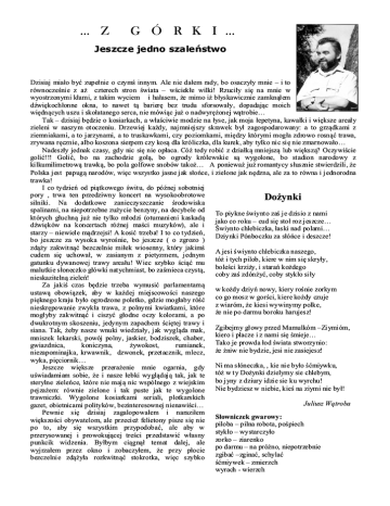 … Z G Ó R K I … Jeszcze jedno szaleństwo Dzisiaj miało być zupełnie o czymś innym. Ale nie dałem rady, bo osaczyły mnie – i to równocześnie z aż czterech stron świata – wściekłe wilki! Rzuciły się na mnie w wyostrzonymi kłami, z takim wyciem i hałasem, że mimo iż błyskawicznie zamknąłem dźwiękochłonne okna, to nawet tą barierę bez trudu sforsowały, dopadając moich więdnących uszu i skołatanego serca, nie mówiąc już o nadwyrężonej wątrobie… Tak – dzisiaj będzie o kosiarkach, a właściwie modzie na łyse, jak moja łepetyna, kawałki i większe areały zieleni w naszym otoczeniu. Drzewiej każdy, najmniejszy skrawek był zagospodarowany: a to grządkami z ziemniakami, a to jarzynami, a to truskawkami, czy poziomkami, między którymi mogła zdrowo rosnąć trawa, zrywana ręcznie, albo koszona sierpem czy kosą dla króliczka, dla kurek, aby tylko nic się nie zmarnowało… Nadeszły jednak czasy, gdy nic się nie opłaca. Cóż tedy robić z działką mniejszą lub większą? Oczywiście golić!!! Golić, bo na zachodzie golą, bo ogrody królewskie są wygolone, bo stadion narodowy z kilkumilimetrową trawką, bo pola golfowe snobów takoż… A ponieważ już romantycy słusznie stwierdzili, że Polska jest papugą narodów, więc wszystko jasne jak słońce, i zielone jak nędzna, ale za to równa i jednorodna trawka! I co tydzień od piątkowego świtu, do późnej sobotniej pory , trwa ten przedziwny koncert na wysokoobrotowe Dożynki silniki. Na dodatkowe zanieczyszczanie środowiska spalinami, na niepotrzebne zużycie benzyny, na decybele od To piykne świynto zaś je dzisio z nami których głuchną już nie tylko młodzi (otumanieni kaskadą jako co roku – cud się stoł roz jeszcze… dźwięków na koncertach różnej maści muzyków), ale i Świynto chlebiczka, łaski nad polami… starzy – niewiele mądrzejsi! A kosić trzeba! I to co tydzień, Dziynki Pónboczku za słóńce i deszcze! bo jeszcze za wysoka wyrośnie, bo jeszcze ( o zgrozo ) zdąży zakwitnąć bezczelnie miłek wiosenny, który jakimś A jesi świynto chlebiczka naszego, cudem się uchował, w zasianym z pietyzmem, jednym tóż i tych pilob, kiere w nim się skryły, gatunku dywanowej trawy areału! Wiec szybko ściąć mu malutkie słoneczko główki natychmiast, bo zaśmieca czystą, boleści krziży, i starań kożdego coby zaś zdónżyć, coby stykło siły nieskazitelną zieleń! Za jakiś czas będzie trzeba wymusić parlamentarną w kożdy dziyń nowy, kiery rośnie zorkym ustawą obowiązek, aby w każdej miejscowości naszego pięknego kraju było ogrodzone poletko, gdzie mogłaby róść co go mosz w gorści, kiere kożdy czuje nieskrępowanie zwykła trawa, z polnymi kwiatkami, które z wiaróm, że kiesi wywinymy polke, mogłyby zakwitnąć i ciszyć głodne oczy kolorami, a po że nie po darmu boroku harujesz! dwukrotnym skoszeniu, jedynym zapachem ściętej trawy i siana. Tak, żeby nasze wnuki wiedziały, jak wygląda mak, Zgibejmy głowy przed Mamulkóm –Ziymióm, mniszek lekarski, powój polny, jaskier, bodziszek, chaber, kiero i płacze i z nami się śmieje… gwiazdnica, koniczyna, żywokost, rumianek, Tako je prowda łod świata stworzynio: niezapominajka, krwawnik, dzwonek, przetacznik, mlecz, że żniw nie bydzie, jesi nie zasiejesz! wyka, pięciornik… Jeszcze większe przerażenie mnie ogarnia, gdy Ni ma słóneczka, , kie nie było śćmiywku, uświadamiam sobie, że i nasze łebki wyglądają tak, jak te tóż w ty Dożynki dzielymy sie chlebym, sterylne zieleńce, które nie mają nic wspólnego z wiejskim bo jyny z dziury idzie sie ku wyrchu! pejzażem: równie zielone i tak puste jak te wygolone Nie bydziesz w niebie, kieś na ziymi nie był! trawniczki. Wygolone kosiarkami seriali, plotkarskich Juliusz Wątroba gazet, obietnicami polityków, bezinteresownej nienawiści… Pewnie się dzisiaj zagalopowałem i naraziłem Słowniczek gwarowy: większości obywatelom, ale przecież felietony pisze się nie piloba – pilna robota, pośpiech po to, aby się wszystkim przypodobać, ale aby w stykło – wystarczyło przerysowanej i prowokującej treści przedstawić własny punkcik widzenia. Byłbym ciągnął temat dalej, ale zorko – ziarenko po darmu – na próżno, niepotrzebnie wyjrzałem przez okno i zobaczyłem, że przy płocie bezczelnie zdążyła rozkwitnąć stokrotka, więc szybko zgibać –zginać, schylać śćmiywek – zmierzch wyrach - wierzch