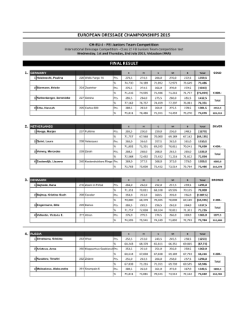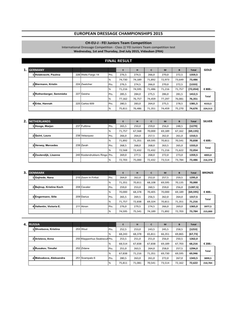 EUROPEAN DRESSAGE CHAMPIONSHIPS 2015 CH-‐EU-‐J -‐ FEI Juniors Team Competition International Dressage Competition -‐ Class 2/ FEI Juniors Team competition test Wednesday, 1st and Thursday, 2nd July 2015, Vidauban (FRA) FINAL RESULT 1. GERMANY 1 Holzknecht, Paulina 2 Biermann, Kristin 3 Rothenberger, Semmieke 4 Erbe, Hannah 226 Wells Fargo 14 224 Zwetcher 227 Geisha 225 Carlos 609 E H C M B Total Pts. 276,5 274,5 266,0 270,0 272,5 1359,5 % 74,730 74,189 71,892 72,973 73,649 73,486 Pts. 276,5 274,5 266,0 270,0 272,5 [1333] % 71,216 74,595 71,486 71,216 71,757 [72,054] Pts. 285,5 284,0 275,5 286,0 281,5 1412,5 % 77,162 76,757 74,459 77,297 76,081 76,351 2 Quint, Laura 3 Verwey, Mercedes 4 Zoutendijk, Lisanne 237 Fulltime 238 Velazquez 239 Zarah 280,5 283,0 264,0 275,5 278,5 1381,5 4153,5 75,811 76,486 71,351 74,459 75,270 74,676 224,513 E H C M B Total SILVER Pts. 265,5 250,0 259,0 256,0 248,5 [1279] % 71,757 67,568 70,000 69,189 67,162 [69,135] Pts. 266,0 264,0 257,5 262,0 261,0 1310,5 % 71,892 71,351 69,595 70,811 70,541 70,838 Pts. 268,5 268,0 268,0 263,5 265,0 1333,0 % 72,568 72,432 72,432 71,216 71,622 72,054 240 Kostendrukkers Ringo Star Pts. 2 Bejtrup, Kristine Koch 3 Engermann, Sille 4 Vallentin, Victoria E. 210 Zoom In Firfod 208 Cavaler 209 Darius 211 Atnon 269,0 277,5 268,0 272,0 273,0 1359,5 4003,0 75,000 72,432 73,514 73,784 73,486 216,378 E H C M B Total BRONZE Pts. 264,0 262,0 252,0 257,5 259,5 1295,0 % 71,351 70,811 68,108 69,595 70,135 70,000 Pts. 259,0 253,0 260,5 259,0 256,0 [1287,5] % 70,000 68,378 70,405 70,000 69,189 [69,595] Pts. 265,5 269,5 256,5 262,0 264,0 1317,5 % 71,757 72,838 69,324 70,811 71,351 71,216 Total 276,0 279,5 274,5 266,0 269,0 1365,0 3977,5 % 74,595 75,541 74,189 71,892 72,703 73,784 215,000 E H C M B Total Pts. 252,5 253,0 243,5 245,5 258,5 [1253] % 68,243 68,378 65,811 66,351 69,865 [67,73] 253,5 251,0 251,0 256,0 250,5 1262,0 68,514 67,838 67,838 69,189 67,703 68,216 2 Aristova, Anna 250 Kleppenhus Seabiscuit Pts. % 251 Scampalo 6 € 400.-‐ Pts. 253 Wout 4 Maksakova, Aleksandra Total 72,703 1 Shvetsova, Kristina 252 Zidane € 600.-‐ % 4. RUSSIA 3 Rusakov, Timofei Total % 3. DENMARK 1 Gajhede, Nana € 800.-‐ Pts. 2. NETHERLANDS 1 Hooge, Marjan GOLD Pts. 251,0 263,5 264,0 258,0 257,5 1294,0 % 67,838 71,216 71,351 69,730 69,595 69,946 € 200.-‐ Total Pts. 280,5 263,0 261,0 272,0 267,0 1343,5 3899,5 % 75,811 71,081 70,541 73,514 72,162 72,622 210,784 5. ITALY 1 Coperchio, Ginevra 2 Campanella, Alice 3 Berni, Lucia 4 Remold, Valentina E 234 Hilltop Don Rodrigo 233 Varisto 232 Ebony 235 Broadway 256 Darek CH 2 Guerra, Léonie 255 Mocca IV 3 Krattiger, Elena 257 Ramia Lox 4 Winnewisser, Naomi 258 Fuerst Rousseau 204 Dark Chocolate 2 Wiggins, Kate 206 Corona 3 Arl, Antonia 203 Equestricons Ziggy 4 Verberne, Numa 205 Riverdance 220 Labiat 2 Dicker, Charlotte 221 Sabatini 3 Vell, Chloe Grace 222 Kaja Di Valentina 4 Williams, Erin 223 Bolsan B B Total 250,5 257,5 244,0 247,5 252,5 [1252] 67,703 69,595 65,946 66,892 68,243 [67,676] Pts. 254,0 252,5 254,5 256,5 251,5 1269,0 % 68,649 68,243 68,784 69,324 67,973 68,595 Pts. 256,5 253,0 256,0 259,0 260,5 1285,0 % 69,324 68,378 69,189 70,000 70,405 69,459 Pts. 258,5 269,5 262,5 254,5 259,5 1304,5 3858,5 % 69,865 72,838 70,946 68,784 70,135 70,514 208,568 E H C M B Total € 160.-‐ Total Pts. 250,0 254,5 243,0 244,5 244,5 [1236,5] % 67,568 68,784 65,676 66,081 66,081 [66,838] Pts. 254,5 255,5 248,0 256,5 260,0 1274,5 % 68,784 69,054 67,027 69,324 70,270 68,892 Pts. 253,5 247,5 253,5 261,0 253,0 1268,5 % 68,514 66,892 68,514 70,541 68,378 68,568 Pts. 255,0 268,5 255,0 263,0 261,0 1302,5 3845,5 % 68,919 72,568 68,919 71,081 70,541 70,405 207,865 E H C M B Total € 140.-‐ Total Pts. 255,0 244,0 245,5 250,5 251,5 [1246,5] % 68,919 65,946 66,351 67,703 67,973 [67,378] Pts. 252,5 252,0 252,0 249,5 254,0 1260,0 % 68,243 68,108 68,108 67,432 68,649 68,108 Pts. 253,0 253,5 252,5 256,0 253,0 1268,0 % 68,378 68,514 68,243 69,189 68,378 68,541 Pts. 266,0 253,5 257,5 256,0 260,5 1293,5 3821,5 % 71,892 68,514 69,595 69,189 70,405 69,919 206,568 E H C M B Total 1255,0 8. GREAT BRITAIN 1 Barton, Amber M % 7. BELGIUM 1 Luyten, Laura C Pts. 6. SWITZERLAND 1 Hartmann, Stephanie H € 100.-‐ Total Pts. 247,0 258,5 249,0 248,5 252,0 % 66,757 69,865 67,297 67,162 68,108 67,838 Pts. 233,5 222,5 239,0 246,5 240,0 [1181,5] % 63,108 60,135 64,595 66,622 64,865 [63,865] Pts. 253,0 247,5 246,0 250,0 255,5 1252,0 % 68,378 66,892 66,486 67,568 69,054 67,676 Pts. 264,0 261,5 255,0 251,5 256,0 1288,0 3795,0 % 71,351 70,676 68,919 67,973 69,189 69,622 205,136 € 100.-‐ Total 9. FRANCE 1 Charrier, Charlotte 216 Rendez Vous 2 Portejoie, Lana 218 Zocraat 3 Chevanne, Hanna 217 Wineyard 4 Portejoie, Mathis 219 Artisto W E H C M B Total Pts. 254,5 255,0 248,0 251,0 242,0 1250,5 % 68,784 68,919 67,027 67,838 65,405 67,595 Pts. 245,5 240,5 237,0 242,5 236,5 [1202] % 66,351 65,000 64,054 65,541 63,919 [64,973] Pts. 251,0 258,0 244,0 248,5 247,5 1249,0 % 67,838 69,730 65,946 67,162 66,892 67,514 Pts. 258,5 256,5 251,0 260,5 261,5 1288,0 3787,5 % 69,865 69,324 67,838 70,405 70,676 69,622 204,731 E H C M B Total Pts. 242,5 230,0 235,5 249,0 238,0 1195,0 % 65,541 62,162 63,649 67,297 64,324 64,595 10. SPAIN 1 Comas Margarit, Anna 212 Fuerstenau 2 Ramírez Benítez, Alfonso Jesús 215 Delhi 3 Comas Margarit, Roger 213 Fidergold Pts. 251,0 253,5 249,0 244,5 252,5 1250,5 % 67,838 68,514 67,297 66,081 68,243 67,595 Pts. -‐ % 4 Matute Guimon, Juan 214 Dhannie Ymas 261 Pay Back TP 2 Jönsson, Lina 263 Barreiro 3 Ivarsson, Beatrice 4 Andersson, Sofie 262 Charles 260 Donna Samba NDS 229 Leopold 2 Gálfi, Antónia 228 Wardanda 3 Pachl, Gergely 4 Szoke Tóth, Berill 230 Whispering Beauty 231 Evita Total 272,5 266,5 267,0 263,5 272,0 1341,5 3787,0 % 73,649 72,027 72,162 71,216 73,514 72,514 204,704 E H C M B Total Pts. 246,5 257,5 248,0 249,0 256,0 1257,0 % 66,622 69,595 67,027 67,297 69,189 67,946 Pts. 245,5 243,0 245,5 251,5 244,5 1230,0