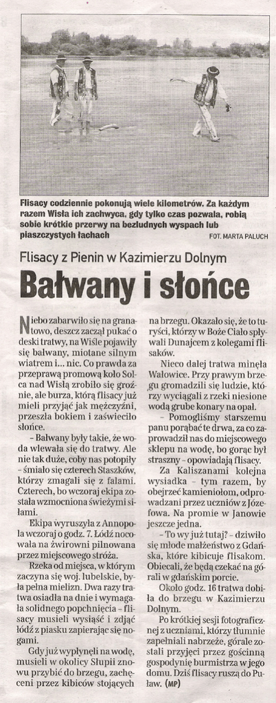 Flisacy codziennie pokonuja wi,ele kilometrów. Za kazdym razem Wisla ich zachwyca, gdy tylko czas pozwala, robia sobie"krótkie przerwy na bezludnych wyspach lub piaszcZY$tychlachach FOT.MARTAPALUCH Flisacyz Pieninw,Kazimierzu Dolnym BalWanyi slonce iebo zabarwilo sie na granazaczal pukac o deski tratWy, na Wisle pojawily N towo, deszcz - n<;1brzegu. Okazalo sie, ze to turysCi, którzy w Boze Cialo sply~ wali Dunajcem z kolegamiili- . sie balwany, miotane silnym saków. wiatrem i... nic. Coprawda za Nieco dalej tratwa mInela przeprawa promqwa kolo Sol- Walowice. Przy prawym brze, ca nad Wisla zrobilo sie groz- ,gu gromadzili sie ludzie, któnie, ale burza, która Uisacyjuz ,rzy wyciagali z rzeki niesione mieli przyjac jak mezczyzni, woda grube konary na, opal. ' przeszla bokiem i zaswiecilo - Pomoglismy starszemu , slonce. ' - - Balwany byly takie, ze woda wlewala sie do tratwy. Ale nie tak duze, coby nas potopily - smialo sie <;zterech Staszków, panu porabac tedtwa, za co zaprowadzil nas do miejscowego sklepu na wode, bo gorac byl stra~zny opowiadaja flisacy. ~ ZaKaliszanami kolejna którzy zmagali sie z falami. wysiadka - tym razem, by Czterech, bo w;czorajekipa zo- obejrzec kamieniolom, odprostalawzmocniona swiezymi si- wadzani przez uczniów z Józe-lami. fowa. Na promie w Janowie Ekipa~usz,ylazAnnopojeszcze jedna. la wczoraj o godz.'7.,Lódz noco- Towyjuztutaj? - dziwilo wala na zwiro"Yllipilnowana sie mlode malzenstwo z Gdan~ przez miejscowego stróza. ska, które kibicuje flisakom. '"Rzeka,odmiejsca,w Którym Obiecali! ze beda czekac na gózaczyna sie woj.hibelskie, by- nm~Wigdanski:m porcie. ~lapelna mielizn. Dwa r:az,ytraOkolo godz. 16 tratwa'llobitwa osiadla na dnie i wymaga- la do brzegu w Kazimierzu la solidnego popchniecia", fli- Dplnym. sacy musieli wysiasc i zdjac Po krótkiej sesji fotograficzlódz z piasku zapier<ijacsie no- nej z uczniami, którzy tlumnie ~ gami. .zapelniali nabrzeze, górale zoGdyjuz wyplyneli na wode, stali przyjeci przez goscinna musieli w okolicy Slupii'zno- gospodynie burmistrza w jego wuprzybic do brzegu, zache- domu. Dzis flisacy rusza do Puceni-przez kibicgw ~stojacych law. (MP)