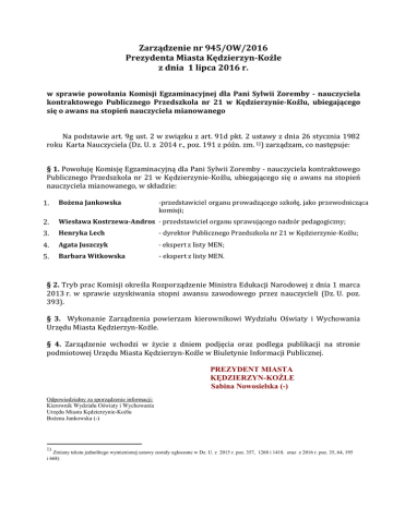 Zarządzenie nr 945/OW/2016 Prezydenta Miasta Kędzierzyn-Koźle z dnia 1 lipca 2016 r. w sprawie powołania Komisji Egzaminacyjnej dla Pani Sylwii Zoremby - nauczyciela kontraktowego Publicznego Przedszkola nr 21 w Kędzierzynie-Koźlu, ubiegającego się o awans na stopień nauczyciela mianowanego Na podstawie art. 9g ust. 2 w związku z art. 91d pkt. 2 ustawy z dnia 26 stycznia 1982 roku Karta Nauczyciela (Dz. U. z 2014 r., poz. 191 z późn. zm. 1)) zarządzam, co następuje: § 1. Powołuję Komisję Egzaminacyjną dla Pani Sylwii Zoremby - nauczyciela kontraktowego Publicznego Przedszkola nr 21 w Kędzierzynie-Koźlu, ubiegającego się o awans na stopień nauczyciela mianowanego, w składzie: 1. Bożena Jankowska 2. Wiesława Kostrzewa-Andros - przedstawiciel organu sprawującego nadzór pedagogiczny; 3. Henryka Lech - dyrektor Publicznego Przedszkola nr 21 w Kędzierzynie-Koźlu; 4. Agata Juszczyk - ekspert z listy MEN; 5. Barbara Witkowska - ekspert z listy MEN. -przedstawiciel organu prowadzącego szkołę, jako przewodnicząca komisji; § 2. Tryb prac Komisji określa Rozporządzenie Ministra Edukacji Narodowej z dnia 1 marca 2013 r. w sprawie uzyskiwania stopni awansu zawodowego przez nauczycieli (Dz. U. poz. 393). § 3. Wykonanie Zarządzenia powierzam kierownikowi Wydziału Oświaty i Wychowania Urzędu Miasta Kędzierzyn-Koźle. § 4. Zarządzenie wchodzi w życie z dniem podjęcia oraz podlega publikacji na stronie podmiotowej Urzędu Miasta Kędzierzyn-Koźle w Biuletynie Informacji Publicznej. PREZYDENT MIASTA KĘDZIERZYN-KOŹLE Sabina Nowosielska (-) Odpowiedzialny za sporządzenie informacji: Kierownik Wydziału Oświaty i Wychowania Urzędu Miasta Kędzierzynie-Koźlu Bożena Jankowska (-) 1) Zmiany tekstu jednolitego wymienionej ustawy zostały ogłoszone w Dz. U. z 2015 r. poz. 357, 1268 i 1418. oraz z 2016 r. poz. 35, 64, 195 i 668)