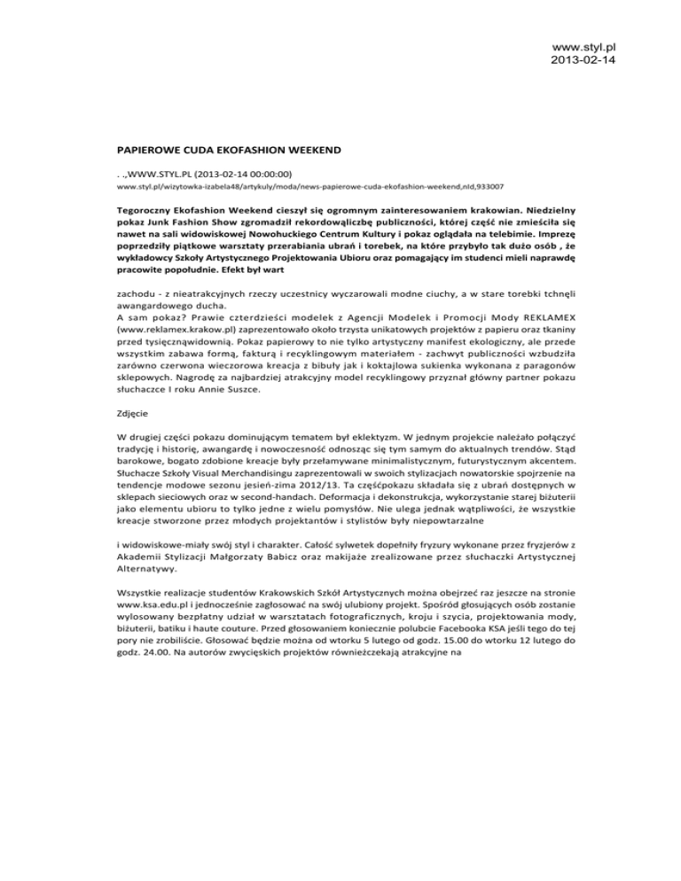 www.styl.pl 2013-02-14 PAPIEROWE CUDA EKOFASHION WEEKEND . .,WWW.STYL.PL (2013-02-14 00:00:00) www.styl.pl/wizytowka-izabela48/artykuly/moda/news-papierowe-cuda-ekofashion-weekend,nId,933007 Tegoroczny Ekofashion Weekend cieszył się ogromnym zainteresowaniem krakowian. Niedzielny pokaz Junk Fashion Show zgromadził rekordowąliczbę publiczności, której część nie zmieściła się nawet na sali widowiskowej Nowohuckiego Centrum Kultury i pokaz oglądała na telebimie. Imprezę poprzedziły piątkowe warsztaty przerabiania ubrań i torebek, na które przybyło tak dużo osób , że wykładowcy Szkoły Artystycznego Projektowania Ubioru oraz pomagający im studenci mieli naprawdę pracowite popołudnie. Efekt był wart zachodu - z nieatrakcyjnych rzeczy uczestnicy wyczarowali modne ciuchy, a w stare torebki tchnęli awangardowego ducha. A sam pokaz? Prawie czterdzieści modelek z Agencji Modelek i Promocji Mody REKLAMEX (www.reklamex.krakow.pl) zaprezentowało około trzysta unikatowych projektów z papieru oraz tkaniny przed tysięcznąwidownią. Pokaz papierowy to nie tylko artystyczny manifest ekologiczny, ale przede wszystkim zabawa formą, fakturą i recyklingowym materiałem - zachwyt publiczności wzbudziła zarówno czerwona wieczorowa kreacja z bibuły jak i koktajlowa sukienka wykonana z paragonów sklepowych. Nagrodę za najbardziej atrakcyjny model recyklingowy przyznał główny partner pokazu słuchaczce I roku Annie Suszce. Zdjęcie W drugiej części pokazu dominującym tematem był eklektyzm. W jednym projekcie należało połączyć tradycję i historię, awangardę i nowoczesność odnosząc się tym samym do aktualnych trendów. Stąd barokowe, bogato zdobione kreacje były przełamywane minimalistycznym, futurystycznym akcentem. Słuchacze Szkoły Visual Merchandisingu zaprezentowali w swoich stylizacjach nowatorskie spojrzenie na tendencje modowe sezonu jesień-zima 2012/13. Ta częśćpokazu składała się z ubrań dostępnych w sklepach sieciowych oraz w second-handach. Deformacja i dekonstrukcja, wykorzystanie starej biżuterii jako elementu ubioru to tylko jedne z wielu pomysłów. Nie ulega jednak wątpliwości, że wszystkie kreacje stworzone przez młodych projektantów i stylistów były niepowtarzalne i widowiskowe-miały swój styl i charakter. Całość sylwetek dopełniły fryzury wykonane przez fryzjerów z Akademii Stylizacji Małgorzaty Babicz oraz makijaże zrealizowane przez słuchaczki Artystycznej Alternatywy. Wszystkie realizacje studentów Krakowskich Szkół Artystycznych można obejrzeć raz jeszcze na stronie www.ksa.edu.pl i jednocześnie zagłosować na swój ulubiony projekt. Spośród głosujących osób zostanie wylosowany bezpłatny udział w warsztatach fotograficznych, kroju i szycia, projektowania mody, biżuterii, batiku i haute couture. Przed głosowaniem koniecznie polubcie Facebooka KSA jeśli tego do tej pory nie zrobiliście. Głosować będzie można od wtorku 5 lutego od godz. 15.00 do wtorku 12 lutego do godz. 24.00. Na autorów zwycięskich projektów równieżczekają atrakcyjne na www.styl.pl 2013-02-14 Zdjęcie grody. Partnerzy: Tołpa, Empik.com , Antalis Poland, Koneser, Foto-Tip, Artystyczna Alternatywa, Akademia Stylizacji Małgorzata Babicz Patroni Medialni: Radio Eska, Dziennik Polski, Interia.pl, Maxmodels.pl, Magazyn Trendy, Miasto Kobiet, kulturaonline.pl, designattack.pl, Moda&Styl, Sophisti.pl, Sophistifashion.pl, Wydawnictwo Promedia, Manko, Barrel Fashion, Kreatywne.pl, Fashionmedia.pl, dlastudenta.pl, Moda Forum, Yaacool Eko, Mynight.pl, Biokurier, ZielonaLekcja.pl, Ekolokalizator, STOREKO, Ekologia.pl, Jestemeco.pl, Ulica ekologiczna, KSAvery, TUBA. Avangarda Magazine Fot. Dawid Woźny.