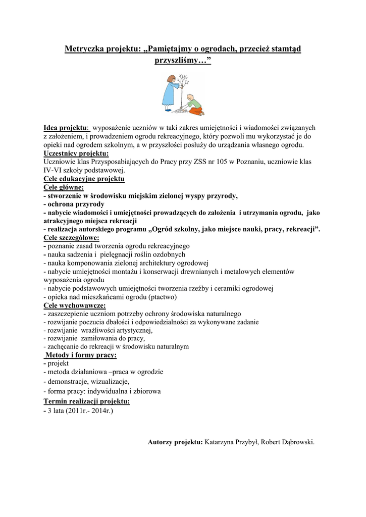Metryczka projektu: „Pamiętajmy o ogrodach, przecież stamtąd przyszliśmy…” Idea projektu: wyposażenie uczniów w taki zakres umiejętności i wiadomości związanych z założeniem, i prowadzeniem ogrodu rekreacyjnego, który pozwoli mu wykorzystać je do opieki nad ogrodem szkolnym, a w przyszłości posłuży do urządzania własnego ogrodu. Uczestnicy projektu: Uczniowie klas Przysposabiających do Pracy przy ZSS nr 105 w Poznaniu, uczniowie klas IV-VI szkoły podstawowej. Cele edukacyjne projektu Cele główne: - stworzenie w środowisku miejskim zielonej wyspy przyrody, - ochrona przyrody - nabycie wiadomości i umiejętności prowadzących do założenia i utrzymania ogrodu, jako atrakcyjnego miejsca rekreacji - realizacja autorskiego programu „Ogród szkolny, jako miejsce nauki, pracy, rekreacji”. Cele szczegółowe: - poznanie zasad tworzenia ogrodu rekreacyjnego - nauka sadzenia i pielęgnacji roślin ozdobnych - nauka komponowania zielonej architektury ogrodowej - nabycie umiejętności montażu i konserwacji drewnianych i metalowych elementów wyposażenia ogrodu - nabycie podstawowych umiejętności tworzenia rzeźby i ceramiki ogrodowej - opieka nad mieszkańcami ogrodu (ptactwo) Cele wychowawcze: - zaszczepienie uczniom potrzeby ochrony środowiska naturalnego - rozwijanie poczucia dbałości i odpowiedzialności za wykonywane zadanie - rozwijanie wrażliwości artystycznej, - rozwijanie zamiłowania do pracy, - zachęcanie do rekreacji w środowisku naturalnym Metody i formy pracy: - projekt - metoda działaniowa –praca w ogrodzie - demonstracje, wizualizacje, - forma pracy: indywidualna i zbiorowa Termin realizacji projektu: - 3 lata (2011r.- 2014r.) Autorzy projektu: Katarzyna Przybył, Robert Dąbrowski.