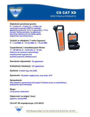 CS CAT XD SPECYFIKACJA PRODUKTU Głębokość penetracji gruntu: P – 3 metry, R – 2 metry, G – 3 metry; po naciśnięciu przycisku DEPTH, pokazuje głębokość przewodu: 0,5÷3 m (generator); 1÷9 m (sonda). Należy pamiętać, że głębokość penetracji zależna je st od rodzaju gleby, wilgotności oraz temperatury. Czułość w odległości 1 metra (typowa): P – 7 mA RMS, R – 10 mA RMS, G – 10 mA RMS Częstotliwość i charakterystyki filtrów: P – 50÷400 Hz, R - 15÷20 kHz, G - 33 kHz (dobrane do uzyskania optymalnego współczynnika sygnału przy wysokim poziomie selektywności) Szerokość odpowiedzi: 5% głębokości Dokładność lokalizacji: 10% głębokości Zasilanie: 8 baterii typu AA (LR6) Żywotność: 40 godzin ciągłej pracy, przy temp. 20°C Sprawdzanie: Przy włączeniu generowany jest sygnał. Podczas pracy na wyświetlaczu, pokazywana jest informacja. Waga: 3,0 kg (wraz z bateriami) Odporność na wilgoć i kurz: zgodnie z normą IP65 CS-CAT XD współpracuje z CS -SG33