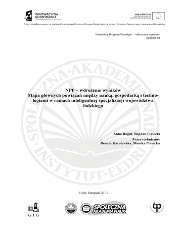 Narodowy Program Foresight – wdrożenie wyników Zadanie 1g NPF – wdrożenie wyników Mapa głównych powiązań między nauką, gospodarką i technologiami w ramach inteligentnej specjalizacji województwa łódzkiego Anna Rogut, Bogdan Piasecki Prace techniczne: Renata Karolewska, Monika Piasecka Łódź, listopad 2013 Spis treści STRESZCZENIE ......................................................................................................................... 4 WPROWADZENIE .................................................................................................................... 4 RAMY METODYCZNE OPRACOWANIA MAPY POWIĄZAŃ MIĘDZY NAUKĄ, GOSPODARKĄ I TECHNOLOGIAMI .................................................................................................................... 6 FUNKCJONALNA KLASYFIKACJA DZIAŁALNOŚCI BADAWCZO-ROZWOJOWEJ .................................................. 6 METODYKA MIND MAPPING’U ........................................................................................................ 8 OBSZARY INTELIGENTNEJ SPECJALIZACJI WOJEWÓDZTWA ŁÓDZKIEGO..................................... 8 OBSZARY INTELIGENTNYCH SPECJALIZACJI .......................................................................................... 8 SZCZEGÓŁOWY ZAKRES OBSZARÓW INTELIGENTNYCH SPECJALIZACJI ......................................................... 9 SZCZEGÓŁOWY WYKAZ BRANŻ O NAJWIĘKSZYM POTENCJALE ROZWOJOWYM .................................................... 9 SZCZEGÓŁOWY WYKAZ KLUCZOWYCH OBSZARÓW TECHNOLOGICZNYCH ......................................................... 19 MAPY GŁÓWNYCH POWIĄZAŃ MIĘDZY NAUKĄ, GOSPODARKĄ I TECHNOLOGIAMI W OBRĘBIE OBSZARÓW INTELIGENTNEJ SPECJALIZACJI WOJEWÓDZTWA ŁÓDZKIEGO ............................... 30 BIOTECHNOLOGIE ...................................................................................................................... 31 NANOTECHNOLOGIE................................................................................................................... 40 MECHATRONIKA ....................................................................................................................... 50 TECHNOLOGIE INFORMACYJNE I KOMUNIKACYJNE .............................................................................. 59 PODSUMOWANIE ................................................................................................................. 68 BIBLIOGRAFIA ....................................................................................................................... 69 ZAŁĄCZNIK 1: OECD. KLASYFIKACJA DZIEDZIN NAUKI I TECHNIKI ............................................ 70 ZAŁĄCZNIK 2: NOMENKLATURA DLA ANALIZY I PORÓWNA PROGRAMÓW I BUDŻETÓW NAUKOWYCH NABS .............................................................................................................. 73 ZAŁĄCZNIK 3: MIĘDZYNARODOWA KLASYFIKACJA PATENTOWA (DZIAŁY I PODDZIAŁY) .......... 75 ZAŁĄCZNIK 4: MIĘDZYNARODOWA STANDARDOWA KLASYFIKACJA RODZAJÓW DZIAŁALNOŚCI ISIC ....................................................................................................................................... 76 ZAŁĄCZNIK 5: MAPA POWIĄZAŃ MIĘDZY KIERUNKAMI BADAŃ NAUKOWYCH I TECHNOLOGII, I GOSPODARKĄ W OBSZARZE BIOTECHNOLOGII ....................................................................... 78 2 ZAŁĄCZNIK 6: MAPA POWIĄZAŃ MIĘDZY KIERUNKAMI BADAŃ NAUKOWYCH I TECHNOLOGII, I GOSPODARKĄ W OBSZARZE NANOTECHNOLOGII ................................................................... 79 ZAŁĄCZNIK 7: MAPA POWIĄZAŃ MIĘDZY KIERUNKAMI BADAŃ NAUKOWYCH I TECHNOLOGII, I GOSPODARKĄ W OBSZARZE MECHATRONIKI ......................................................................... 80 ZAŁĄCZNIK 8: MAPA POWIĄZAŃ MIĘDZY KIERUNKAMI BADAŃ NAUKOWYCH I TECHNOLOGII, I GOSPODARKĄ W OBSZARZE TECHNOLOGII INFORMACYJNO-KOMUNIKACYJNYCH .................. 81 3 Streszczenie Nauka, technologia i gospodarka są przedmiotem licznych klasyfikacji, z których każda opiera się na określonych standardach międzynarodowych. W przypadku klasyfikacji dziedzin nauki i techniki takim standardem jest propozycja OECD. Podobnym standardem, ale zorientowanym na analizę celów społecznogospodarczych działalności badawczo-rozwojowej, jest Nomenklatura dla analizy i porówna programów i budżetów naukowych NABS. Na tych standardach oparte są także polskie klasyfikacje, stosowane przez nieistniejący już Komitet Badań Naukowych, Narodowe Centrum Nauki czy Centralną Komisję do spraw Stopni i Tytułów. Standardy te są również inkorporowane do Słownika Dziedzin i Dyscyplin. Standardem dla klasyfikacji działalności technologicznej jest Międzynarodowa Klasyfikacja Patentowa. Standardem dla klasyfikacji działalności gospodarczej jest Międzynarodowa Standardowa Klasyfikacja Rodzajów Działalności ISIC. Polska Klasyfikacja Działalności Gospodarczej PKD 2007 jest oparta na zgodnej z ISIC Statystycznej Klasyfikacji Działalności Gospodarczej Unii Europejskiej NACE Rev.2.. Komplementarna do PKD 2007 jest Polska Klasyfikacja Wyrobów i Usług PKWiU 2008. Standardem dla wyodrębnienie sektorów wysokich, średnich i niskich technologii oraz usług wiedzochłonnych jest High-Technology Sector and Product Classification. Przedmiotem niniejszego raportu, przygotowanego w ramach zadania 1g: Wdrożenie opracowanego systemu map nauki i technologii, jest wykorzystanie istniejących klasyfikacji do opracowania mapy głównych powiązań między dziedzinami nauki i działami gospodarki poprzez obszary wysokich i średnio-wysokich technologii na przykładzie inteligentnej specjalizacji województwa łódzkiego. Wprowadzenie Nauka, technologia i gospodarka są przedmiotem licznych klasyfikacji, z których każda opiera się na określonych standardach międzynarodowych. W przypadku klasyfikacji dziedzin nauki i technik
