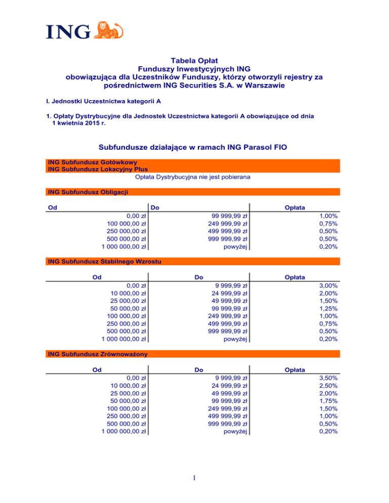 Tabela Opłat Funduszy Inwestycyjnych ING obowiązująca dla Uczestników Funduszy, którzy otworzyli rejestry za pośrednictwem ING Securities S.A. w Warszawie I. Jednostki Uczestnictwa kategorii A 1. Opłaty Dystrybucyjne dla Jednostek Uczestnictwa kategorii A obowiązujące od dnia 1 kwietnia 2015 r. Subfundusze działające w ramach ING Parasol FIO ING Subfundusz Gotówkowy ING Subfundusz Lokacyjny Plus Opłata Dystrybucyjna nie jest pobierana ING Subfundusz Obligacji Od Opłata Do 0,00 zł 100 000,00 zł 250 000,00 zł 500 000,00 zł 1 000 000,00 zł 99 999,99 zł 249 999,99 zł 499 999,99 zł 999 999,99 zł powyżej 1,00% 0,75% 0,50% 0,50% 0,20% ING Subfundusz Stabilnego Wzrostu Od Opłata Do 0,00 zł 10 000,00 zł 25 000,00 zł 50 000,00 zł 100 000,00 zł 250 000,00 zł 500 000,00 zł 1 000 000,00 zł 9 999,99 zł 24 999,99 zł 49 999,99 zł 99 999,99 zł 249 999,99 zł 499 999,99 zł 999 999,99 zł powyżej 3,00% 2,00% 1,50% 1,25% 1,00% 0,75% 0,50% 0,20% ING Subfundusz Zrównoważony Od Opłata Do 0,00 zł 10 000,00 zł 25 000,00 zł 50 000,00 zł 100 000,00 zł 250 000,00 zł 500 000,00 zł 1 000 000,00 zł 9 999,99 zł 24 999,99 zł 49 999,99 zł 99 999,99 zł 249 999,99 zł 499 999,99 zł 999 999,99 zł powyżej 1 3,50% 2,50% 2,00% 1,75% 1,50% 1,00% 0,50% 0,20% ING Subfundusz Akcji ING Subfundusz Średnich i Małych Spółek ING Subfundusz Akcji Środkowoeuropejskich ING Subfundusz Środkowoeuropejski Budownictwa i Nieruchomości ING Subfundusz Selektywny Od Opłata Do 0,00 zł 10 000,00 zł 25 000,00 zł 50 000,00 zł 100 000,00 zł 250 000,00 zł 500 000,00 zł 1 000 000,00 zł 9 999,99 zł 24 999,99 zł 49 999,99 zł 99 999,99 zł 249 999,99 zł 499 999,99 zł 999 999,99 zł powyżej 4,00% 3,00% 2,50% 2,00% 1,75% 1,25% 0,75% 0,30% Subfundusze działające w ramach ING SFIO ING Subfundusz Globalny Spółek Dywidendowych (L) ING Subfundusz Spółek Dywidendowych USA (L) ING Subfundusz Europejski Spółek Dywidendowych (L) ING Subfundusz Japonia (L) ING Subfundusz Nowej Azji (L) ING Subfundusz Spółek Dywidendowych Rynków Wschodzących (L) ING Subfundusz Ameryki Łacińskiej (L) ING Subfundusz Globalnych Możliwości (L) Od Opłata Do 0,00 zł 3 000,00 zł 10 000,00 zł 25 000,00 zł 50 000,00 zł 100 000,00 zł 250 000,00 zł 500 000,00 zł 1 000 000,00 zł 2 999,99 zł 9 999,99 zł 24 999,99 zł 49 999,99 zł 99 999,99 zł 249 999,99 zł 499 999,99 zł 999 999,99 zł powyżej 5,00% 4,00% 3,00% 2,50% 2,00% 1,75% 1,25% 0,75% 0,30% ING Subfundusz Globalny Długu Korporacyjnego (L) ING Subfundusz Obligacji Rynków Wschodzących (Waluta Lokalna) (L) Od Opłata Do 0,00 zł 3 000,00 zł 10 000,00 zł 25 000,00 zł 50 000,00 zł 100 000,00 zł 250 000,00 zł 500 000,00 zł 1 000 000,00 zł 2 999,99 zł 9 999,99 zł 24 999,99 zł 49 999,99 zł 99 999,99 zł 249 999,99 zł 499 999,99 zł 999 999,99 zł powyżej 2 1,50% 1,25% 1,00% 1,00% 0,75% 0,50% 0,40% 0,40% 0,20% Towarzystwo pobiera Opłatę Dystrybucyjną w walucie polskiej. W przypadku wpłaty w dolarach amerykańskich lub euro, do celów pobrania Opłaty Dystrybucyjnej przelicza się wpłatę na walutę polską według średniego kursu z Dnia Wyceny, w którym następuje zbycie Jednostek Uczestnictwa, wyliczonego przez Narodowy Bank Polski. Przy pobieraniu Opłaty Dystrybucyjnej stosowana jest zasada kumulacji, co oznacza, że określając procentową stawkę Opłaty Dystrybucyjnej uwzględnia się wartość wszystkich jednostek uczestnictwa Uczestnika zgromadzonych w ramach jego Numeru Uczestnika, łącznie z bieżącą wpłatą. Dla jednostek uczestnictwa zgromadzonych w ramach Numeru Uczestnika, nabytych za wpłaty dokonane w dolarach amerykańskich lub euro, zasada kumulacji stosowana jest w ten sposób, że wartość posiadanych jednostek uczestnictwa przeliczana jest na walutę polską według średniego kursu z Dnia Wyceny, w którym następuje zbycie Jednostek Uczestnictwa, wyliczonego przez Narodowy Bank Polski. Opłaty określone w Tabeli Opłat będą stosowane przy zbywaniu Jednostek Uczestnictwa zapisywanych na rejestrach otwartych za pośrednictwem ING Securities S.A. O zastosowaniu opłat określonych w Tabeli Opłat decyduje: - data zaksięgowania wpłaty na rachunku bankowym funduszu albo data otrzymania zlecenia otwarcia rejestru, w zależności, która z tych dat jest późniejsza – w przypadku pierwszego nabycia jednostek uczestnictwa, - data zaksięgowania wpłaty na rachunku bankowym funduszu – w przypadku nabywania jednostek uczestnictwa w drodze wpłaty na rachunek bankowy funduszu przez Uczestnika posiadającego otwarty rejestr (Wpłaty Bezpośredniej), - data otrzymania zlecenia przez Agenta Transferowego – w przypadku nabywania jednostek uczestnictwa w drodze Konwersji/Zamiany. 2. Opłata za Konwersję Opłata za Konwersję wynosi 0% (opłata nie jest pobierana). Oplata za Konwersję nie jest tożsama z Opłatą Dystrybucyjną. Zasady pobierania Opłaty Dystrybucyjnej przy realizacji zlecenia Konwersji, w tym zasady zwolnienia od Opłaty Dystrybucyjnej, zostały szczegółowo opisane w punkcie dot. Opłat Dystrybucyjnych 3. Opłata za Zamianę Opłata za Zamianę wynosi 0% (opłata nie jest pobierana). Oplata za Zamianę nie jest tożsama z Opłatą Dystrybucyjną. Zasady pobierania Opłaty Dystrybucyjnej przy realizacji zlecenia Zamiany, w tym zasady zwolnienia od Opłaty Dystrybucyjnej, zostały szczegółowo opisane w punkcie dot. Opłat Dystrybucyjnych II. Jednostki Uczestnictwa kategorii K (zbywane w ramach „IKE Kapitał z Lwem”) 1. Opłata Dystrybucyjna – dla Jednostek Uczestnictwa kategorii K zbywanych w ramach „IKE Kapitał z Lwem” obowiązujące od dnia 1 września 2010 r. Wszystkie fundusze inwestycyjne oferowane w ramach „IKE Kapitał z Lwem” Skumulowane Saldo Wpłat w zł Od Do 0,00 zł 3 000,00 zł 6 000,00 zł 3 Opłata* 2 999,99 zł 5 999,99 zł 8 999,99 zł 5,00% 4,00% 3,00% 9 000,00 zł 11 999,99 zł 2,00% 12 000,00 zł 14 999,99 zł 1,00% 15 000,00 zł powyżej 