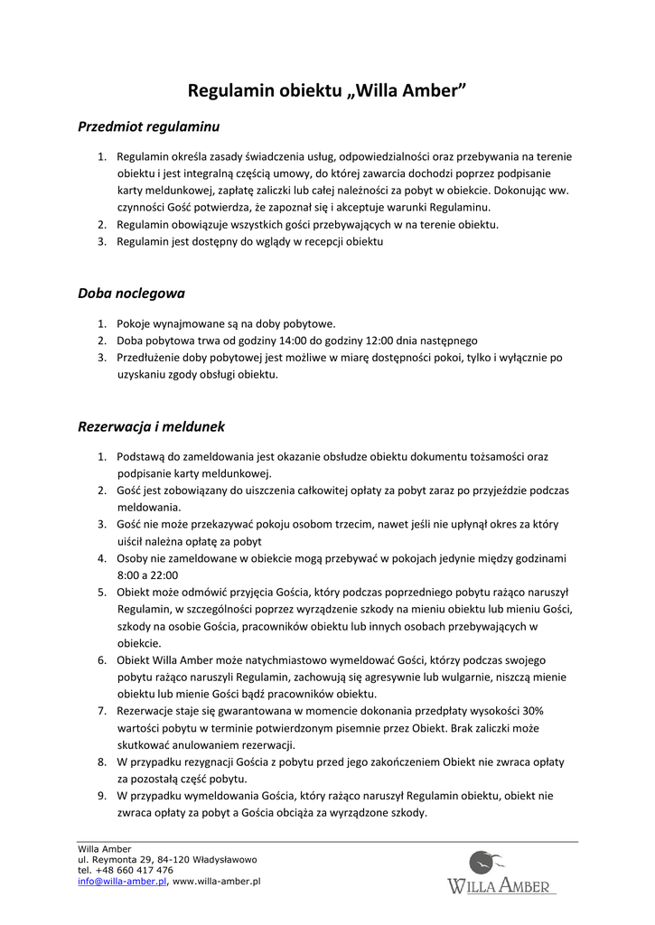 Regulamin obiektu „Willa Amber” Przedmiot regulaminu 1. Regulamin określa zasady świadczenia usług, odpowiedzialności oraz przebywania na terenie obiektu i jest integralną częścią umowy, do której zawarcia dochodzi poprzez podpisanie karty meldunkowej, zapłatę zaliczki lub całej należności za pobyt w obiekcie. Dokonując ww. czynności Gość potwierdza, że zapoznał się i akceptuje warunki Regulaminu. 2. Regulamin obowiązuje wszystkich gości przebywających w na terenie obiektu. 3. Regulamin jest dostępny do wglądy w recepcji obiektu Doba noclegowa 1. Pokoje wynajmowane są na doby pobytowe. 2. Doba pobytowa trwa od godziny 14:00 do godziny 12:00 dnia następnego 3. Przedłużenie doby pobytowej jest możliwe w miarę dostępności pokoi, tylko i wyłącznie po uzyskaniu zgody obsługi obiektu. Rezerwacja i meldunek 1. Podstawą do zameldowania jest okazanie obsłudze obiektu dokumentu tożsamości oraz podpisanie karty meldunkowej. 2. Gość jest zobowiązany do uiszczenia całkowitej opłaty za pobyt zaraz po przyjeździe podczas meldowania. 3. Gość nie może przekazywać pokoju osobom trzecim, nawet jeśli nie upłynął okres za który uiścił należna opłatę za pobyt 4. Osoby nie zameldowane w obiekcie mogą przebywać w pokojach jedynie między godzinami 8:00 a 22:00 5. Obiekt może odmówić przyjęcia Gościa, który podczas poprzedniego pobytu rażąco naruszył Regulamin, w szczególności poprzez wyrządzenie szkody na mieniu obiektu lub mieniu Gości, szkody na osobie Gościa, pracowników obiektu lub innych osobach przebywających w obiekcie. 6. Obiekt Willa Amber może natychmiastowo wymeldować Gości, którzy podczas swojego pobytu rażąco naruszyli Regulamin, zachowują się agresywnie lub wulgarnie, niszczą mienie obiektu lub mienie Gości bądź pracowników obiektu. 7. Rezerwacje staje się gwarantowana w momencie dokonania przedpłaty wysokości 30% wartości pobytu w terminie potwierdzonym pisemnie przez Obiekt. Brak zaliczki może skutkować anulowaniem rezerwacji. 8. W przypadku rezygnacji Gościa z pobytu przed jego zakończeniem Obiekt nie zwraca opłaty za pozostałą część pobytu. 9. W przypadku wymeldowania Gościa, który rażąco naruszył Regulamin obiektu, obiekt nie zwraca opłaty za pobyt a Gościa obciąża za wyrządzone szkody. Willa Amber ul. Reymonta 29, 84-120 Władysławowo tel. +48 660 417 476 [email protected], www.willa-amber.pl Odpowiedzialność gości 1. Dzieci poniżej 12 roku życia powinny znajdować się na terenie Obiektu a w szczególności na placu zabaw pod stałym nadzorem opiekunów. Opiekunowie ponoszą odpowiedzialność materialną za wszelki szkody powstałe w wyniku działania dzieci 2. Gość ponosi pełną odpowiedzialność materialną za uszkodzenia lub zniszczenia wyposażenia i urządzeń technicznych obiektu, powstałe z jego winy lub z winy odwiedzających go osób. Obiekt zastrzega sobie prawo dochodzenia roszczeń od Gościa za wyrządzone szkody również po jego wyjeździe. 3. W przypadku naruszenia postanowień Regulaminu, obiekt może odmówić świadczenia usług osobie która je narusza. Osoba taka jest zobowiązana do niezwłocznego zastosowania się do żądań obiektu, uregulowania należności za dotychczasowe świadczenia, do zapłaty za ewentualne zniszczenia oraz do opuszczenia obiektu. 4. Każdorazowo Gość opuszczając pokój powinien wyłączyć telewizor, zgasić światło, zakręcić krany oraz zamknąć drzwi na klucz 5. Obiektowi przysługuje ustawowe prawo do zastawu na rzeczach wniesionych przez Gościa do obiektu w przypadku opóźnienia z uregulowaniem płatności z pobyt lub nieuregulowaniem należności za świadczone usługi. Odpowiedzialność obiektu 1. Obiekt ponosi odpowiedzialność za utratę lub uszkodzenie rzeczy wniesionych przez osoby korzystające z jego usług w zakresie określonym przepisami kodeksu cywilnego. 2. Gość powinien zawiadomić obsługę obiektu w wystąpieniu szkody niezwłocznie po jej stwierdzeniu. 3. Obiekt odpowiada z tytułu utraty lub uszkodzenia pieniędzy, papierów wartościowych, kosztowności albo przedmiotów mających wartość naukową lub artystyczną wyłącznie, jeśli przedmioty zostały oddane na przechowanie do depozytu obiektu. 4. Obiekt nie przyjmuje do depozytu przedmiotów oraz kwot pieniężnych i kosztowności o wartości przekraczającej 4000 złotych (słownie cztery tysiące złotych) na pokój. 5. Obiekt nie przyjmuje do depozytu przedmiotów niebezpiecznych oraz wielkogabarytowych, których nie można umieścić w depozycie. 6. Obiekt nie ponosi odpowiedzialności za uszkodzenia i utratę samochodu lub innego pojazdu należącego do gościa, przedmiotów w nim pozostawionych oraz żywych zwierząt, niezależnie od tego, czy pojazdy zostały zaparkowane na parkingu obiektu czy poza terenem obiektu. Zwrot rzeczy pozostawionych 1. Przedmioty pozostawione przez Gościa w pokoju będę odesłane na wskazany adres na koszt Gościa 2. W przypadku nie otrzymania od Gościa dyspozycji odesłania pozostawionych rzeczy, obiekt przechowa powyższe przedmioty na koszt właściciela przez okres 2 miesięcy, a po upływie Willa Amber ul. Reymonta 29, 84-120 Władysławowo tel. +48 660 417 476 [email protected], www.willa-amber.pl tego okresu przedmioty przechodzą na własność obiektu. Artykuły spożywcze będą przechowywane przez 24 godziny. Cisza nocna W obiekcie obowiązuje cisza nocna od godziny 22:00 do 7:00. Postanowienia dodatkowe 1. Obecność zwierząt na terenie obiektu jest możliwa jedynie po wcześniejszym uzyskaniu zgody od obsługi obiektu i jest uzależniona o gatunku oraz rasy zwierzęcia. Po uzyskaniu zgody zwierzęta mogą przebywać za dodatkową opłatą. Jednakże właściciel jest zobowiązany za trzymanie go w taki sposób aby nie stanowił zagrożenia dla innych Gości oraz personelu. Obecność psów ras uznawanych powszechnie za niebezpieczne oraz mieszańców tych ras jest bezwzg