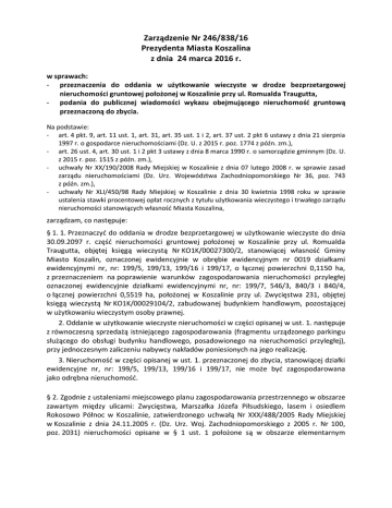 Zarządzenie Nr 246/838/16 Prezydenta Miasta Koszalina z dnia 24 marca 2016 r. w sprawach: - przeznaczenia do oddania w użytkowanie wieczyste w drodze bezprzetargowej nieruchomości gruntowej położonej w Koszalinie przy ul. Romualda Traugutta, - podania do publicznej wiadomości wykazu obejmującego nieruchomość gruntową przeznaczoną do zbycia. Na podstawie: - art. 4 pkt. 9, art. 11 ust. 1, art. 31, art. 35 ust. 1 i 2, art. 37 ust. 2 pkt 6 ustawy z dnia 21 sierpnia 1997 r. o gospodarce nieruchomościami (Dz. U. z 2015 r. poz. 1774 z późn. zm.), - art. 26 ust. 4, art. 30 ust. 1 i 2 pkt 3 ustawy z dnia 8 marca 1990 r. o samorządzie gminnym (Dz. U. z 2015 r. poz. 1515 z późn. zm.), - uchwały Nr XX/190/2008 Rady Miejskiej w Koszalinie z dnia 07 lutego 2008 r. w sprawie zasad zarządu nieruchomościami (Dz. Urz. Województwa Zachodniopomorskiego Nr 36, poz. 743 z późn. zm.), - uchwały Nr XLI/450/98 Rady Miejskiej w Koszalinie z dnia 30 kwietnia 1998 roku w sprawie ustalenia stawki procentowej opłat rocznych z tytułu użytkowania wieczystego i trwałego zarządu nieruchomości stanowiących własność Miasta Koszalina, zarządzam, co następuje: § 1. 1. Przeznaczyć do oddania w drodze bezprzetargowej w użytkowanie wieczyste do dnia 30.09.2097 r. część nieruchomości gruntowej położonej w Koszalinie przy ul. Romualda Traugutta, objętej księgą wieczystą Nr KO1K/00027300/2, stanowiącej własność Gminy Miasto Koszalin, oznaczonej ewidencyjnie w obrębie ewidencyjnym nr 0019 działkami ewidencyjnymi nr, nr: 199/5, 199/13, 199/16 i 199/17, o łącznej powierzchni 0,1150 ha, z przeznaczeniem na poprawienie warunków zagospodarowania nieruchomości przyległej oznaczonej ewidencyjnie działkami ewidencyjnymi nr, nr: 199/7, 546/3, 840/3 i 840/4, o łącznej powierzchni 0,5519 ha, położonej w Koszalinie przy ul. Zwycięstwa 231, objętej księgą wieczystą Nr KO1K/00029104/2, zabudowanej budynkiem handlowym, pozostającej w użytkowaniu wieczystym osoby prawnej. 2. Oddanie w użytkowanie wieczyste nieruchomości w części opisanej w ust. 1. następuje z równoczesną sprzedażą istniejącego zagospodarowania (fragmentu urządzonego parkingu służącego do obsługi budynku handlowego, posadowionego na nieruchomości przyległej), przy jednoczesnym zaliczeniu nabywcy nakładów poniesionych na jego realizację. 3. Nieruchomość w części opisanej w ust. 1. przeznaczonej do zbycia, stanowiącej działki ewidencyjne nr, nr: 199/5, 199/13, 199/16 i 199/17, nie może być zagospodarowana jako odrębna nieruchomość. § 2. Zgodnie z ustaleniami miejscowego planu zagospodarowania przestrzennego w obszarze zawartym między ulicami: Zwycięstwa, Marszałka Józefa Piłsudskiego, lasem i osiedlem Rokosowo Północ w Koszalinie, zatwierdzonego uchwałą Nr XXX/488/2005 Rady Miejskiej w Koszalinie z dnia 24.11.2005 r. (Dz. Urz. Woj. Zachodniopomorskiego z 2005 r. Nr 100, poz. 2031) nieruchomości opisane w § 1 ust. 1 położone są w obszarze elementarnym Zarządzenie Nr 246/838/16 Prezydenta Miasta Koszalina z dnia 24 marca 2016 r. oznaczonym symbolem 4.29 U z przeznaczeniem pod usługi komercyjne, w szczególności handlu. § 3. Podać do publicznej wiadomości wykaz obejmujący część nieruchomości opisanej w § 1 ust. 1 przeznaczonej do oddania w użytkowanie wieczyste, stanowiący załącznik do niniejszego zarządzenia. § 4. Traci moc Zarządzenie Nr 276/1243/12 z dnia 10 października 2012 r. § 5. Wykonanie zarządzenia powierzam Dyrektorowi Wydziału Nieruchomości Urzędu Miejskiego w Koszalinie. § 6. Zarządzenie wchodzi w życie z dniem wydania. PREZYDENT MIASTA Piotr Jedliński /podpis nieczytelny/ Stwierdzam, że zbycie nieruchomości w części opisanej w § 1 ust. 1. jest zgodne z ustaleniami miejscowego planu zagospodarowania przestrzennego w obszarze zawartym między ulicami: Zwycięstwa, Marszałka Józefa Piłsudskiego, lasem i osiedlem Rokosowo Północ w Koszalinie DYREKTOR WYDZIAŁU ARCHITEKTURY I URBANISTYKI mgr inż. Iwona Stepanow /podpis nieczystelny/ Załącznik do Zarządzenia Prezydenta Miasta Koszalina Nr 246/838/16 z dnia 24 marca 2016 r. WYKAZ NIERUCHOMOŚCI przeznaczonej do zbycia w drodze bezprzetargowej Lp. Oznaczenie nieruchomości wg operatu ewidencji gruntów i budynków: 1. działka numer 2. obręb numer 3. księga wieczysta numer Powierzchnia Położenie 1. Przeznaczenie nieruchomości nieruchomości nieruchomości w miejscowym planie [ha] [ulica] zagospodarowania przestrzennego 2. Sposób zagospodarowania nieruchomości 1. 2. 3. 1. 1. 199/5, 199/13, 199/16, 199/17 2. 0019 3. KO1K/00027300/2 0,1150 4. ul. Romualda Traugutta Forma zbycia nieruchomości 5. 6. 1. Miejscowy plan zagospodarowania przestrzennego w obszarze zawartym między ulicami: Zwycięstwa, Marszałka Józefa Piłsudskiego, lasem i osiedlem Rokosowo Północ w Koszalinie, zatwierdzonym uchwałą Nr XXX/488/2005 Rady Miejskiej w Koszalinie z dnia 24.11.2005 r. - obszar elementarny oznaczony symbolem 4.29 U z przeznaczeniem pod usługi komercyjne, w szczególności handlu. Oddanie nieruchomości w drodze bezprzetargowej w użytkowanie wieczyste do dnia 30.09.2097 r. 2. Zbycie nieruchomości następuje z przeznaczeniem na poprawienie warunków zagospodarowania nieruchomości przyległej oznaczonej działkami nr, nr: 199/7, 546/3, 840/3, 840/4 w części zabudowanej fragmentem urządzonego parkingu służącego do obsługi budynku handlowego. Cena nieruchomości Wysokość opłat za użytkowanie 1. grunt wieczyste: 2. budynek/budowla 1. pierwsza opłata w wysokości 25% ceny [netto zł] nieruchomości 2. opłata roczna w wysokości 5% ceny nieruchomości 7. 1. 300.000,00 zł 2. – zł z uwagi na zaliczenie Nabywcy nakładów poniesionych w całości na realizację istniejącego zagospodarowania 8. Termin do złożenia wniosku przez osoby, którym przysługuje pierwszeństwo w nabyciu nieruchomości na podst. art. 34 ust. 1 pkt.1 i pkt 2 ustawy z dnia 21 sierpnia 199
