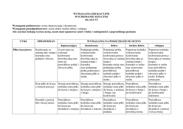 WYMAGANIA EDUKACYJNE WYCHOWANIE FIZYCZNE KLASA VI Wymagania podstawowe: oceny dopuszczająa i dostateczna Wymagania ponadpodstawowe: ocena dobra, bardzo dobra i celująca Aby uzyskać kolejną wyższa ocenę, uczeń musi opanować zasów wiedzy i umiejętności z poprzedniego poziomu CYKL WYMAGANIA NA POSZCZEGÓLNE OCENY SPRAWDZIAN dopuszczająca Piłka koszykowa dobra bardzo dobra celująca Podejmuje próbę wykonywania kozłowania prawą i lewą ręką ze zmianą tempa i kierunku ruchu oraz podejmuje próbę prawidłowej techniki podań i chwytów piłki w ruchu. Poprawna technika wykonywania kozłowania dowolną ręką ze zmianą tempa i kierunku w ruchu oraz stosowanie prawidłowej techniki podań i chwytów piłki w ruchu. Poprawna technika wykonywania kozłowania prawą i lewą ręką ze zmianą tempa i kierunku w ruchu oraz prawidłowa technika podań i chwytów piłki w ruchu. Podania sytuacyjne. Rzut piłki do kosza Stosuje prawidłową Stosuje prawidłową z różnych pozycji: technikę rzutu piłki technikę rzutu piłki do kosza z miejsca do kosza z miejsca i z biegu. Stosuje prawidłową technikę rzutu piłki do kosza, z miejsca, z biegu i po kozłowaniu Prawidłowa technika rzutu piłki do kosza z biegu i po kozłowaniu Prawidłowa technika rzutu piłki do kosza z biegu i po kozłowaniu slalomem. Prawidłowa technika rzutu piłki do kosza po dwutakcie z miejsca Prawidłowa technika rzutu piłki do kosza po dwutakcie z podania. Prawidłowa technika rzutu piłki do kosza po dwutakcie z dowolnej strony. Prawidłowa technika rzutu piłki do kosza po dwutakcie z prawej i lewej strony. Kozłowanie ze zmianą ręki, tempa i kierunku oraz podania i chwyty. Dwutakt z prawej lub z lewej strony: Uczeń stara się wykonać kozłowanie dowolną ręką oraz stara się prawidłowo podać i chwycić piłkę. dostateczna Podejmuje próbę wykonywania kozłowania dowolną ręką ze zmianą tempa i kierunku oraz podejmuje próbę podawania i chwytania piłki w ruchu. Prawidłowa technika rzutu piłki do kosza po dwutakcie z marszu Piłka siatkowa LA Zagrywka górna: Prawidłowo wykonuje zagrywkę sposobem górnym przez siatkę z odległości 5 metrów z uwzględnieniem ilości:2 odbicia Prawidłowo wykonuje zagrywkę sposobem górnym przez siatkę z odległości 5 metrów z uwzględnieniem ilości: 3 odbicia Prawidłowo wykonuje zagrywkę sposobem górnym przez siatkę z odległości 5 metrów z uwzględnieniem ilości:4 odbicia Prawidłowo wykonuje zagrywkę sposobem górnym przez siatkę z odległości 5 metrów z uwzględnieniem ilości: 5 odbić Prawidłowo wykonuje zagrywkę sposobem górnym przez siatkę z odległości 5 metrów z uwzględnieniem ilości:6 dobić Łączenie odbić piłki Łączenie odbić piłki sposobem górnym i sposobem górnym i dolnym: dolnym przez siatkę z uwzględnieniem ilości: 2 Łączenie odbić piłki sposobem górnym i dolnym przez siatkę z uwzględnieniem ilości: 4 Łączenie odbić piłki sposobem górnym i dolnym przez siatkę z uwzględnieniem ilości: 6 Łączenie odbić piłki sposobem górnym i dolnym przez siatkę z uwzględnieniem ilości: 8 Łączenie odbić piłki sposobem górnym i dolnym przez siatkę z uwzględnieniem ilości: 10 Bieg na dystansie 60m Poprawna technika startu niskiego na komendy startera. Bieg na dystansie 60m z pomiarem czasu. Nauczyciel ocenia zaangażowanie ucznia w wykonanie zadania, jego starania, bierze pod uwagę jego warunki fizyczne i zdrowotne. Skok w dal sposobem naturalnym Poprawna technika skoku w dal sposobem naturalnym ze strefy z pomiarem odległości Nauczyciel ocenia zaangażowanie ucznia w wykonanie zadania, jego starania, bierze pod uwagę jego warunki fizyczne i zdrowotne. Rzut piłeczką palantową Rzut piłeczką palantową na odległość. Ocena techniki rzutu i siły RR. Nauczyciel ocenia zaangażowanie ucznia w wykonanie zadania, jego starania, bierze pod uwagę jego warunki fizyczne i zdrowotne. Rrzut piłka lekarską Rzut oburącz piłką lekarską w przód z miejsca na odległość. Ocena techniki rzutu. – 2 kg dziewczeta, Nauczyciel ocenia zaangażowanie ucznia w wykonanie zadania, jego starania, bierze pod uwagę jego 3 kg - chłopcy warunki fizyczne i zdrowotne. Bieg na dystansie 600 metrów dziewcząt/ 1000 metrów chłopców Gimnastyka Ocena wytrzymałości Nauczyciel ocenia zaangażowanie ucznia w wykonanie zadania, jego starania, bierze pod uwagę jego warunki fizyczne i zdrowotne. Przewrót w przód z 7 błędów przysiadu do 6 błędów 4 błędy 2 błędy Brak błędów przysiadu podpartego, wykonany przez daną przeszkodę. Błędy a. Brak rozpoczęcia i zakończenia ćwiczenia b. Złe ułożenie rąk c. Przewrót na głowie d. Uderzenie głową o przeszkodę e. Brak wyprostu w kolanach f. Brak złączenia nóg g. Podparcie przy zakończeniu ćwiczenia h. Brak płynności Przerzut bokiem z 4 błędy pozycji przodem Błędy a. Brak rozpoczęcia i zakończenia ćwiczenia b. Złe ułożenie rąk na materacu c. Nieotrzymanie pozycji pionowej d. Brak płynności w 3 błędy 2 błędy 1 błąd Brak błędów wykonywaniu ćwiczenia e.)Ugięte nogi w kolanach Przewrót w tył z 5 błędów przysiadu podpartego do rozkroku Błędy: a.Brak rozpoczęcia i zakończenia ćwiczenia b. Złe ułożenie rąk w czasie ćwiczenia c. Brak odepchnięcia od podłoża d. Przewrót na głowie e. Brak prawidłowego rozkroku f. Brak płynności 4 błędy 2 błędy 1 błąd bezbłędnie Krótki układ 6 błędów gimnastyczny:Przerzut bokiem1/4 obrotu-przewrót w przód do przysiadu-siad płaski-leżenie tyłemmosteksiad płaski ze skłonem w przód- 4 błędy 3 błędy 2 błędy bezbłędnie przysiad podpartyprzewrót w tył do rozkroku. Błędy: a. Brak rozpoczęcia i zakończenia ćwiczenia b. Brak podparcia w 4 punktach przy przerzucie bokiem c.Przewrót na głowie d. Brak umiejętności wykonania mostku e. Ugięcie kolan przy skłonie w przód w siadzie płaskim f. Złe ułożenie rąk oraz brak prawid