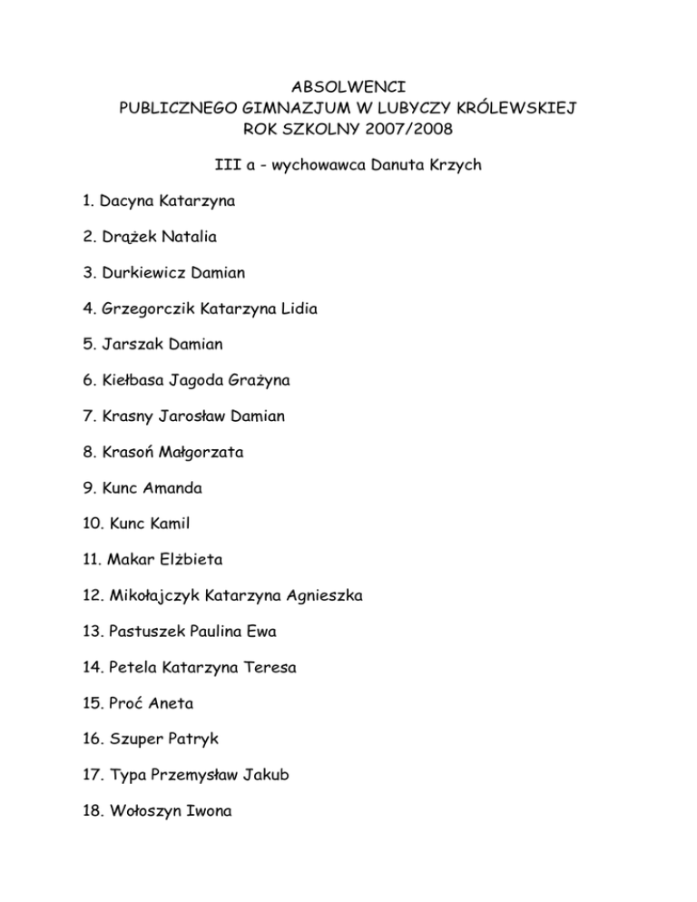 ABSOLWENCI PUBLICZNEGO GIMNAZJUM W LUBYCZY KRÓLEWSKIEJ ROK SZKOLNY 2007/2008 III a - wychowawca Danuta Krzych 1. Dacyna Katarzyna 2. DrąŜek Natalia 3. Durkiewicz Damian 4. Grzegorczik Katarzyna Lidia 5. Jarszak Damian 6. Kiełbasa Jagoda GraŜyna 7. Krasny Jarosław Damian 8. Krasoń Małgorzata 9. Kunc Amanda 10. Kunc Kamil 11. Makar ElŜbieta 12. Mikołajczyk Katarzyna Agnieszka 13. Pastuszek Paulina Ewa 14. Petela Katarzyna Teresa 15. Proć Aneta 16. Szuper Patryk 17. Typa Przemysław Jakub 18. Wołoszyn Iwona 19. Zakrzewska Lilia GraŜyna III b - wychowawca GraŜyna Mruk 1. Brogowski Jakub 2. Bukowska Agnieszka 3. Cioch Jacek Tomasz 4. Dymytryszyn Dariusz 5. Feret Dorota Anna 6. Flis Anna 7. Gaczoł Grzegorz 8. Gawryś Sylwester 9. Goch Bartłomiej 10. Jasińska Magdalena 11. Matwiejczuk Justyna Martyna 12. Momot Dawid Krzysztof 13. Pawelec Dominika 14. Pruchnicka Katarzyna Maria 15. Skalski Mateusz 16. Sycz Tomasz 17. Szpindor Sandra Joanna 18. Szuwara Mateusz 19. Walczuk Patryk 20. WaŜna Beata 21. WaŜny Maciej 22. Witkowski Łukasz 23. Wojciechowska Alicja Maria 24. Wróbel Tomasz Marek III c - wychowawca Jadwiga Słotwińska 1. Biszczanik Mateusz 2. Bromberger Łukasz Michał 3. CięŜak Piotr Filip 4. Cioch Katarzyna 5. Dudek Paula 6. Garbula Ewelina 7. Kawka Mateusz Adam 8. Krawczyk Artur Andrzej 9. Kuśmierz Liliana 10. Makochon Mateusz 11. Malinowski Mateusz 12. Patro Konrad 13. Pietnoczka Łukasz 14. Pietnoczko Marek 15. Przybysz Magdalena 16. Radomska Anna 17. Rzeszowski Marcin 18. Seńko Krzysztof Józef 19. Todys Łukasz 20. Tomkowska Dominika 21. Wierzchowska Magdalena 22. Winiarczyk Bartłomiej III d - Marek Słoboda 1. Adamek Joanna Krystyna 2. Adamek Tomasz Krzysztof 3. Grenda Arakadiusz 4. Grzelak Iwona 5. Herda Marlena 6. KłyŜ Paulina 7. Kolasa Małgorzata Joanna 8. Korytko Ernest Patryk 9. Liwosz Grzegorz Szymon 10. Lizak Maciej 11. Luciak Przemysław 12. Mikołajczyk Kamila 13. Nowak Szymon 14. Oleszek Małogorzata Ewa 15. Ostrowska Magdalena 16. Taranowicz Karolina 17. Tymiński Rafał 18. Wacko Magdalena 19. Wawryca Dominika Katarzyna III e - Irena Dec 1. Brzyski Paweł 2. Domański Marcin 3. Gałek Anna 4. Gontarz Kamil 5. Józefczuk Szymon 6. Knap Akradiusz Paweł 7. Kogut Krystian Andrzej 8. Kolbuch Anna 9. Kostur Kamil 10. Krowicka Joanna 11. Krzeszowiec Ilona 12. Krzyszycha Sylwester Piotr 13. Kwiatkowska Wioleta 14. Kwiatkowski Przemysław 15. Lipska Joanna Wiktoria 16. Majdan Grzegorz Michał 17. Naleśnik Karolina 18. Pałczyńska Anna 19. Piutura Aleksandra 20. Pudełko Eliza 21. Puszkar Tomasz 22. Skulik Barbara 23. Sycz Kamil 24. Wójcik Artur