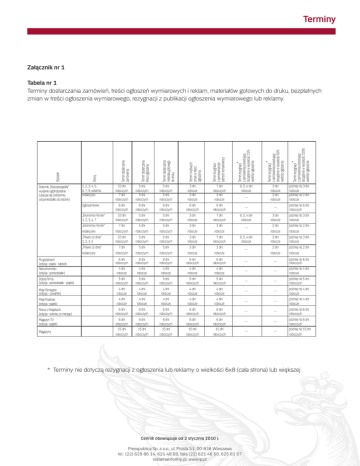 Terminy Załącznik nr 1 ogłoszeniowe „Ekonomia i Rynek” 1, 2, 3, 4, 7 „Ekonomia i Rynek” redakcyjne „Prawo co dnia” 1, 2, 3, 5 „Prawo co dnia” redakcyjne Po godzinach (edycja - piątek - tabloid) Nieruchomości (edycja - poniedziałek) Dobra Firma (edycja - poniedziałek - piątek) Moje Pieniądze (edycja - czwartek) Moje Podróże (edycja - piątek) Rzecz o Książkach (edycja - sobota, co miesiąc) Magazyn TV (edycja - piątek) Magazyny 5 dni roboczych 5 dni roboczych 6 dni roboczych 5 dni roboczych 5 dni roboczych 5 dni roboczych 5 dni roboczych 5 dni roboczych 5 dni roboczych 6 dni roboczych 5 dni roboczych 5 dni roboczych 5 dni roboczych 5 dni roboczych 3 dni robocze 3 dni robocze 6 dni roboczych 3 dni robocze 3 dni robocze 3 dni robocze 3 dni robocze 7 dni roboczych 3 dni robocze 6 dni roboczych 7 dni roboczych 3 dni robocze 7 dni roboczych 3 dni robocze 6 dni roboczych 4 dni robocze 5 dni roboczych 4 dni robocze 4 dni robocze 6 dni roboczych 6 dni roboczych 15 dni roboczych 6 dni roboczych 4 dni robocze 5 dni roboczych 4 dni robocze 4 dni robocze 6 dni roboczych 6 dni roboczych 15 dni roboczych 6 dni roboczych 4 dni robocze 5 dni roboczych 4 dni robocze 4 dni robocze 6 dni roboczych 6 dni roboczych 15 dni roboczych 6 dni roboczych 4 dni robocze 5 dni roboczych 4 dni robocze 4 dni robocze 6 dni roboczych 6 dni roboczych 15 dni roboczych 6 dni roboczych 4 dni robocze 5 dni roboczych 4 dni robocze 4 dni robocze 6 dni roboczych 6 dni roboczych 15 dni roboczych 6, 5, 4 dni robocze 3 dni robocze 2 dni robocze ----- --- 6, 5, 4 dni robocze 3 dni robocze 2 dni robocze 3 dni robocze 2 dni robocze --6, 5, 4 dni robocze ----- --- --- --- --- --- --- --- --- --- --- --- --- --- --- --- Termin rezygnacji * z zamówienia powodujący obciążenie w wysokości 100% wartości ogłoszenia Termin rezygnacji z zamówienia bez żadnych konsekwencji Termin możliwych zmian w treści ogłoszenia Termin dostarczenia materiału gotowego do druku Termin dostarczenia treści ogłoszenia Termin dostarczenia zamówienia 10 dni roboczych 7 dni roboczych 6 dni roboczych 10 dni roboczych 7 dni roboczych 10 dni roboczych 7 dni roboczych Termin rezygnacji * z zamówienia powodujący obciążenie w wysokości 50% wartości ogłoszenia 1, 2, 3, 4, 5, 6, 7, 9, ostatnia redakcyjne Termin rezygnacji* z zamówienia powodujący obciążenie w wysokości 15% wartości ogłoszenia Dziennik „Rzeczpospolita” wydanie ogólnopolskie (ukazuje się codziennie, od poniedziałku do soboty) Strony Wydanie Tabela nr 1 Terminy dostarczania zamówień, treści ogłoszeń wymiarowych i reklam, materiałów gotowych do druku, bezpłatnych zmian w treści ogłoszenia wymiarowego, rezygnacji z publikacji ogłoszenia wymiarowego lub reklamy. później niż 3 dni robocze później niż 2 dni robocze później niż 6 dni roboczych później niż 3 dni robocze później niż 2 dni robocze później niż 3 dni robocze później niż 2 dni robocze później niż 6 dni roboczych później niż 4 dni robocze później niż 5 dni roboczych później niż 4 dni robocze później niż 4 dni robocze później niż 6 dni roboczych później niż 6 dni roboczych później niż 15 dni roboczych * Terminy nie dotyczą rezygnacji z ogłoszenia lub reklamy o wielkości 6x8 (cała strona) lub większej Cennik obowiązuje od 2 stycznia 2010 r. Presspublica Sp. z o.o., ul. Prosta 51, 00-838 Warszawa tel.: (22) 629 86 14, 621 48 69, faks (22) 621 46 58, 625 61 57 [email protected], www.rp.pl Terminy Tabela nr 2 Terminy dostarczania zamówień i rezygnacji z publikacji ogłoszeń drobnych Termin dostarczenia zamówienia Wydanie Dziennik „Rzeczpospolita” wydanie ogólnopolskie Termin rezygnacji z zamówienia bez żadnych konsekwencji Termin rezygnacji z zamówienia powodujący obciążenie w wysokości 100% wartości ogłoszenia poniedziałkowe nie później niż do godz. 16.00 w piątek nie później niż do godz. 16.00 w piątek po godz. 16.00 w piątek wtorkowe nie później niż do godz. 10.00 w poniedziałek nie później niż do godz. 10.00 w poniedziałek po godz. 10.00 w poniedziałek środowe nie później niż do godz. 10.00 we wtorek nie później niż do godz. 10.00 we wtorek po godz. 10.00 we wtorek czwartkowe nie później niż do godz. 10.00 w środę nie później niż do godz. 10.00 w środę po godz. 10.00 w środę piątkowe nie później niż do godz. 10.00 w czwartek nie później niż do godz. 10.00 w czwartek po godz. 10.00 w czwartek sobotnie nie później niż do godz. 10.00 w piątek nie później niż do godz. 10.00 w piątek po godz. 10.00 w piątek Tabela nr 3 Terminy dostarczania zamówień, wkładek i rezygnacji z wkładkowania Wydanie Dziennik „Rzeczpospolita” Termin dostarczenia wkładki Termin dostarczenia zamówienia 2 tygodnie 2 dni robocze przed emisją Termin rezygnacji z zamówienia bez żadnych konsekwencji 2 tygodnie Termin rezygnacji z zamówienia powodujący obciążenie w wysokości 100% wartości wkładkowania później niż 2 tygodnie 1. Podane w tabelach terminy odnoszą się do dat emisji ogłoszenia lub reklamy i są ostateczne. 2. Pod pojęciem „dzień roboczy” rozumie się każdy dzień tygodnia z wyłączeniem sobót, niedziel oraz dni ustawowo wolnych od pracy. 3. W przypadku kiedy dzień tygodnia określony w tabeli nie jest dniem roboczym, ostateczny termin zostaje automatycznie przesunięty na najbliższy poprzedzający wskazany w tabeli dzień roboczy. 4. Terminy podane w tabelach nie odnoszą się do raportów, dodatków i wydań specjalnych „Rzeczpospolitej”. Tabela nr 4 Terminy dostarczania zamówień, materiałów reklamowych oraz rezygnacji z emisji reklamy w „Rzeczpospolitej On Line” Rodzaj materiałów reklamowych i formy reklamy dla bannerów w formacie gif animowany dla niestandardowych form reklamy i dla reklam w formacie flash Termin dostarczenia zamówienia Termin dostarczenia materiałów reklamowych Termin rezygnacji z zamówienia i możliwość dokon