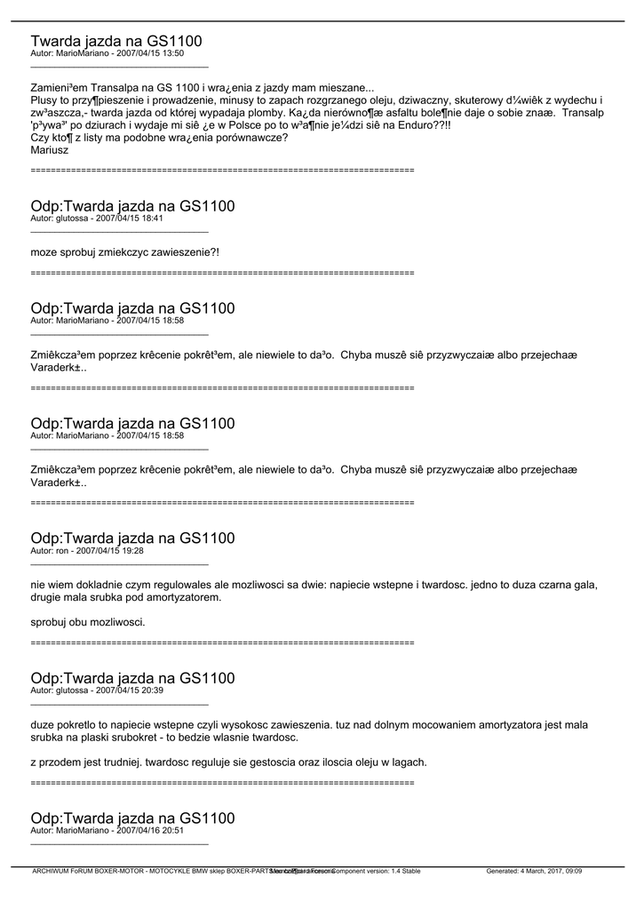 Twarda jazda na GS1100 Autor: MarioMariano - 2007/04/15 13:50 _____________________________________ Zamieni³em Transalpa na GS 1100 i wra¿enia z jazdy mam mieszane... Plusy to przy¶pieszenie i prowadzenie, minusy to zapach rozgrzanego oleju, dziwaczny, skuterowy d¼wiêk z wydechu i zw³aszcza,- twarda jazda od której wypadaja plomby. Ka¿da nierówno¶æ asfaltu bole¶nie daje o sobie znaæ. Transalp 'p³ywa³' po dziurach i wydaje mi siê ¿e w Polsce po to w³a¶nie je¼dzi siê na Enduro??!! Czy kto¶ z listy ma podobne wra¿enia porównawcze? Mariusz ============================================================================ Odp:Twarda jazda na GS1100 Autor: glutossa - 2007/04/15 18:41 _____________________________________ moze sprobuj zmiekczyc zawieszenie?! ============================================================================ Odp:Twarda jazda na GS1100 Autor: MarioMariano - 2007/04/15 18:58 _____________________________________ Zmiêkcza³em poprzez krêcenie pokrêt³em, ale niewiele to da³o. Chyba muszê siê przyzwyczaiæ albo przejechaæ Varaderk±.. ============================================================================ Odp:Twarda jazda na GS1100 Autor: MarioMariano - 2007/04/15 18:58 _____________________________________ Zmiêkcza³em poprzez krêcenie pokrêt³em, ale niewiele to da³o. Chyba muszê siê przyzwyczaiæ albo przejechaæ Varaderk±.. ============================================================================ Odp:Twarda jazda na GS1100 Autor: ron - 2007/04/15 19:28 _____________________________________ nie wiem dokladnie czym regulowales ale mozliwosci sa dwie: napiecie wstepne i twardosc. jedno to duza czarna gala, drugie mala srubka pod amortyzatorem. sprobuj obu mozliwosci. ============================================================================ Odp:Twarda jazda na GS1100 Autor: glutossa - 2007/04/15 20:39 _____________________________________ duze pokretlo to napiecie wstepne czyli wysokosc zawieszenia. tuz nad dolnym mocowaniem amortyzatora jest mala srubka na plaski srubokret - to bedzie wlasnie twardosc. z przodem jest trudniej. twardosc reguluje sie gestoscia oraz iloscia oleju w lagach. ============================================================================ Odp:Twarda jazda na GS1100 Autor: MarioMariano - 2007/04/16 20:51 _____________________________________ ARCHIWUM FoRUM BOXER-MOTOR - MOTOCYKLE BMW sklep BOXER-PARTS.eu MamboBoard czê¶ci i akcesoria Forum Component version: 1.4 Stable Generated: 4 March, 2017, 09:09 Dziêki, pogrzebiê!! ============================================================================ Odp:Twarda jazda na GS1100 Autor: WOjtek - 2007/04/16 21:18 _____________________________________ z przodem jest trudniej. twardosc reguluje sie gestoscia oraz iloscia oleju w lagach. Sorry, ale regulowa³e¶ kiedykolwiek tak telelever ?? przecie¿ tam jest najzwyklejszy element amortyzuj±co-t³umi±cy zwany potocznie amortyzatorem. W przednim widelcu nie ma NIC, co t³umi³oby przep³yw oleju podczas pracy zawieszenia. ============================================================================ Odp:Twarda jazda na GS1100 Autor: glutossa - 2007/04/16 23:10 _____________________________________ rzeczywiscie gestosc oleju nie ma znaczenia, jednakze ilosc jak najbardziej. jako ze jest to naczynie zamkniete wieksza ilosc niescisliwego oleju oznacza mniejsza ilosc scisliwego powietrza. zgadza sie? ============================================================================ Odp:Twarda jazda na GS1100 Autor: morferusz - 2007/04/25 22:20 _____________________________________ A ja zawsze my¶la³em ¿e r1100 jest za miêkki! Szczególnie przód który nie ma regulacji lubi dobiæ na wiêkszej dziurze, polecam sprawdzenie ilo¶ci oleju w przednich lagach, ma byæ po 0,45 l w ka¿dej! Jak jest ma³o to dobija, a gêsto¶æ oleju jest tu akurat bez znaczenia. Polecam wymianê przedniego amora na Ohlinsa z pe³na regulacj±, sam takiego mam i jest wielka ró¿nica, problemem jest tylko cena tego cuda. ;) ============================================================================ Odp:Twarda jazda na GS1100 Autor: gaubege - 2007/05/05 09:08 _____________________________________ ...a co do "skuterowatego" brzmienia,to polecam remusa. . . ============================================================================ Odp:Twarda jazda na GS1100 Autor: ron - 2007/05/05 11:28 _____________________________________ ...a co do "skuterowatego" brzmienia,to polecam remusa. . . bedzie fajnie warczal jak bombowiec ale: - wzrosnie dol - spadnie gora - pali litr wiecej wiec warto sie zastanowic, i tak jezdzisz z zatyczkami. jedyne co ma wymierna wartosc to ze na pewno cie puszki uslysza :D ============================================================================ Odp:Twarda jazda na GS1100 Autor: gaubege - 2007/05/05 19:01 _____________________________________ ARCHIWUM FoRUM BOXER-MOTOR - MOTOCYKLE BMW sklep BOXER-PARTS.eu MamboBoard czê¶ci i akcesoria Forum Component version: 1.4 Stable Generated: 4 March, 2017, 09:09 .. nad ta wymierna wartoscia mozna by podyskutowac. . reszta to prawda. Jednak z nowa rura dolotu, k&n-em i chipem ,od 2t.sie zaczyna,a potem to "szatan nie kogUt" spalanie jw. 5 ; z malym wasikiem pozdrawiam. ============================================================================ Odp:Twarda jazda na GS1100 Autor: MarioMariano - 2007/05/05 22:19 _____________________________________ Zastanawiam sie powa¿nie nad wydechem, czy Remus i Leo Vince dadza podobny efekt? 2 tys PLN,- to bolesne... Mój GS pali ok 6 litrów - czy z innym t³umikiem bêdzie pali³ 7 lt??!! Je¿d¿ê glównie po mie¶cie i podmiejsko, wiêc bez zatyczek, to ¿e samochody bêd± s³ysza³y jest cenne, ale cena gra rolê.. :blink: Pozdrawiam, Mariusz ============================================================================ Odp:Twarda jazda na GS1100 Autor: ron - 2007/05/06 11:53 _____________________________________ Mój GS pali ok 6 litrów - 