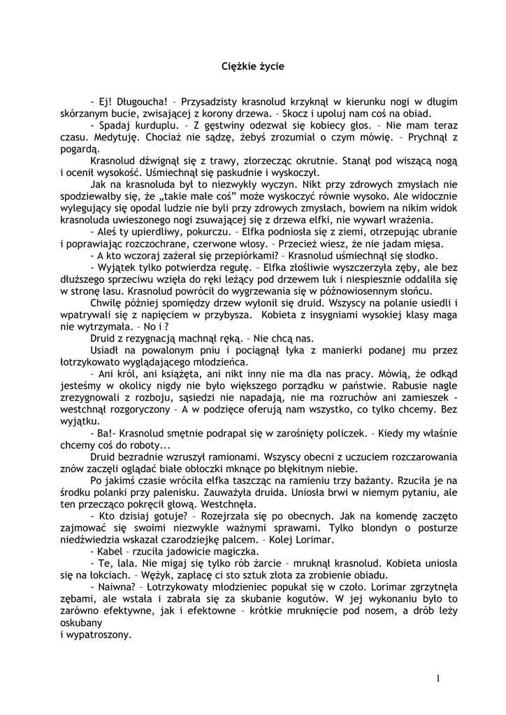 Ciężkie życie - Ej! Długoucha! – Przysadzisty krasnolud krzyknął w kierunku nogi w długim skórzanym bucie, zwisającej z korony drzewa. – Skocz i upoluj nam coś na obiad. - Spadaj kurduplu. – Z gęstwiny odezwał się kobiecy głos. – Nie mam teraz czasu. Medytuję. Chociaż nie sądzę, żebyś zrozumiał o czym mówię. – Prychnął z pogardą. Krasnolud dźwignął się z trawy, złorzecząc okrutnie. Stanął pod wiszącą nogą i ocenił wysokość. Uśmiechnął się paskudnie i wyskoczył. Jak na krasnoluda był to niezwykły wyczyn. Nikt przy zdrowych zmysłach nie spodziewałby się, że „takie małe coś” może wyskoczyć równie wysoko. Ale widocznie wylegujący się opodal ludzie nie byli przy zdrowych zmysłach, bowiem na nikim widok krasnoluda uwieszonego nogi zsuwającej się z drzewa elfki, nie wywarł wrażenia. - Aleś ty upierdliwy, pokurczu. – Elfka podniosła się z ziemi, otrzepując ubranie i poprawiając rozczochrane, czerwone włosy. – Przecież wiesz, że nie jadam mięsa. - A kto wczoraj zażerał się przepiórkami? – Krasnolud uśmiechnął się słodko. - Wyjątek tylko potwierdza regułę. – Elfka złośliwie wyszczerzyła zęby, ale bez dłuższego sprzeciwu wzięła do ręki leżący pod drzewem łuk i niespiesznie oddaliła się w stronę lasu. Krasnolud powrócił do wygrzewania się w późnowiosennym słońcu. Chwilę później spomiędzy drzew wyłonił się druid. Wszyscy na polanie usiedli i wpatrywali się z napięciem w przybysza. Kobieta z insygniami wysokiej klasy maga nie wytrzymała. – No i ? Druid z rezygnacją machnął ręką. – Nie chcą nas. Usiadł na powalonym pniu i pociągnął łyka z manierki podanej mu przez łotrzykowato wyglądającego młodzieńca. – Ani król, ani książęta, ani nikt inny nie ma dla nas pracy. Mówią, że odkąd jesteśmy w okolicy nigdy nie było większego porządku w państwie. Rabusie nagle zrezygnowali z rozboju, sąsiedzi nie napadają, nie ma rozruchów ani zamieszek westchnął rozgoryczony – A w podzięce oferują nam wszystko, co tylko chcemy. Bez wyjątku. - Ba!- Krasnolud smętnie podrapał się w zarośnięty policzek. – Kiedy my właśnie chcemy coś do roboty... Druid bezradnie wzruszył ramionami. Wszyscy obecni z uczuciem rozczarowania znów zaczęli oglądać białe obłoczki mknące po błękitnym niebie. Po jakimś czasie wróciła elfka taszcząc na ramieniu trzy bażanty. Rzuciła je na środku polanki przy palenisku. Zauważyła druida. Uniosła brwi w niemym pytaniu, ale ten przecząco pokręcił głową. Westchnęła. - Kto dzisiaj gotuje? – Rozejrzała się po obecnych. Jak na komendę zaczęto zajmować się swoimi niezwykle ważnymi sprawami. Tylko blondyn o posturze niedźwiedzia wskazał czarodziejkę palcem. – Kolej Lorimar. - Kabel – rzuciła jadowicie magiczka. - Te, lala. Nie migaj się tylko rób żarcie – mruknął krasnolud. Kobieta uniosła się na łokciach. – Wężyk, zapłacę ci sto sztuk złota za zrobienie obiadu. - Naiwna? – Łotrzykowaty młodzieniec popukał się w czoło. Lorimar zgrzytnęła zębami, ale wstała i zabrała się za skubanie kogutów. W jej wykonaniu było to zarówno efektywne, jak i efektowne – krótkie mruknięcie pod nosem, a drób leży oskubany i wypatroszony. 1 - Tylko nie piecz ich magią, bo zawsze przypalisz – upomniał ją druid. Kobieta posłała mu krzywe spojrzenie, ale posłusznie nabiła bażanty na rożen i rozpaliła pod nimi ogień. Wróciła na swoje miejsce między stokrotkami i od czasu do czasu ruchem palca obracała skwierczący obiad. Wszyscy pogrążyli się w ciszy i lenistwie. Po kwadransie krasnolud nie wytrzymał. Zerwał się i dzikim wzrokiem potoczył wokoło. – Dosyć!!! – wrzasnął. – Tak dłużej nie może być!!! Jak tak dalej pójdzie, to niedługo zmienimy się w sflaczałą bandę ex-bohaterów. Spójrzcie na siebie. Lorimar – wskazał na magiczkę – wielka czarodziejka, która zniszczyła Sorrena Nekromantę, a używa swojej magii do przyrządzania posiłków. Errik - skierował palec w stronę potężnego blondyna – słynny wojownik Północy, który codziennie rano przed śniadaniem dla rozgrzewki rozprawiał się z bandą śnieżnych trolli, pozwala swojemu toporowi rdzewieć w trawie. - O wypraszam sobie! On wcale nie rdzewieje! – obruszył się Errik. – Te parę kropek to ślady po muchach. Upstrzyły go, france. - Leach, potężny druid i uzdrowiciel, dla którego rośliny nie mają tajemnic, zbiera obecnie zioła do przyprawiania pieczeni. Druid nagle zajął się strzepywaniem nieistniejącego kurzu ze swojej śnieżnobiałej szaty. - Wężyk. – Przyszła kolej i na łotrzyka. – Największy złodziej, jakiego znam i nielichy nożownik. Jedyne co robi teraz, to kłóci się z Lorimar i dłubie swoim sztyletem w zębach. Kto go zna, ten wie, że skoro za sto sztuk złota nie ruszył dupy, to jest z nim już bardzo źle. Wężyk rozłożył ręce bezradnie. - No i oczywiście nasza piękna elfka, Mara i jej dwa śpiewające miecze, na których dźwięk wrogowie bledli i kolana się im uginały. Artystka w sztuce walki. Co robi teraz? „Medytuje”. Jemy od dwóch dni tylko ptactwo, bo nie chce się jej iść dalej, niż na sąsiednią polanę, gdzie ptaki codziennie przylatują na żer, ponieważ myśląca przyszłościowo Mara dokarmia je tam resztkami jedzenia. Kurnik sobie zrobiła! – prychnął z niesmakiem krasnolud. - A i ja sam nie jestem lepszy. Wielki krasnoludzki wojownik, wychowany przez kapłanów Tabel–Motha. Legenda Gór Miedzianych, która pozwala, żeby towarzystwo mu się rozleniwiło i popadło w absolutne nieróbstwo. Sam Rikker leżący brzuchem do góry i rzucający szyszkami w członków swojej drużyny, to zaiste żałosny widok. - Wiesz dobrze, Rikk, że w pełni się z tobą zgadzamy i głupio nam z tego powodu, że jest jak jest. – Mara popatrzyła krasnoludowi prosto w oczy. – Ale co mo