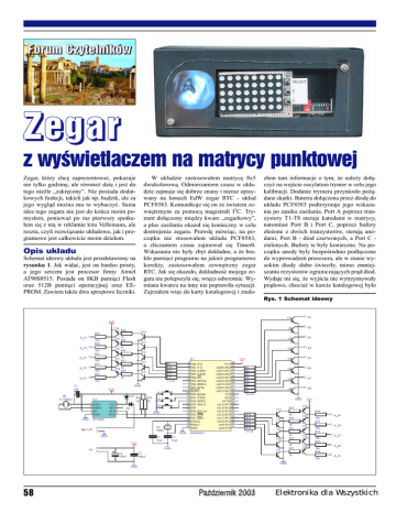 F orum Czytelników Zegar z wyświetlaczem na matrycy punktowej Zegar, który chcę zaprezentować, pokazuje nie tylko godzinę, ale również datę i jest do tego nieźle „zakręcony”. Nie posiada dodatkowych funkcji, takich jak np. budzik, ale za jego wygląd można mu to wybaczyć. Sama idea tego zegara nie jest do końca moim pomysłem, ponieważ po raz pierwszy spotkałem się z nią w reklamie kitu Vellemana, ale reszta, czyli rozwiązanie układowe, jak i programowe jest całkowicie moim dziełem. Opis układu Schemat ideowy układu jest przedstawiony na rysunku 1. Jak widać, jest on bardzo prosty, a jego sercem jest procesor firmy Atmel AT90S8515. Posiada on 8KB pamięci Flash oraz 512B pamięci operacyjnej oraz EEPROM. Zawiera także dwa sprzętowe liczniki. W układzie zastosowałem matrycę 8x5 dwukolorową. Odmierzaniem czasu w układzie zajmuje się dobrze znany i nieraz opisywany na łamach EdW zegar RTC - układ PCF8583. Komunikuje się on ze światem zewnętrznym za pomocą magistrali I2C. Trymetr dołączony między kwarc „zegarkowy”, a plus zasilania okazał się konieczny w celu dostrojenia zegara. Prawdę mówiąc, na początku nie stosowałem układu PCF8583, a zliczaniem czasu zajmował się Timer0. Wskazania nie były zbyt dokładne, a że brakło pamięci programu na jakieś programowe korekty, zastosowałem zewnętrzny zegar RTC. Jak się okazało, dokładność mojego zegara nie polepszyła się, wręcz odwrotnie. Wymiana kwarcu na inny nie poprawiła sytuacji. Zajrzałem więc do karty katalogowej i znala- złem tam informacje o tym, że należy dołączyć na wejście oscylatora trymer w celu jego kalibracji. Dodanie trymera przyniosło pożądane skutki. Bateria dołączona przez diodę do układu PCF8583 podtrzymuje jego wskazania po zaniku zasilania. Port A poprzez tranzystory T1-T8 steruje katodami w matrycy, natomiast Port B i Port C, poprzez bufory złożone z dwóch tranzystorów, sterują anodami, Port B - diod czerwonych, a Port C zielonych. Bufory te były konieczne. Na początku anody były bezpośrednio podłączone do wyprowadzeń procesora, ale w stanie wysokim diody słabo świeciły, mimo zmniejszania rezystorów ograniczających prąd diod. Wydaje mi się, że wyjścia nie wytrzymywały prądowo, chociaż w karcie katalogowej było Rys. 1 Schemat ideowy 58 E l e k t ro n i k a d l a Ws z y s t k i c h Forum Czytelników napisane, że wydajność prądowa wyjść to 20mA. Może miały na to wpływ też inne czynniki. Próbując rozwiązać ten problem, sprawdzałem również bufory CD4050 i o ile w stanie wysokim wszystko było dobrze, to w stanie niskim działy się trochę dziwne rzeczy, i nie była to bynajmniej wina niepodłączonych wejść. W końcu zdały rezultat zastosowane tu dwutranzystorowe bufory, niestety zwiększając znacznie liczbę tranzystorów. Przyciski S1...S3 służą do sterowania funkcjami zegara, ale to zostanie opisane nieco później. To tyle jeśli chodzi o sprawy sprzętowe. Czas przejść do programu. Program Zajmuje on prawie 8KB, dlatego omówię tylko główną zasadę jego działania. Tak naprawdę w programie zawarte są cztery tablice: - dwie bazowe i dwie wyświetlaczy (dwie są dla koloru czerwonego, a dwie dla zielonego). Mamy więc tablicę bazową. Została ona tak nazwana, ponieważ to w niej jest zapisana graficzna interpretacja danych, które chcemy przedstawić, w tym przypadku datę i godzinę. Każda cyfra ma przypisaną sobie stałą pozycję w tablicy odpowiedniego koloru i tak np. cyfra jedności minut ma pozycje 37, 38 i 39 w tablicy zielonej. Pozostała jeszcze do omówienia druga tablica (a raczej, jak napisałem powyżej - dwie) tablica wyświetlacza. Posiada ona tylko osiem komórek, ponieważ każda jest przypisana do jednej kolumny (katody) w matrycy i w danej komórce jest zapisana informacja o tym, co Rys. 2 Rys. 3 E l e k t ro n i k a d l a Ws z y s t k i c h ma wyświetlać dana kolumna. I tu dochodzimy do sedna sprawy, a mianowicie przewijania się godziny na wyświetlaczu. Chcąc przesunąć obraz na wyświetlaczu np. o jedną pozycję w prawo, zwiększmy pozycje zapisane w tablicach wyświetlaczy o jeden. Musimy to zrobić dla obu tablic jednocześnie, ponieważ obraz się „rozjedzie”. Osobne tablice dla obu kolorów są potrzebne, ponieważ w ten sposób łatwo uzyskać np. kolor pomarańczowy, wpisując do tablic bazowych te same wartości lub wpisując do jednej np. wartość 2 (01 w systemie dwójkowym), a do drugiej dopełnienie do 31 (11111), czyli 29 (10111) uzyskamy tło dla danego znaku. Obsługę wyświetlacza zapewnia Timer0 zliczający impulsy z wewnętrznego oscylatora po wstępnym podzieleniu przez 64. Po przepełnieniu wywołuje przerwanie. W czasie przerwania jest załączana następna kolumna matrycy i na porty B i C są przepisywane odpowiednie dane z tablicy bazowej wskazane przez tablice wyświetlaczy. Zwiększana jest także zmienna odpowiedzialna za prędkość przesuwania danych na wyświetlaczu. Polega to na tym, że zmienna ta jest porównywana z wartością ustawioną przez użytkownika i gdy są sobie równe, następuje skok do podprogramu odpowiedzialnego za zmianę pozycji w tablicach wyświetlaczy, a tym samym przesunięcie obrazu wyświetlanego przez matrycę. Główna pętla programu odczytuje datę i godzinę z układu PCF8583. Informacje te są zapisane w kodzie BCD, co w tym przypadku okazało się bardzo przydatne. Ponieważ program wpisuje liczby do tablicy bazowej jako poszczególne cyfry (osobno jedności i dziesiątki), należy liczby zapisać nie dość, że dziesiętnie, to jeszcze rozdzielić na poszczególne cyfry. Ponieważ w BASCOM-ie bez problemów można przepisywać poszczególne bity z jednej liczby do drugiej, cała procedura jest bardzo prosta. Uzyskane w ten sposób cyfry są dalej przepisywane do tablicy bazowej. Odczytane liczby i tak są następnie przekształcane na typową postać dziesiętną. Ciąg dalszy na 