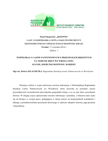 Panel Ekspertów „ROZWÓJ” LASY I GOSPODARKA LEŚNA JAKO INSTRUMENTY EKONOMICZNEGO I SPOŁECZNEGO ROZWOJU KRAJU Termin: 17 września 2014 r. SESJA 1 WSPÓŁPRACA LASÓW PAŃSTWOWYCH Z PRZEMYSŁEM DRZEWNYM NA TERENIE RDLP WE WROCŁAWIU: SZANSE, KIERUNKI ROZWOJU, BARIERY Mgr inż. Robert SZLACHETKA, Regionalna Dyrekcja Lasów Państwowych we Wrocławiu Niniejszy referat w części pierwszej zawiera informacje o Dolnośląskiej Regionalnej Dyrekcji Lasów Państwowych we Wrocławiu, które pozwolą na poznanie zarysu przyrodniczych uwarunkowań prowadzenia gospodarki leśnej, a co za tym idzie, pozyskania drewna. W drugiej części opracowania zawarto informacje i postulaty, z którymi autor styka się na bieżąco w swojej pracy, polegającej w dużej mierze na bezpośrednich kontaktach i dialogu z przedstawicielami przemysłu drzewnego w zakresie zakupów drewna, jego pomiaru i klasyfikacji. 1.1 Regionalna Dyrekcja Lasów Państwowych we Wrocławiu – informacje ogólne. Lasy Regionalnej Dyrekcji Lasów Państwowych (RDLP) we Wrocławiu obejmują teren województwa dolnośląskiego, oraz – w niewielkim stopniu (ok. 1%) – teren sąsiednich województw: opolskiego, wielkopolskiego i lubuskiego. Ogólna powierzchnia zarządzana przez RDLP we Wrocławiu wg stanu na koniec 2013 r. wynosiła 557 712,25 ha, z czego 540 263,93 ha stanowiła powierzchnia leśna, a 17 448,32 ha powierzchnia nieleśna (grunty rolne, wody, nieużytki, tereny osiedlowe, komunikacyjne, itp.). Wszystkie lasy Dolnego Śląska zajmują powierzchnię około 560 tys. ha, z czego 93% znajduje się w zarządzie RDLP we Wrocławiu. Pozostałe 7% to lasy prywatne, lasy gminne, lasy komunalne, lasy w Zasobie Agencji Nieruchomości Rolnych oraz lasy parków narodowych (1,7%). Lesistość regionu wynosi blisko 29%, lokalnie waha się od 9% w nadleśnictwie Henryków do 86% w nadleśnictwie Ruszów. Największe zwarte obszary leśne stanowią Bory Dolnośląskie, położone w północno – zachodniej, nizinnej części RDLP. Duże kompleksy leśne, lecz o zdecydowanie innym charakterze, pokrywają położone w południowej części zasięgu górskie pasma Sudetów. Pozostały obszar to przede wszystkim tereny o intensywnym 2 zagospodarowaniu rolniczym – lasy występują tu w mniejszych, zwykle rozdrobnionych kompleksach. W strukturze gatunkowej dolnośląskich drzewostanów dominują gatunki iglaste – stanowią 72,3% powierzchni drzewostanów, natomiast gatunki liściaste zajmują 27,7% powierzchni. Do głównych gatunków lasotwórczych należą: sosna i modrzew - 47%, świerk 25%, dąb, jesion, klon - razem 13%, brzoza i grab - 5%, buk - 5%, olsza - 3%. Według danych za rok 2013 zasoby drzewne RDLP Wrocław wynoszą 135 993 tys. m3 brutto, zapas drewna na 1 ha wynosi 265 m3, przeciętny wiek lasów w RDLP we Wrocławiu osiąga 63 lata, a roczny rozmiar pozyskania grubizny przekroczył 2 800 tys. m3. RDLP we Wrocławiu posiada dwa międzynarodowe certyfikaty dobrej gospodarki leśnej: certyfikat Forest Stewardship Council FSC oraz certyfikat gospodarki leśnej PEFC (Programme for the Endorsment of Forest Certification). 1.2 Pozyskanie drewna, dane liczbowe za lata 2012 – 2013 oraz za pierwsze cztery miesiące roku 2014, zasady planowania i realizacji pozyskania i sprzedaży. Pozyskanie drewna w 2012 r. Wybrane sortymenty Plan Wykonanie Drewno ogółem 2 797 000 2 826 300 Drewno WA0+WB0+WC0+WD iglaste 1 013 200 994 300 Drewno S2A+S2B sosna, modrzew 447 500 469 900 Drewno S2A+S2B świerk, jodła, PI 326 500 389 400 Drewno WA0+WB0+WC0+WD liściaste 230 400 187 300 Drewno S2A+S2B liściaste 299 700 294 200 3 Pozyskanie drewna w 2013 r. Wybrane sortymenty Plan Wykonanie Drewno ogółem 2 858 100 2 887 200 Drewno W0+WK+WD iglaste 966 800 959 700 Drewno S2A+S2B sosna, modrzew 475 400 504 700 Drewno S2A+S2B świerk, jodła, PI 314 000 437 300 Drewno WA0+WB0+WC0+WD liściaste 240 100 191 900 Drewno S2A+S2B liściaste 326 000 326 900 Pozyskanie drewna w 2014 r. Wybrane sortymenty Plan Wykonanie do końca kwietnia 2014 r. Drewno ogółem 3 017 424 1 212 360 Drewno W0+WK+WD iglaste 1 004 721 375 773 Drewno S2A+S2B sosna, modrzew 523 899 221 803 Drewno S2A+S2B świerk, jodła, PI 336 671 183 783 Drewno WA0+WB0+WC0+WD liściaste 233 498 82 572 Drewno S2A+S2B liściaste 347 471 151 335 Drewno w dolnośląskiej RDLP pozyskiwane jest w ilościach wynikających z wielkości zadań gospodarczych przewidzianych do realizacji w dziesięcioletnich Planach Urządzenia Lasu, sporządzonych dla każdego nadleśnictwa i zatwierdzonych przez Ministra Środowiska. W zakresie pozyskania, na kolejne lata kalendarzowe planuje się realizację 1/10 zakładanego planu dziesięcioletniego wynikającego z potrzeb hodowlanych, przyjętego w skali nadleśnictwa. Po uzgodnieniu zaplanowanego rozmiaru pozyskania z RDLP oraz zatwierdzeniu go przez Dyrektora Regionalnej Dyrekcji LP we Wrocławiu przeprowadzane są szacunki brakarskie, dające w efekcie informację o spodziewanych ilościach surowca drzewnego w podziale na konkretne sortymenty. Wielkość powyższa, po wyłączeniu drewna 4 na potrzeby własne jednostek LP (niezbędnego do realizacji planowanych zadań), stanowi podstawę do sporządzenia planu sprzedaży. Zużycie na potrzeby własne to mniej niż 1% pozyskiwanego drewna, pozostały surowiec pozostawiany jest w całości do dyspozycji kupujących. Zgodnie z obowiązującymi unormowaniami, przedsiębiorcy zainteresowani zakupem surowca drzewnego, mogą uczestniczyć w następujących procedurach sprzedaży: a) sprzedaży ofertowej w Portalu Leśno – Drzewnym z uwzględnieniem wielkości zakupu drewna (tzw. historii sprzedaży), b) sprzedaży ofertowej w Portalu Leśno – Drzewnym dla przedsiębiorców realizujących nowe inwestycje, c) systemowych aukcjach internetowych w aplikacji „e-drewno”, d) aukcjach internetowych w aplikacji „e-drewno”, e) aukcjach i submisjach, f) negocjacjach handlowych, g) na podstawie cennika sprzeda