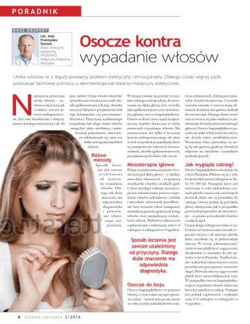 PORADNIK NASZ EKSPERT Lek. med. Przemysław Styczeń, lekarz medycyny estetycznej, PROFEMED Medycyna Estetyczna Warszawa Osocze kontra wypadanie włosów Utrata włosów to z reguły poważny problem estetyczny i emocjonalny. Dlatego coraz więcej osób poszukuje fachowej pomocy u dermatologa lub lekarza medycyny estetycznej. N ajczęstszą przyczyną utraty włosów – zarówno u mężczyzn, jak i u kobiet – jest tzw. łysienie androgenetyczne. Jest ono dziedziczne i dotyczy prawie każdego mężczyzny i ok. 40 proc. kobiet. Utrata włosów może być spowodowana również przez wiele chorób ogólnoustrojowych (np. choroby tarczycy) lub przez przyjmowane leki (np. hormonalne czy przeciwmiażdżycowe). Przyczyną nadmiernego wypadania lub złego stanu włosów mogą być także niedobory i nietolerancje pokarmowe, intensywne odchudzanie się, stres czy obfite miesiączki (niedobór żelaza). Różne metody Sposób leczenia jest zawsze uzależniony od przyczyny wypadania włosów. Dlatego tak duże znaczenie ma odpowiednia diagnostyka i postawienie właściwego rozpoznania. W terapii stosuje się przede wszystkim różnego rodzaju płyny do stosowania na skórę głowy, tzw. wcierki, leki ogólnoustrojowe oraz mezoterapię igłową i osocze bogatopłytkowe. Osocze to dosyć nowa opcja terapeutyczna, bardzo skuteczna w wielu postaciach wypadania włosów. Ma zastosowanie nie tylko w leczeniu łysienia androgenetycznego, ale także w tych wszystkich przypadkach, które są następstwem zaburzeń hormonalnych, chorób ogólnoustrojowych, przyjmowanych leków lub stresu. cji uczuleniowych. Zabieg jest naturalny i bardzo bezpieczny. Czynniki wzrostu zawarte w osoczu mają silniejsze działanie niż gotowy koktajl do mezoterapii. Dlatego skuteczność osocza ocenia się jako większą w porównaniu do tradycyjnej mezoterapii igłowej. Osocze bogatopłytkowe posiada nie tylko właściwości lecznicze, ale działa także profilaktycznie. Wzmacnia włosy i powoduje, że stają się one gęstsze, grubsze i bardziej odporne na działanie czynników uszkadzających. Mezoterapia igłowa Jak wygląda zabieg? Polega na podawaniu preparatów leczniczych pod skórę głowy – w okolice mieszków włosowych – za pomocą strzykawki i bardzo cienkich igieł. Celem każdego rodzaju mezoterapii jest zahamowanie procesu wypadania włosów, pobudzenie cebulek i mieszków włosowych, przedłużenie fazy wzrostu włosa (anagenu), stymulacja porostu grubszych łodyg włosów oraz normalizacja wydzielania sebum. Podstawą sukcesu jest zaplanowanie i wykonanie serii 4–6 zabiegów w odstępach co 4 tygodnie. Sposób leczenia jest zawsze uzależniony od przyczyny. Dlatego duże znaczenie ma odpowiednia diagnostyka. Osocze do boju Osocze bogatopłytkowe to preparat własny, z czym wiąże się jego ogromna zaleta – stosowanie go nie niesie ze sobą ryzyka jakichkolwiek reak- 8 blisko zdrowia 3/2016 Osocze bogatopłytkowe otrzymuje się z krwi Pacjenta. Pobiera się ją z żyły bezpośrednio przed zabiegiem w ilości 10–180 ml. Następnie krew jest wirowana w celu oddzielenia cennych płytek i osocza od czerwonych krwinek, które nie są potrzebne do zabiegu. Osocze podaje się pod skórę głowy identycznie jak w przypadku gotowych preparatów do mezoterapii – za pomocą strzykawki i bardzo cienkich igieł. Cena jednego zabiegu jest różna w zależności od zastosowanej metody separacji osocza i od stężenia płytek, które uzyskuje się w podawanym osoczu. W wersji „ekonomicznej” zawiera ono płytki krwi zagęszczone dwukrotnie w stosunku do ich stężenia w krwi Pacjenta. Najdroższe, ale i najbardziej skuteczne jest osocze pozyskiwane przy pomocy zestawów Angel. Pozwala ono na zagęszczenie płytek krwi nawet kilkanaście razy. W przypadku osocza bogatopłytkowego w wypadaniu włosów skuteczny bywa już pojedynczy zabieg. Najlepiej jest jednak zaplanować i wykonać serię 4–6 zabiegów w odstępach co 4 tygodnie.