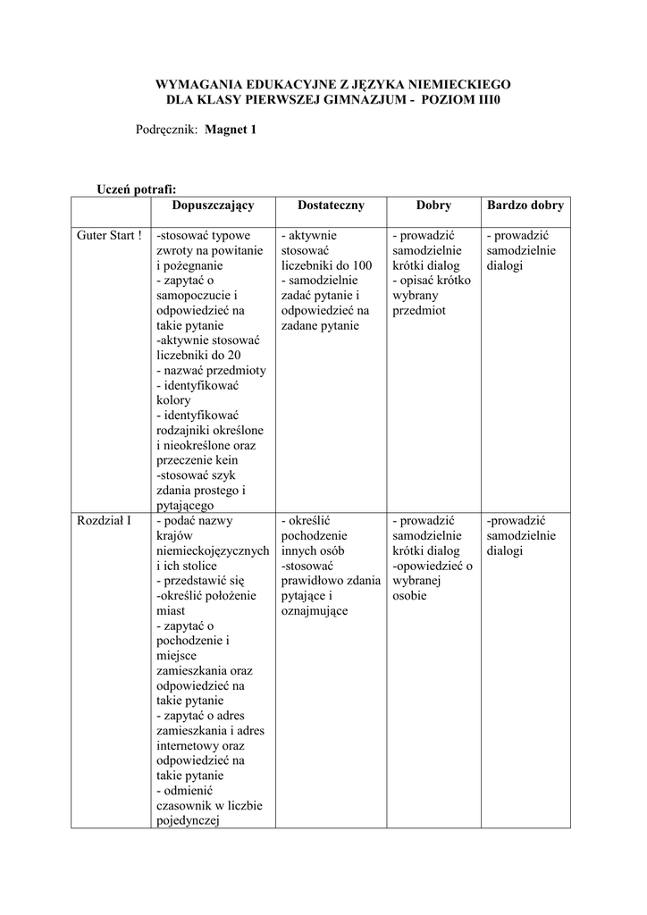 WYMAGANIA EDUKACYJNE Z JĘZYKA NIEMIECKIEGO DLA KLASY PIERWSZEJ GIMNAZJUM - POZIOM III0 Podręcznik: Magnet 1 Uczeń potrafi: Dopuszczający Guter Start ! Rozdział I -stosować typowe zwroty na powitanie i pożegnanie - zapytać o samopoczucie i odpowiedzieć na takie pytanie -aktywnie stosować liczebniki do 20 - nazwać przedmioty - identyfikować kolory - identyfikować rodzajniki określone i nieokreślone oraz przeczenie kein -stosować szyk zdania prostego i pytającego - podać nazwy krajów niemieckojęzycznych i ich stolice - przedstawić się -określić położenie miast - zapytać o pochodzenie i miejsce zamieszkania oraz odpowiedzieć na takie pytanie - zapytać o adres zamieszkania i adres internetowy oraz odpowiedzieć na takie pytanie - odmienić czasownik w liczbie pojedynczej Dostateczny Dobry Bardzo dobry - aktywnie stosować liczebniki do 100 - samodzielnie zadać pytanie i odpowiedzieć na zadane pytanie - prowadzić samodzielnie krótki dialog - opisać krótko wybrany przedmiot - prowadzić samodzielnie dialogi - określić pochodzenie innych osób -stosować prawidłowo zdania pytające i oznajmujące - prowadzić samodzielnie krótki dialog -opowiedzieć o wybranej osobie -prowadzić samodzielnie dialogi Rozdział II Rozdział III Rozdział IV -nazwać sposoby spędzenia czasu wolnego -zapytać o zainteresowania i hobby oraz odpowiedzieć na takie pytanie - odmieniać czasowniki w liczbie pojedynczej i mnogiej - identyfikować zaimki dzierżawcze -identyfikować szyk przestawny w zdaniu oznajmującym -wyrazić życzenie poprzez konstrukcję ich móchte -nazwać członków rodziny - udzielić informacji na temat swojej rodziny - przedstawić swoją rodzinę - nazwać zwierzątka domowe - określić przynależność za pomocą zaimków dzierżawczych - odmienić czasowniki sein oraz haben -identyfikować przeczenie kein - wymienić przymiotniki określające przyjaciół - przedstawić przyjaciela - wymienić miejsca spotkań przyjaciół - odpowiedzieć na - opowiedzieć krótko o swoich zainteresowaniach, hobby i czasie wolnym - wyrazić upodobanie -wyrazić opinię na temat sposobów spędzania czasu wolnego - prowadzić dialogi wg wzoru - opowiadać o swoim hobby i czasie wolnym - opowiadać o hobby oraz sposobach spędzania czasu wolnego innych osób w klasie - prowadzić samodzielnie dialogi - rozmawiać samodzielnie na temat innych osób w klasie wykorzystując poznane słownictwo - opisać swoją rodzinę - prowadzić dialogi wg wzoru na temat rodziny i zwierzątka domowego - określić przynależność za pomocą przyimka von - stosować liczbę mnogą rzeczowników - negować zdanie stosując przeczenie kein - opowiedzieć o wybranej osobie na podstawie notatek -scharakteryzować przyjaciela - opisać paczkę przyjaciół - przekazać informacje o innych osobach -opisać wybraną rodzinę -opisać własną rodzinę , wykorzystując fotografię - opowiedzieć o własnym zwierzątku domowym - prowadzić samodzielnie rozmowę na temat rodziny - prowadzić samodzielnie rozmowę na temat zwierzątka domowego - opowiedzieć o swoim przyjacielu -stosować przyimki lokalne z biernikiem i celownikiem - opowiedzieć - opowiedzieć samodzielnie o swoim przyjacielu -prowadzić wywiad z kolegami i przedstawić jego wyniki w Rozdział V Rozdział VI W-Fragen - rozróżniać przyimki wymagające użycia biernika i celownika - odmieniać czasownik w liczbie pojedynczej i mnogiej - określić lokalizację szkoły - opisać czynności uczniów w klasie - potwierdzić lub zanegować informację -nazwać przedmioty szkolne - wyrazić preferencje i upodobania szkolne -nazwać dni tygodnia - podać plan lekcji w danym dniu - stosować formę grzecznościową -identyfikować rzeczowniki złożone -nazwać przybory szkolne - nazwać typowe czynności szkolne - odpowiedzieć twierdząco lub przecząco na proste pytania -identyfikować zaimki wskazujące der, die, das Rozdział VII - nazwać produkty spożywcze i potrawy - zapytać o upodobania żywieniowe i odpowiedzieć na takie pytanie - zamówić potrawę na podstawie karty dań - podać cenę krótko o miejscach spotkań młodzieży klasie - prowadzić samodzielnie rozmowę o swoich kolegach -udzielić wywiadu, odpowiadając na proste pytania -przygotować listę pytań do wywiadu z nauczycielem - podać tygodniowy plan zajęć szkolnych - opowiedzieć o swojej szkole - opowiedzieć o swoich zajęciach szkolnych - prawidłowo stosować okoliczniki czasu - wyrazić pozytywną i negatywną opinię o przedmiotach szkolnych -prowadzić samodzielnie wywiad o szkole z kolegami z klasy -prowadzić wywiad z nauczycielem i zaprezentować jego wyniki - nazwać pomieszczenia szkolne - określić przynależność przedmiotów i zapytać o nią - opowiedzieć krótko wg wzoru o szkole -opisać samodzielnie czynności podczas lekcji - prawidłowo stosować zaimki wskazujące i rodzajniki rzeczowników - wyrazić własne preferencje żywieniowe w ciągu dnia - opowiedzieć krótko o swoich posiłkach - prowadzić dialog wg wzoru na temat posiłków - prowadzić dialog w restauracji na podstawie karty dań - prezentować swój jadłospis - opowiedzieć samodzielnie o swojej szkole - prowadzić samodzielnie rozmowę na temat własnej szkoły i przedmiotów w plecaku szkolnym - opowiedzieć o zasadach zdrowego odżywiania się - samodzielnie rozmawiać na temat posiłków Rozdział VIII produktów - odmienić czasownik mógen - odmienić wybrane czasowniki nieregularne - nazwać części garderoby - opisać części własnej garderoby - odmienić czasownik gefallen - identyfikować zaimki osobowe - wyrazić opinię o częściach garderoby - identyfikować czasowniki rozdzielnie złożone - prowadzić krótką rozmowę w sklepie wg wzoru - opisać garderobę wybranej osoby w klasie -prowadzić dialogi w sklepie -stosować prawidłowo czasowniki rozdzielnie złożone - wyrazić swoją opinię o modzie - prowadzić samodzielnie dialog na temat m