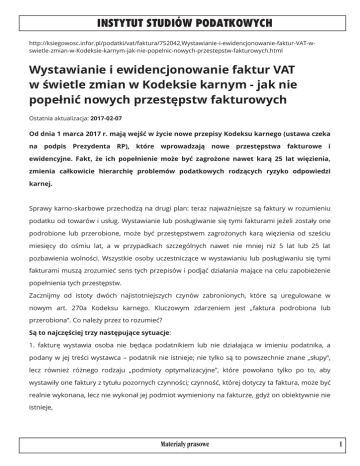 INSTYTUT STUDIÓW PODATKOWYCH http://ksiegowosc.infor.pl/podatki/vat/faktura/752042,Wystawianie-i-ewidencjonowanie-faktur-VAT-wswietle-zmian-w-Kodeksie-karnym-jak-nie-popelnic-nowych-przestepstw-fakturowych.html Wystawianie i ewidencjonowanie faktur VAT w świetle zmian w Kodeksie karnym - jak nie popełnić nowych przestępstw fakturowych Ostatnia aktualizacja: 2017-02-07 Od dnia 1 marca 2017 r. mają wejść w życie nowe przepisy Kodeksu karnego (ustawa czeka na podpis Prezydenta RP), które wprowadzają nowe przestępstwa fakturowe i ewidencyjne. Fakt, że ich popełnienie może być zagrożone nawet karą 25 lat więzienia, zmienia całkowicie hierarchię problemów podatkowych rodzących ryzyko odpowiedzi Wystawianie i ewidencjonowanie faktur VAT w świetle zmian w Sprawy karno-skarbowe przechodzą na drugi plan: teraznie najważniejsze są faktury w rozumieniu Kodeksie karnym - jak popełnić podatku od towarów i usług. Wystawianie lub posługiwanie się tymi fakturami jeżeli zostały one nowych przestępstw fakturowych karnej. podrobione lub przerobione, może być przestępstwem zagrożonych karą więzienia od sześciu miesięcy do ośmiu lat, a w przypadkach szczególnych nawet nie mniej niż 5 lat lub 25 lat pozbawienia wolności. Wszystkie osoby uczestniczące w wystawianiu lub posługiwaniu się tymi fakturami muszą zrozumieć sens tych przepisów i podjąć działania mające na celu zapobieżenie popełnienia tych przestępstw. Zacznijmy od istoty dwóch najistotniejszych czynów zabronionych, które są uregulowane w nowym art. 270a Kodeksu karnego. Kluczowym zdarzeniem jest „faktura podrobiona lub przerobiona”. Co należy przez to rozumieć? Są to najczęściej trzy następujące sytuacje: 1. fakturę wystawia osoba nie będąca podatnikiem lub nie działająca w imieniu podatnika, a podany w jej treści wystawca – podatnik nie istnieje; nie tylko są to powszechnie znane „słupy”, lecz również różnego rodzaju „podmioty optymalizacyjne”, które powołano tylko po to, aby wystawiły one faktury z tytułu pozornych czynności; czynność, której dotyczy ta faktura, może być realnie wykonana, lecz nie wykonał jej podmiot wymieniony na fakturze, gdyż on obiektywnie nie istnieje, Materia³y prasowe 1 INSTYTUT STUDIÓW PODATKOWYCH 2. fakturę wystawia osoba będąca podatnikiem lub działająca w imieniu realnie istniejącego podatnika, lecz podatnik ten nie wykonał fakturowanej czynności, gdyż: czynność tak była wykonana przez innego podatnika, czynności tej w ogóle nie było. W tych dość typowych przypadkach fakturowanie dokumentuje zdarzenia, których nie wykonał podatnik będący jej prawnym wystawcą, przy czym fakt jej realnego wykonania przez innego podatnika nie ma rozstrzygającego znaczenia (są to najczęściej podmioty podstawione, które fałszują faktury w celu ukrycia rzeczywistego podatnika), 3. faktury wystawione przez osoby będące podatnikiem lub reprezentujące podatnika, który wykonał czynność na rzecz adresata faktury, lecz w treści faktury podano nieprawdę co do przedmiotu, podstawy opodatkowania lub innych danych dotyczących tej czynności. Dotyczy to w szczególności: nazwy czynności lub jej charakteru, kwot podstawy opodatkowania stawek i podatku należnego (lub jego braku), daty czynności. W tych przypadkach podanie nieprawdy na fakturze albo ma przynieść nienależną korzyść podatnikowi – nieprawdziwa nazwa czynności ma uzasadniać zastosowanie stawki 0% w miejsce np. 23% albo nabywcy, który chce uzyskać z tego tytułu korzyść (np. odliczenie podatku naliczonego). Istotą dwóch czynów zabronionych dotyczących powyższych faktur będzie „wystawienie” lub „posłużenie się”: w celu użycia jak autentyczną, w zakresie okoliczności fakturowych mogących mieć znaczenie dla określenia należności publicznej lub jej zwrotu albo zwrotu innej należności publicznej. Cel użycia jak autentyczną jest oczywisty: tylko wtedy może być popełnione przestępstwo, aby ktoś fałszując faktury po to, aby jej użyć jako autentyczną lub posługuje się sfałszowaną przez kogoś fakturą jak autentyczną. Istotne są jednak okoliczności, o których mowa w pkt 2). Co należy przez to rozumieć? Są nimi te działania, które mogą mieć wpływ na rozliczenia podatkowe, czyli: prowadzenie ewidencji podatkowych dla potrzeb złożenia deklaracji, uwzględnienie w deklaracji podatkowej kwot wynikających ze sfałszowanych faktur. Materia³y prasowe 2 INSTYTUT STUDIÓW PODATKOWYCH Dopiero bowiem zaewidencjonowanie tych dokumentów w rejestrach podatkowych oraz zadeklarowanie tych kwot zgodnie z przepisami prawa podatkowego może mieć wpływ na określenie należności publicznych lub ich zwrotów. Czyli ryzyko popełnienia tych czynności pojawia się w związku z rutynowymi działaniami rozliczeniowymi: prowadzeniem ksiąg podatkowych i sporządzaniem deklaracji. Podatnicy muszą więc podjąć wszelkie niezbędne działania mające na celu zapobiegnięcie popełnienia tych przestępstw. Witold Modzelewski Profesor Uniwersytetu Warszawskiego Instytut Studiów Podatkowych Właściciele firm, zarządy spółek, dyrektorzy ekonomiczni lub finansowi oraz pracownicy zajmujący się fakturowaniem, ewidencją podatkową oraz składaniem deklaracji VAT muszą podjąć wszelkie niezbędne działania mające na celu wyeliminowanie ryzyka wystawiania nierzetelnych (podrobionych lub przerobionych) faktur oraz posłużenia się tymi fakturami wystawionymi przez inne podmioty dla potrzeb prowadzenia ewidencji i składania deklaracji. Muszą być wydane odpowiednie zarządzenia i polecenia dotyczące fakturowania oraz ewidencjonowania i deklarowania pod kątem wyeliminowania powyższych ryzyk. W tym celu Instytut Studiów Podatkowych przygotował Wzorcowe Instrukcje dotyczące: Fakturowania dla potrzeb podatku od towarów i usług Sporządzania nowych deklaracji VAT, które mogą być wykorzystane prz