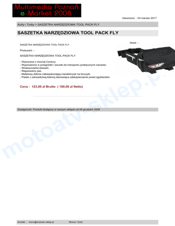 Utworzono : 04 marzec 2017 Kufry i Torby > SASZETKA NARZĘDZIOWA TOOL PACK FLY SASZETKA NARZĘDZIOWA TOOL PACK FLY Model : - SASZETKA NARZĘDZIOWA TOOL PACK FLY Producent : SASZETKA NARZĘDZIOWA TOOL PACK FLY - Wykonana z mocnej Cordury. - Wyposażona w przegródki i wsuwki do transportu podręcznych narzedzi. - Wodoszczelna kieszeń. - Regulowany pas. - Metalowy,dobrze zabezpieczający karabińczyk na kluczyki. - Pasek z zatrzaskową klamrą stanowiąca zabezpieczenie przed zgubieniem. Cena : 123,00 zł Brutto ( 100,00 zł Netto) p le k -s v t a o t o Dostępność: Produkt dostępny w naszym sklepie od 05 grudzień 2009 m kontakt : - [email protected] Strona 1/{nb} l .p