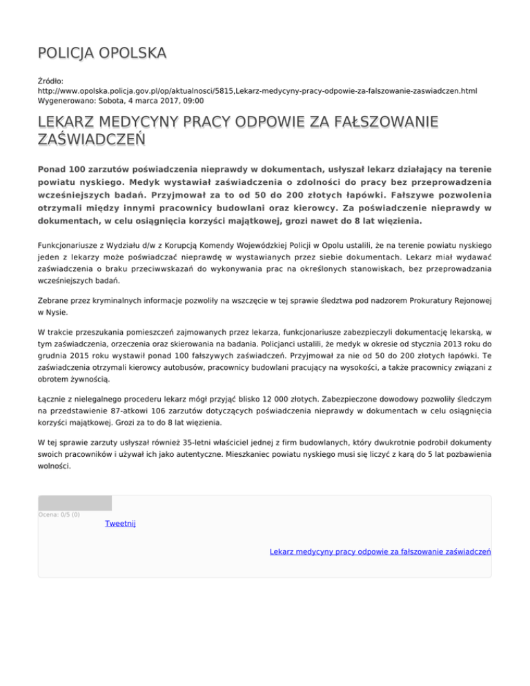 POLICJA OPOLSKA Źródło: http://www.opolska.policja.gov.pl/op/aktualnosci/5815,Lekarz-medycyny-pracy-odpowie-za-falszowanie-zaswiadczen.html Wygenerowano: Sobota, 4 marca 2017, 09:00 LEKARZ MEDYCYNY PRACY ODPOWIE ZA FAŁSZOWANIE ZAŚWIADCZEŃ Ponad 100 zarzutów poświadczenia nieprawdy w dokumentach, usłyszał lekarz działający na terenie powiatu nyskiego. Medyk wystawiał zaświadczenia o zdolności do pracy bez przeprowadzenia wcześniejszych badań. Przyjmował za to od 50 do 200 złotych łapówki. Fałszywe pozwolenia otrzymali między innymi pracownicy budowlani oraz kierowcy. Za poświadczenie nieprawdy w dokumentach, w celu osiągnięcia korzyści majątkowej, grozi nawet do 8 lat więzienia. Funkcjonariusze z Wydziału d/w z Korupcją Komendy Wojewódzkiej Policji w Opolu ustalili, że na terenie powiatu nyskiego jeden z lekarzy może poświadczać nieprawdę w wystawianych przez siebie dokumentach. Lekarz miał wydawać zaświadczenia o braku przeciwwskazań do wykonywania prac na określonych stanowiskach, bez przeprowadzania wcześniejszych badań. Zebrane przez kryminalnych informacje pozwoliły na wszczęcie w tej sprawie śledztwa pod nadzorem Prokuratury Rejonowej w Nysie. W trakcie przeszukania pomieszczeń zajmowanych przez lekarza, funkcjonariusze zabezpieczyli dokumentację lekarską, w tym zaświadczenia, orzeczenia oraz skierowania na badania. Policjanci ustalili, że medyk w okresie od stycznia 2013 roku do grudnia 2015 roku wystawił ponad 100 fałszywych zaświadczeń. Przyjmował za nie od 50 do 200 złotych łapówki. Te zaświadczenia otrzymali kierowcy autobusów, pracownicy budowlani pracujący na wysokości, a także pracownicy związani z obrotem żywnością. Łącznie z nielegalnego procederu lekarz mógł przyjąć blisko 12 000 złotych. Zabezpieczone dowodowy pozwoliły śledczym na przedstawienie 87-atkowi 106 zarzutów dotyczących poświadczenia nieprawdy w dokumentach w celu osiągnięcia korzyści majątkowej. Grozi za to do 8 lat więzienia. W tej sprawie zarzuty usłyszał również 35-letni właściciel jednej z firm budowlanych, który dwukrotnie podrobił dokumenty swoich pracowników i używał ich jako autentyczne. Mieszkaniec powiatu nyskiego musi się liczyć z karą do 5 lat pozbawienia wolności. Ocena: 0/5 (0) Tweetnij Lekarz medycyny pracy odpowie za fałszowanie zaświadczeń