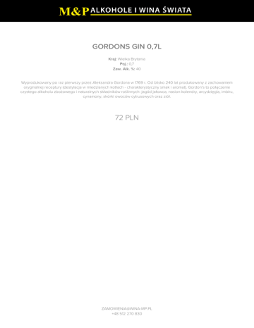 GORDONS GIN 0,7L Kraj: Wielka Brytania Poj.: 0,7 Zaw. Alk. %: 40 Wyprodukowany po raz pierwszy przez Aleksandra Gordona w 1769 r. Od blisko 240 lat produkowany z zachowaniem oryginalnej receptury (destylacja w miedzianych kotłach - charakterystyczny smak i aromat). Gordon’s to połączenie czystego alkoholu zbożowego i naturalnych składników roślinnych: jagód jałowca, nasion kolendry, arcydzięgla, imbiru, cynamony, skórki owoców cytrusowych oraz ziół. 72 PLN [email protected] +48 512 270 830
