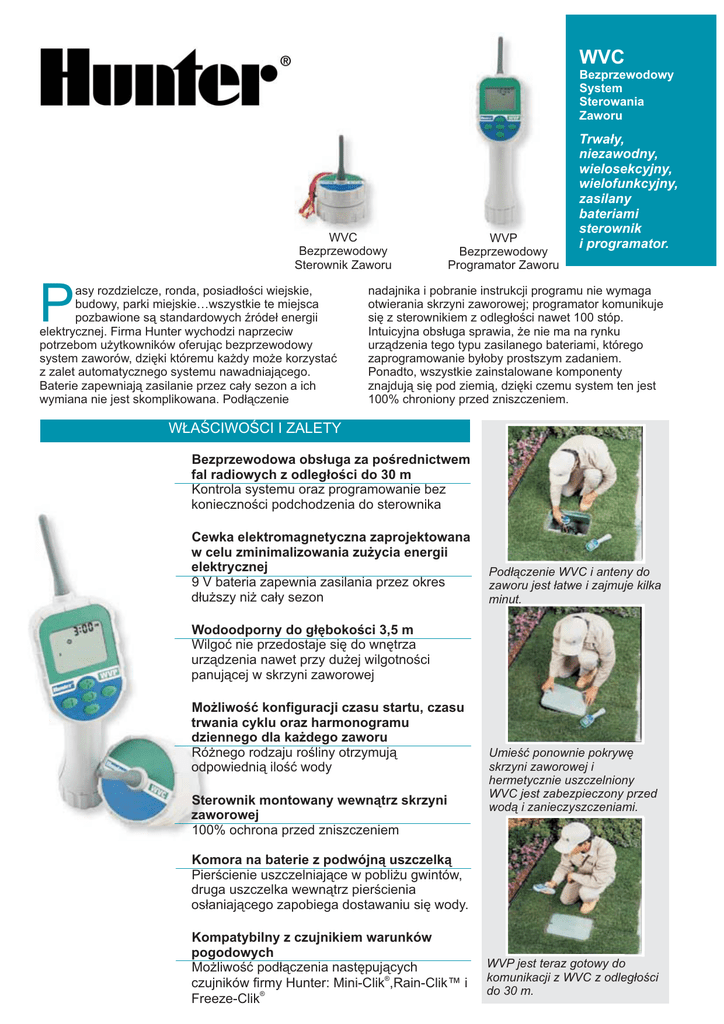 WVC Bezprzewodowy System Sterowania Zaworu WVC Bezprzewodowy Sterownik Zaworu P asy rozdzielcze, ronda, posiad³oœci wiejskie, budowy, parki miejskie…wszystkie te miejsca pozbawione s¹ standardowych Ÿróde³ energii elektrycznej. Firma Hunter wychodzi naprzeciw potrzebom u¿ytkowników oferuj¹c bezprzewodowy system zaworów, dziêki któremu ka¿dy mo¿e korzystaæ z zalet automatycznego systemu nawadniaj¹cego. Baterie zapewniaj¹ zasilanie przez ca³y sezon a ich wymiana nie jest skomplikowana. Pod³¹czenie WVP Bezprzewodowy Programator Zaworu Trwa³y, niezawodny, wielosekcyjny, wielofunkcyjny, zasilany bateriami sterownik i programator. nadajnika i pobranie instrukcji programu nie wymaga otwierania skrzyni zaworowej; programator komunikuje siê z sterownikiem z odleg³oœci nawet 100 stóp. Intuicyjna obs³uga sprawia, ¿e nie ma na rynku urz¹dzenia tego typu zasilanego bateriami, którego zaprogramowanie by³oby prostszym zadaniem. Ponadto, wszystkie zainstalowane komponenty znajduj¹ siê pod ziemi¹, dziêki czemu system ten jest 100% chroniony przed zniszczeniem. W£AŒCIWOŒCI I ZALETY Bezprzewodowa obs³uga za poœrednictwem fal radiowych z odleg³oœci do 30 m Kontrola systemu oraz programowanie bez koniecznoœci podchodzenia do sterownika Cewka elektromagnetyczna zaprojektowana w celu zminimalizowania zu¿ycia energii elektrycznej 9 V bateria zapewnia zasilania przez okres d³u¿szy ni¿ ca³y sezon Pod³¹czenie WVC i anteny do zaworu jest ³atwe i zajmuje kilka minut. Wodoodporny do g³êbokoœci 3,5 m Wilgoæ nie przedostaje siê do wnêtrza urz¹dzenia nawet przy du¿ej wilgotnoœci panuj¹cej w skrzyni zaworowej Mo¿liwoœæ konfiguracji czasu startu, czasu trwania cyklu oraz harmonogramu dziennego dla ka¿dego zaworu Ró¿nego rodzaju roœliny otrzymuj¹ odpowiedni¹ iloœæ wody Sterownik montowany wewn¹trz skrzyni zaworowej 100% ochrona przed zniszczeniem Umieœæ ponownie pokrywê skrzyni zaworowej i hermetycznie uszczelniony WVC jest zabezpieczony przed wod¹ i zanieczyszczeniami. Komora na baterie z podwójn¹ uszczelk¹ Pierœcienie uszczelniaj¹ce w pobli¿u gwintów, druga uszczelka wewn¹trz pierœcienia os³aniaj¹cego zapobiega dostawaniu siê wody. Kompatybilny z czujnikiem warunków pogodowych Mo¿liwoœæ pod³¹czenia nastêpuj¹cych czujników firmy Hunter: Mini-Clik®,Rain-Clik™ i Freeze-Clik® WVP jest teraz gotowy do komunikacji z WVC z odleg³oœci do 30 m. Modele WVC-100 - 1-sekcyjny bezprzewodowy sterownik zaworu (cewka elektromagnetyczna zamawiana osobno) WVC-200 - 2-sekcyjny bezprzewodowy sterownik zaworu (cewki elektromagnetyczne zamawiane osobno) WVC-400 - 4-sekcyjny bezprzewodowy sterownik zaworu (cewki elektromagnetyczne zamawiane osobno) WVP - Bezprzewodowy programator zaworu Cewka blokuj¹ca DC (czêœæ nr 458200); kompatybilna z wszystkimi zaworami firmy Hunter z tworzywa sztucznego Wymiary WVC - œrednica 8,25 cm x wys. 12,7 cm WVP - szer. 7,6 cm x d³. 29,0 cm x wys. 12,7 cm ·Dane u¿ytkowe · Bezprzewodowe sterowanie za poœrednictwem fal radiowych z odleg³oœci do 30 m · Czas trwania cyklu sekcji: 0-240 minut, regulacja z dok³adnoœci¹ do 1 minuty · Sterowanie prac¹ zaworu oddalonego od sterownika nawet o 30 m za poœrednictwem przewodu o œrednicy 18 AWG · Cykle: 9 w ci¹gu dnia · Nawadnianie oparte o 7-dniowy kalendarz lub harmonogram przerw (od 1 do 31 dni) · Zegar 12 lub 24 godzinny · Przesuniêcie cyklu nawadniania w przypadku zazêbienia siê z innym zaplanowanym cyklem · Prosta obs³uga · Programowalne opóŸnienie nawadniania od 1 do 7 dni · Bateria: standardowa 9-woltowa bateria alkaliczna (sprzedawana osobno), zapewnia zasilanie przez okres co najmniej dwunastu miesiêcy, zachowanie programu w pamiêci nie wymaga stosowania baterii · Pamiêæ: trwa³a pamiêæ przechowuj¹ca dane programu · System kompatybilny z czujnikami warunków pogodowych Wygoda zdalnego programowania Programator o zakresie u¿ytkowym 30 m pozwala na rêczne dzia³anie oraz pe³ne programowanie z “drugiej strony ulicy” nawet gdy jest zainstalowany pod ziemi¹ w skrzyni zaworowej. Oznacza to, ¿e w zat³oczonych miejscach takich jak korek uliczny, konserwator nie bêdzie musia³ martwiæ siê jak omin¹æ zat³oczon¹ jezdniê tylko po to, by sprawdziæ lub ponownie programowaæ zasilany bateryjnie sterownik. Z programatorem mo¿esz nawet dokonywaæ rutynowego programowania z wnêtrza wygodnego pojazdu (warto to wzi¹æ pod uwagê w razie paskudnej pogody). Dla wielu sterowników, jeden programator jest wszystkim czego potrzebujesz Z bateryjnie zasilanym sterownikiem firmy Hunter nie jesteœ ograniczony do jednego 2lub 4-stacyjnego urz¹dzenia na terenie. Mo¿esz zainstalowaæ kilka jednostek steruj¹cych by pokryæ ró¿ne czêœci obszernego terenu bez standardowego elektrycznego zasilania (jak du¿y miejski park) i zarz¹dzaæ wszystkimi funkcjami programowymi przy pomocy jednego urz¹dzenia programuj¹cego. Dziêki programatorowi WVC firmy Hunter mo¿esz sterowaæ wszystkimi wielostacyjnymi sterownikami bateryjnymi Hunter...w jednym miejscu czy te¿ na wielu ró¿nych terenach. D³ugi okres u¿ytkowania baterii dla rzadkiej konserwacji Podczas gdy niektóre sterowniki bateryjne wymagaj¹ do 3 ró¿nych baterii, bezprzewodowy sterownik zaworu WVC firmy Hunter dzia³a na jednej 9-V baterii. Nawet kiedy twój harmonogram nawadniania przewiduje dzia³anie czterech zaworów 9 razy dziennie ka¿dego dnia roku, sterownik firmy Hunter zapewni maksymaln¹ wydajnoœæ tej jednej baterii na ca³y pe³ny sezon. OZNACZENIE PRODUKTU PRZYK£AD: Bezprzewodowy Programator Zaworów pozwala na sprawdzenie czy przeprogramowanie Bezprzewodowego sterownika Zaworów zainstalowanego w œrodku ulicznego t³oku bez potrzeby przekraczania ruchliwej ulicy. WVC - 200 - E MODEL MODEL FUNKCJE E = Europa WVC 100 = 1-sekcyjny sterownik (cewka elektromagnetyczna sprzedawana osobno) (868 Mhz) 200 = 2-sekcyjny sterownik (cewki elektromagnetyczne sprzedawan