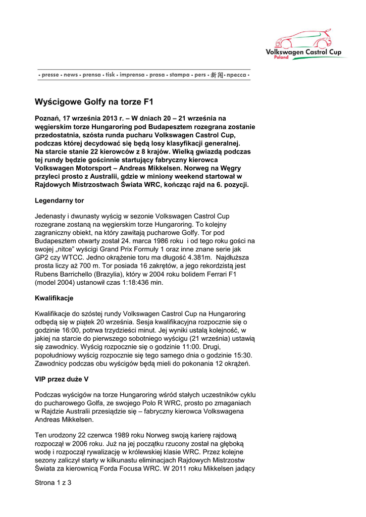Wyścigowe Golfy na torze F1 Poznań, 17 września 2013 r. – W dniach 20 – 21 września na węgierskim torze Hungaroring pod Budapesztem rozegrana zostanie przedostatnia, szósta runda pucharu Volkswagen Castrol Cup, podczas której decydować się będą losy klasyfikacji generalnej. Na starcie stanie 22 kierowców z 8 krajów. Wielką gwiazdą podczas tej rundy będzie gościnnie startujący fabryczny kierowca Volkswagen Motorsport – Andreas Mikkelsen. Norweg na Węgry przyleci prosto z Australii, gdzie w miniony weekend startował w Rajdowych Mistrzostwach Świata WRC, kończąc rajd na 6. pozycji. Legendarny tor Jedenasty i dwunasty wyścig w sezonie Volkswagen Castrol Cup rozegrane zostaną na węgierskim torze Hungaroring. To kolejny zagraniczny obiekt, na który zawitają pucharowe Golfy. Tor pod Budapesztem otwarty został 24. marca 1986 roku i od tego roku gości na swojej „nitce” wyścigi Grand Prix Formuły 1 oraz inne znane serie jak GP2 czy WTCC. Jedno okrążenie toru ma długość 4.381m. Najdłuższa prosta liczy aż 700 m. Tor posiada 16 zakrętów, a jego rekordzistą jest Rubens Barrichello (Brazylia), który w 2004 roku bolidem Ferrari F1 (model 2004) ustanowił czas 1:18:436 min. Kwalifikacje Kwalifikacje do szóstej rundy Volkswagen Castrol Cup na Hungaroring odbędą się w piątek 20 września. Sesja kwalifikacyjna rozpocznie się o godzinie 16:00, potrwa trzydzieści minut. Jej wyniki ustalą kolejność, w jakiej na starcie do pierwszego sobotniego wyścigu (21 września) ustawią się zawodnicy. Wyścig rozpocznie się o godzinie 11:00. Drugi, popołudniowy wyścig rozpocznie się tego samego dnia o godzinie 15:30. Zawodnicy podczas obu wyścigów będą mieli do pokonania 12 okrążeń. VIP przez duże V Podczas wyścigów na torze Hungaroring wśród stałych uczestników cyklu do pucharowego Golfa, ze swojego Polo R WRC, prosto po zmaganiach w Rajdzie Australii przesiądzie się – fabryczny kierowca Volkswagena Andreas Mikkelsen. Ten urodzony 22 czerwca 1989 roku Norweg swoją karierę rajdową rozpoczął w 2006 roku. Już na jej początku rzucony został na głęboką wodę i rozpoczął rywalizację w królewskiej klasie WRC. Przez kolejne sezony zaliczył starty w kilkunastu eliminacjach Rajdowych Mistrzostw Świata za kierownicą Forda Focusa WRC. W 2011 roku Mikkelsen jadący Strona 1 z 3 w barwach Volkswagen Motorsport Skodą Fabia S2000 został najmłodszym Mistrzem Świata serii IRC. Od roku 2013 Mikkelsen notuje regularne starty w Rajdowych Mistrzostwach Świata WRC za kierownicą Volkswagena Polo R WRC, gdzie aktualnie znajduje się na 10. miejscu (debiut podczas 4. eliminacji – Rajdzie Portugalii). Push – to – Pass Podczas rundy na torze Hungaroring zawodnicy będą mogli zwiększyć moc wyścigowego Golfa o dodatkowe 50 KM (do 310 KM) 19 razy podczas jednego wyścigu. System ten urozmaicał walkę i miał wpływ na przebieg rywalizacji wielokrotnie podczas poprzednich rund. Za każdym razem zwiększy on moc auta na 10 sekund z tym, że kolejny „strzał” będzie można wykonać dopiero po 10 sekundach. Pościg za liderem Liderem cyklu po 5 rundach z dorobkiem 374 punktów jest Mateusz Lisowski. Po jego perfekcyjnym weekendzie podczas ostatniej rundy na torze Red Bull Ring, gdzie zajął odpowiednio 1. i 2. miejsca, umocnił się na czele klasyfikacji, w której wyprzedza o 59 punktów Szweda Rasmusa Marthena (315 pkt). Zawodnik kraju Trzech Koron walczący o pozycję lidera nie może jednak zapomnieć o obronie swojej pozycji, gdyż tuż za jego plecami z bardzo małą stratą punktową znajduje się dwóch Polaków – Jan Kisiel, mający 311 punktów oraz tracący do Kisiela tylko jeden punkt Jakub Litwin. Z walki o podium nie zrezygnują także zawodnicy, którzy po słabszym początku sezonu zdecydowanie odbudowali swoją formę – Maciej Steinhof oraz Robertas Kupcikas. Wypowiedzi przed rundą na Węgrzech Mateusz Lisowski, 1. miejsce w klasyfikacji generalnej „Konfiguracja toru Hungaroring bardzo mi odpowiada i dobrze ją znam. Szczególnie wymagający jest drugi sektor, tam zawodnik musi być niezwykle skoncentrowany, gdyż bardzo szybko następują po sobie sekwencje zakrętów i nie ma miejsca na błąd. Każdy wyjazd poza idealną linię spowoduje tam spore straty na wyjściu z całej sekcji. Najbardziej charakterystyczną cechą toru jest jego wąska nitka, która utrudnia walkę koło w koło, a sporo emocji dostarcza również bardzo szybki, ślepy szczyt. Pomimo pozycji lidera w klasyfikacji generalnej Volkswagen Castrol Cup nie kalkuluję jeszcze punktów i cel na ten weekend jest tylko jeden – wygrana. Jeśli okaże się, że wystarczy ona do zwycięstwa w cyklu to będę bardzo zadowolony. Jest jeszcze za wcześnie, by podchodzić do tego weekendu strategicznie, tym bardziej, że bardzo lubię Hungaroring i zazwyczaj jestem na nim szybki.” Maciej Steinhof, 5. miejsce w klasyfikacji generalnej „Jestem dobrze nastawiony po ostatnim zwycięstwie na Red Bull Ringu. Z wyścigu na wyścig coraz pewniej się czuję w pucharowym Golfie i po 2 letniej przerwie w wyścigach. Tor Hungaroring jest fajnym i ciekawym torem, są szybkie i wolne zakręty wiec mamy wszystko. Parę lat temu ścigałem się na nim i bardzo go lubię. W ten weekend będę walczył o powtórzenie wyniku z ostatniego wyścigu." Strona 2 z 3 Maciej Dreszer, 14. miejsce w klasyfikacji generalnej „Cieszy mnie fakt, że jedna z rund Volkswagen Castrol Cup odbywa się właśnie na tym torze. Na pewno jest to bardzo prestiżowy obiekt. Ja osobiście Hungaroring lubię ponieważ jest bardzo szybkim i technicznym torem, na którym trenowałem kilkakrotnie w tym sezonie i zawsze panowała tam znakomita pogoda. Mam nadzieję że tym razem też tak będzie. Miejsce w pierwszej 10-tce będzie dla mnie dobrym wynikiem, choć celuję w pierwszą piątkę. Co do sytuacji w klasyfikacji generalnej moim planem marzeń jako debiutanta byłaby pierwsza 1