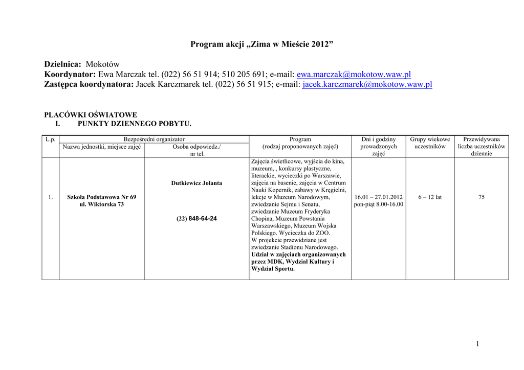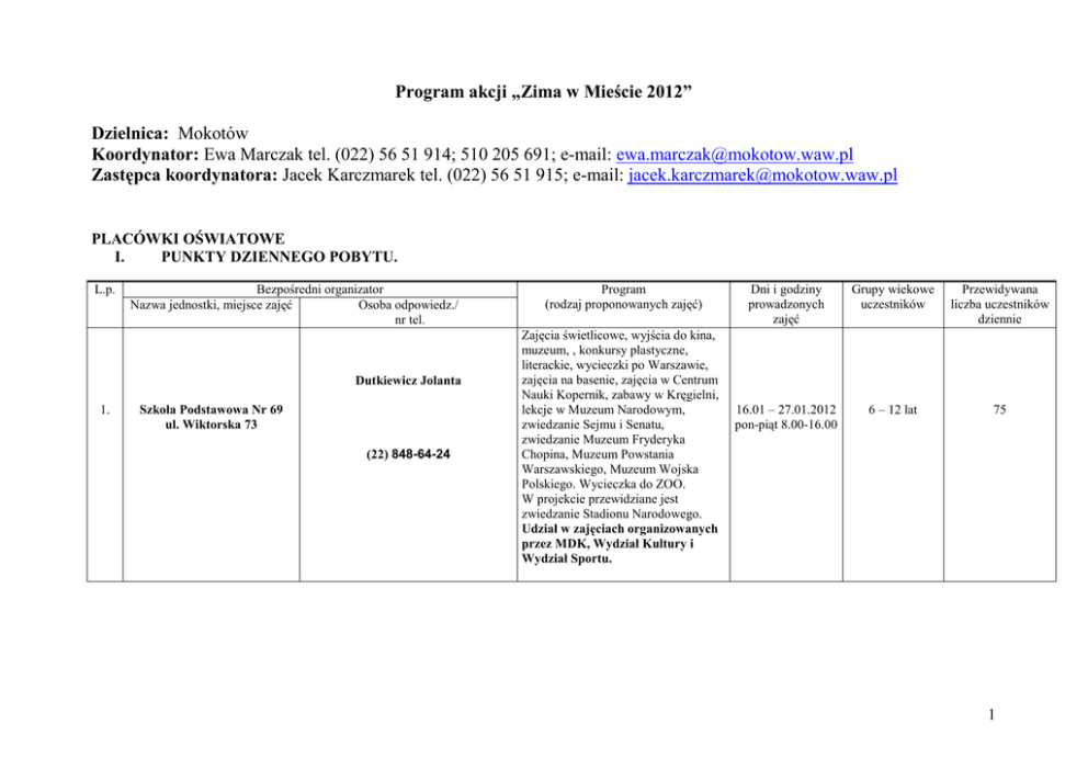 Program akcji „Zima w Mieście 2012” Dzielnica: Mokotów Koordynator: Ewa Marczak tel. (022) 56 51 914; 510 205 691; e-mail: [email protected] Zastępca koordynatora: Jacek Karczmarek tel. (022) 56 51 915; e-mail: [email protected] PLACÓWKI OŚWIATOWE I. PUNKTY DZIENNEGO POBYTU. L.p. Bezpośredni organizator Nazwa jednostki, miejsce zajęć Osoba odpowiedz./ nr tel. Dutkiewicz Jolanta 1. Szkoła Podstawowa Nr 69 ul. Wiktorska 73 (22) 848-64-24 Program (rodzaj proponowanych zajęć) Zajęcia świetlicowe, wyjścia do kina, muzeum, , konkursy plastyczne, literackie, wycieczki po Warszawie, zajęcia na basenie, zajęcia w Centrum Nauki Kopernik, zabawy w Kręgielni, lekcje w Muzeum Narodowym, zwiedzanie Sejmu i Senatu, zwiedzanie Muzeum Fryderyka Chopina, Muzeum Powstania Warszawskiego, Muzeum Wojska Polskiego. Wycieczka do ZOO. W projekcie przewidziane jest zwiedzanie Stadionu Narodowego. Udział w zajęciach organizowanych przez MDK, Wydział Kultury i Wydział Sportu. Dni i godziny prowadzonych zajęć Grupy wiekowe uczestników Przewidywana liczba uczestników dziennie 16.01 – 27.01.2012 pon-piąt 8.00-16.00 6 – 12 lat 75 1 2. Szkoła Podstawowa Nr 115 ul. OkręŜna 80 Gozdecka GraŜyna (22) 842-24-73 Zajęcia sportowo-rekreacyjne na salach gimnastycznych i boisku szkolnym, pływanie, tenis stołowy, zajęcia komputerowe, zajęcia świetlicowe, wycieczki do kina, zajęcia w Centrum Nauki Kopernik, 16.01 – 27.01.2012 zabawy w Kręgielni, lekcje w Muzeum pon-piąt 7.30-15.30 Narodowym, zwiedzanie Sejmu i Senatu, zwiedzanie Muzeum Fryderyka Chopina, Muzeum Powstania Warszawskiego, Muzeum Wojska Polskiego. Wycieczka do ZOO. W projekcie przewidziane jest zwiedzanie Stadionu Narodowego. 6 – 12 lat 75 7 – 12 lat 75 Udział w zajęciach organizowanych przez MDK, Wydział Kultury i Wydział Sportu. śbikowska Dorota 3. Szkoła Podstawowa Nr 119 ul. Pułku Baszta 3 (22) 844-75-48 Zabawy grupowe, konkurs tańca, dyskoteka, zajęcia plastyczne, zajęcia kulinarne, wyjścia do kina, teatru, muzeum, zoo, kręgielni, wycieczki po Warszawie, zajęcia w Centrum Nauki Kopernik, zabawy w Kręgielni, lekcje w Muzeum Narodowym, zwiedzanie Sejmu i Senatu, zwiedzanie Muzeum Fryderyka Chopina, Muzeum Powstania Warszawskiego, Muzeum Wojska Polskiego. Wycieczka do ZOO. W projekcie przewidziane jest zwiedzanie Stadionu Narodowego. 16.01 – 27.01.2012 pon-piąt 7.00-17.00 Udział w zajęciach organizowanych przez MDK, Wydział Kultury i Wydział Sportu. 2 BoŜena Maciejewska 4. Szkoła Podstawowa Nr 157 ul. Kazimierzowska 16 (22) 844-16-08 Zajęcia sportowo-rekreacyjne na salach gimnastycznych i boisku szkolnym, pływanie, tenis stołowy, zajęcia komputerowe, zajęcia świetlicowe, wycieczki do kina, zajęcia w Centrum Nauki Kopernik, 16.01 – 27.01.2012 zabawy w Kręgielni, lekcje w Muzeum pon-piąt 7.30-16.30 Narodowym, zwiedzanie Sejmu i Senatu, zwiedzanie Muzeum Fryderyka Chopina, Muzeum Powstania Warszawskiego, Muzeum Wojska Polskiego. Wycieczka do ZOO. W projekcie przewidziane jest zwiedzanie Stadionu Narodowego. 6 – 12 lat 75 6 – 12 lat 75 Udział w zajęciach organizowanych przez MDK, Wydział Kultury i Wydział Sportu. Paskudzka Julita 5. Szkoła Podstawowa Nr 205 ul. Spartańska 4 (22) 848-68-88 Zajęcia rekreacyjno-sportowe, zajęcia na basenie, turnieje sportowe, wyjścia do kina, zajęcia w bibliotece, zajęcia plastyczne, literackie, wycieczki po Warszawie, do ZOO, do Powsina, do parku Morskie Oko, wycieczki 16.01 – 27.01.2012 tematyczne, zabawy integracyjne, pon-piąt 7.30-16.30 zajęcia w Centrum Nauki Kopernik, zabawy w Kręgielni, lekcje w Muzeum Narodowym, zwiedzanie Sejmu i Senatu, zwiedzanie Muzeum Fryderyka Chopina, Muzeum Powstania Warszawskiego, Muzeum Wojska Polskiego. Wycieczka do ZOO. W projekcie przewidziane jest zwiedzanie Stadionu Narodowego. Udział w zajęciach organizowanych przez MDK, Wydział Kultury i Wydział Sportu. 3 Śmieszek Monika 6. Szkoła Podstawowa Nr 260 ul. Zakrzewska 24 (22) 841-60-97 Zabawy grupowe, konkurs tańca, dyskoteka, zajęcia plastyczne, zajęcia kulinarne, wyjścia do kina, teatru, zajęcia w Centrum Nauki Kopernik, zabawy w Kręgielni, lekcje w Muzeum Narodowym, zwiedzanie Sejmu i 16.01 – 27.01.2012 Senatu, zwiedzanie Muzeum pon-piąt 8.00-16.00 Fryderyka Chopina, Muzeum Powstania Warszawskiego, Muzeum Wojska Polskiego. Wycieczka do ZOO. W projekcie przewidziane jest zwiedzanie Stadionu Narodowego. 6 – 12 lat 75 6 – 12 lat 75 Udział w zajęciach organizowanych przez MDK, Wydział Kultury i Wydział Sportu Teresa Szewczyk 7. Szkoła Podstawowa Nr 307 ul. Barcelońska 8 (22) 842-42-61 Zajęcia rekreacyjno-sportowe, zajęcia plastyczne, wyjścia do kina, zajęcia teatralne, zajęcia w Centrum Nauki Kopernik, zabawy w Kręgielni, lekcje w Muzeum Narodowym, zwiedzanie Sejmu i Senatu, zwiedzanie Muzeum Fryderyka Chopina, Muzeum Powstania Warszawskiego, Muzeum Wojska Polskiego. Wycieczka do ZOO. W projekcie przewidziane jest zwiedzanie Stadionu Narodowego. 16.01 – 27.01.2012 pon-piąt 8.00-15.00 Udział w zajęciach organizowanych przez MDK, Wydział Kultury i Wydział Sportu. 4 8. ZSI Nr 62 ul. Bonifacego 10 Bańka Grzegorz (022) 642-98-44 Wycieczki i spacery, filmy, basen, konkursy, gry i zabawy ruchowe, gry dydaktyczne, zabawy w teatr. Zajęcia w Centrum Nauki Kopernik, zabawy w Kręgielni, lekcje w Muzeum Narodowym, zwiedzanie Sejmu i 16.01 – 27.01.2012 Senatu, zwiedzanie Muzeum pon-piąt 7.30-17.00 Fryderyka Chopina, Muzeum Powstania Warszawskiego, Muzeum Wojska Polskiego. Wycieczka do ZOO. W projekcie przewidziane jest zwiedzanie Stadionu Narodowego. 6 – 12 lat 75 Udział w zajęciach organizowanych przez MDK, Wydział Kultury i Wydział Sportu. 9. Gimnazjum Nr 11 ul. Podbipięty 2 Zbigniew Kazubek (022) 843-47-11 Zajęcia sportowe, wyjścia do kina, muzeum, teatru, zajęcia plastyczne, muzyczne, konkursy. Zajęcia w Centrum Nauki Kopernik, zabawy w Kręgielni, lekcje w Muzeum 16.01 – 27.01.2012 Narodowym, zwiedzanie