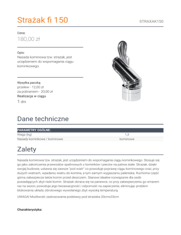 Strażak 150 STRAXAK150 Cena: 180,00 zł Opis: Nasada kominowa tzw. strażak, jest urządzeniem do wspomagania ciągu kominkowego. Wysyłka paczką przelew - 12,00 zł za pobraniem - 20,00 zł Realizacja w ciągu 1 dni Dane techniczne PARAMETRY OGÓLNE: Waga (kg) Nasady kominkowe / kominowe 1,3 kominowe Zalety Nasada kominowa tzw. strażak, jest urządzeniem do wspomagania ciągu kominkowego. Stosuje się go jako zakończenia przewodów spalinowych z kominków i pieców na paliwa stałe. Strażak, dzięki swojej budowie, ustawia się zawsze "pod wiatr" co powoduje poprawę ciągu kominowego oraz, przy dużych wiatrach, wpadaniu wiatru do komina, a tym samym wygaszaniu paleniska. Ruchoma część górna zabezpiecza także komin przed deszczem. Stanowi idealne rozwiązanie dla osób posiadających zbyt niski komin. Strażak obraca się na panewce, co przy zabezpieczeniu go smarem raz na sezon, powoduje jego bezawaryjność i odporność na zapieczenie, eliminując problem blokowania układu obrotowego wywołanego zbyt wysoką temperaturą. UWAGA! Możliwość zastosowania podstawy pod strażaka 33cmx33cm Charakterystyka: - grubość blachy: 0,6 mm - średnica: 150 mm - wytrzymałość na temperaturę: 400°C - materiał: stal kwasoodporna wybłyszczana Wykonujemy również na zamówienie strażaki ze stali kwasoodpornej o średnicach: 250, 300, 350. Wszelkie zapytania prosimy kierować na adres: [email protected]. Termin oczekiwania na realizacje zamówienia do 7 dni roboczych. Zwrot Klient będący Konsumentem, który zawarł Umowę sprzedaży, może w terminie 14 dni odstąpić od niej bez podawania przyczyny. Bieg terminu na odstąpienie od Umowy sprzedaży rozpoczyna się od chwili objęcia Towaru w posiadanie przez Klienta lub wskazaną przez niego osobę trzecią inną niż przewoźnik. Oświadczenie można złożyć na formularzu, którego wzór został zamieszczony przez Sprzedawcę na Stronie Internetowej Sklepu pod adresem: formularz odstąpienia. Kratki.pl Marek Bal ul. W. Gombrowicza 4 26-660 Wsola/Jedlińsk www.kratki.com tel. 48 340 10 00 Data publikacji: 25.11.2016