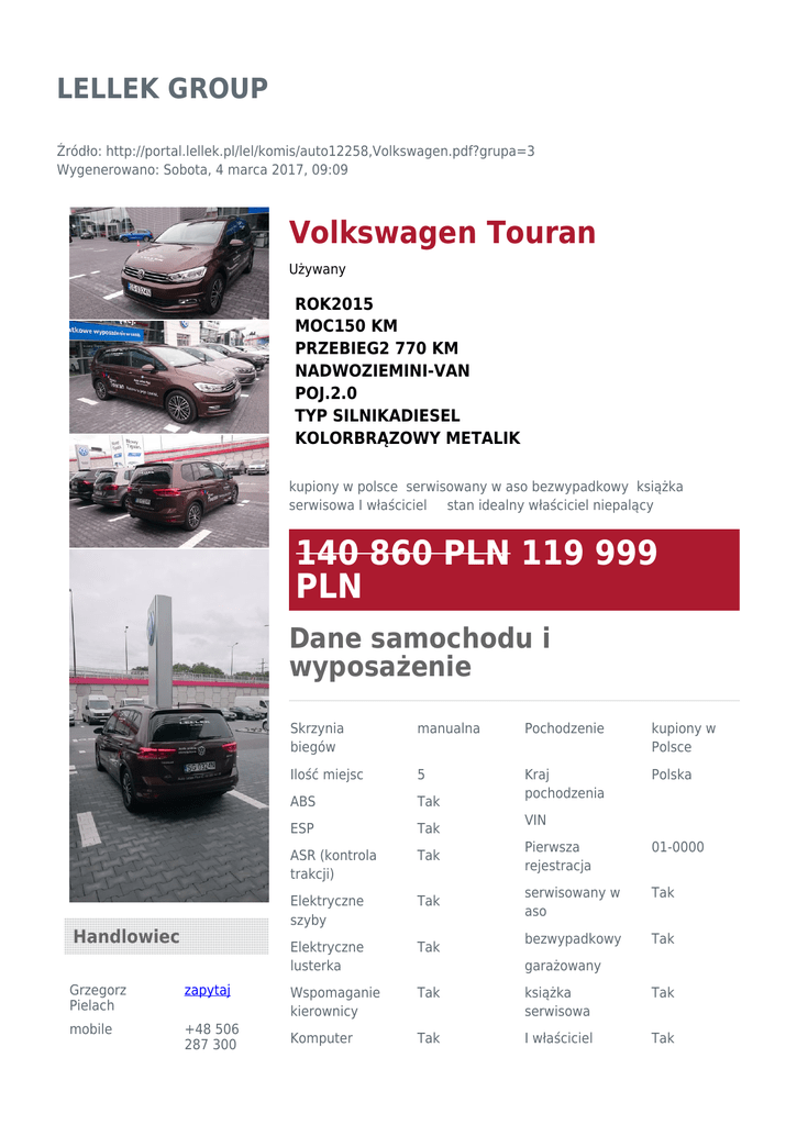 LELLEK GROUP Źródło: http://portal.lellek.pl/lel/komis/auto12258,Volkswagen.pdf?grupa=3 Wygenerowano: Sobota, 4 marca 2017, 09:09 Volkswagen Touran Używany ROK2015 MOC150 KM PRZEBIEG2 770 KM NADWOZIEMINI-VAN POJ.2.0 TYP SILNIKADIESEL KOLORBRĄZOWY METALIK kupiony w polsce serwisowany w aso bezwypadkowy książka serwisowa I właściciel stan idealny właściciel niepalący 140 860 PLN 119 999 PLN Dane samochodu i wyposażenie Handlowiec Grzegorz Pielach zapytaj mobile +48 506 287 300 Skrzynia biegów manualna Pochodzenie kupiony w Polsce Ilość miejsc 5 Polska ABS Tak Kraj pochodzenia ESP Tak ASR (kontrola trakcji) Tak Pierwsza rejestracja 01-0000 Elektryczne szyby Tak serwisowany w aso Tak Elektryczne lusterka Tak bezwypadkowy Tak Wspomaganie kierownicy Tak książka serwisowa Tak Komputer Tak I właściciel Tak VIN garażowany Charakterystyka spalania Radioodtwarza cz Tak kupiony w salonie Alarm Tak tunning Immobilizer Tak homologacja cykl miejski 5.4 l/100km cykl pozamiejski 4 l/100km Centralny zamek Tak stan idealny Tak Tak cykl mieszany 4.5 l/100km Nawigacja satelitarna Tak właściciel niepalący emisja CO2 118 g/km Czujnik deszczu Tak Czujniki parkowania Tak Kierownica wielofunkcyjna Tak Tempomat Tak Czujniki parkowania przód Tak Światła LED Tak Gwarancja Gwarancja dostępna Ubezpieczenie Ubezpieczenie dostępne Kredyt Kredyt dostępny Opis dodatkowy Nota prawna Zeskanuj kod, aby zobaczyć ofertę online Informacja nie stanowi oferty w rozumieniu art. 66 Kodeksu Cywilnego. Podane dane mają charakter wyłącznie informacyjny. Pełna informacja dostępna jest u handlowca. Sprzedający nie odpowiada za ewentualne błędy lub nieaktualność ogłoszenia.