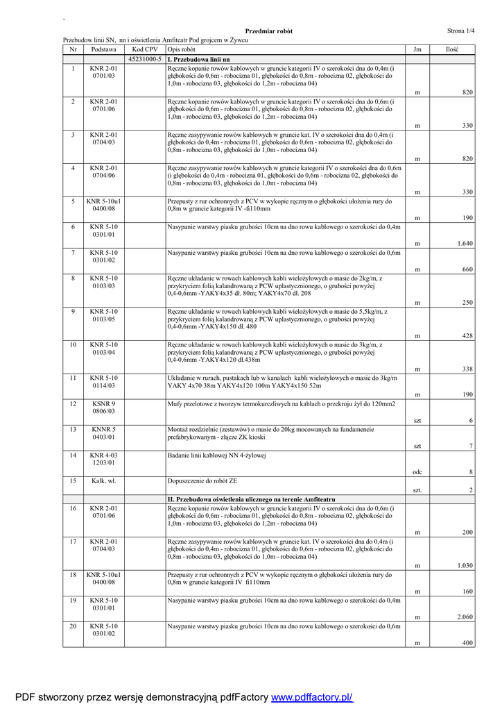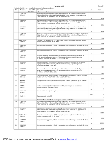 Przedmiar robót Przebudow linii SN, nn i oświetlenia Amfiteatr Pod grojcem w Żywcu Nr Podstawa Kod CPV Opis robót 45231000-5 I. Przebudowa linii nn 1 KNR 2-01 Ręczne kopanie rowów kablowych w gruncie kategorii IV o szerokości dna do 0,4m (i 0701/03 głębokości do 0,6m - robocizna 01, głębokości do 0,8m - robocizna 02, głębokości do 1,0m - robocizna 03, głębokości do 1,2m - robocizna 04) 2 KNR 2-01 0701/06 Ręczne kopanie rowów kablowych w gruncie kategorii IV o szerokości dna do 0,6m (i głębokości do 0,6m - robocizna 01, głębokości do 0,8m - robocizna 02, głębokości do 1,0m - robocizna 03, głębokości do 1,2m - robocizna 04) 3 KNR 2-01 0704/03 Ręczne zasypywanie rowów kablowych w gruncie kat. IV o szerokości dna do 0,4m (i głębokości do 0,4m - robocizna 01, głębokości do 0,6m - robocizna 02, głębokości do 0,8m - robocizna 03, głębokości do 1,0m - robocizna 04) 4 KNR 2-01 0704/06 Ręczne zasypywanie rowów kablowych w gruncie kategorii IV o szerokości dna do 0,6m (i głębokości do 0,4m - robocizna 01, głębokości do 0,6m - robocizna 02, głębokości do 0,8m - robocizna 03, głębokości do 1,0m - robocizna 04) 5 KNR 5-10u1 0400/08 6 KNR 5-10 0301/01 Nasypanie warstwy piasku grubości 10cm na dno rowu kablowego o szerokości do 0,4m 7 KNR 5-10 0301/02 Nasypanie warstwy piasku grubości 10cm na dno rowu kablowego o szerokości do 0,6m 8 KNR 5-10 0103/03 Ręczne układanie w rowach kablowych kabli wielożyłowych o masie do 2kg/m, z przykryciem folią kalandrowaną z PCW uplastycznionego, o grubości powyżej 0,4-0,6mm -YAKY4x35 dł. 80m; YAKY4x70 dł. 208 9 KNR 5-10 0103/05 Ręczne układanie w rowach kablowych kabli wielożyłowych o masie do 5,5kg/m, z przykryciem folią kalandrowaną z PCW uplastycznionego, o grubości powyżej 0,4-0,6mm -YAKY4x150 dł. 480 10 KNR 5-10 0103/04 Ręczne układanie w rowach kablowych kabli wielożyłowych o masie do 3kg/m, z przykryciem folią kalandrowaną z PCW uplastycznionego, o grubości powyżej 0,4-0,6mm -YAKY4x120 dł.438m 11 KNR 5-10 0114/03 Układanie w rurach, pustakach lub w kanałach kabli wielożyłowych o masie do 3kg/m YAKY 4x70 38m YAKY4x120 100m YAKY4x150 52m 12 KSNR 9 0806/03 Mufy przelotowe z tworzyw termokurczliwych na kablach o przekroju żył do 120mm2 13 KNNR 5 0403/01 Montaż rozdzielnic (zestawów) o masie do 20kg mocowanych na fundamencie prefabrykowanym - złącze ZK kioski 14 KNR 4-03 1203/01 Badanie linii kablowej NN 4-żylowej 15 Kalk. wł. Dopuszczenie do robót ZE 16 KNR 2-01 0701/06 II. Przebudowa oświetlenia ulicznego na terenie Amfiteatru Ręczne kopanie rowów kablowych w gruncie kategorii IV o szerokości dna do 0,6m (i głębokości do 0,6m - robocizna 01, głębokości do 0,8m - robocizna 02, głębokości do 1,0m - robocizna 03, głębokości do 1,2m - robocizna 04) 17 KNR 2-01 0704/03 Ręczne zasypywanie rowów kablowych w gruncie kat. IV o szerokości dna do 0,4m (i głębokości do 0,4m - robocizna 01, głębokości do 0,6m - robocizna 02, głębokości do 0,8m - robocizna 03, głębokości do 1,0m - robocizna 04) 18 KNR 5-10u1 0400/08 Przepusty z rur ochronnych z PCV w wykopie ręcznym o głębokości ułożenia rury do 0,8m w gruncie kategorii IV fi110mm 19 KNR 5-10 0301/01 Nasypanie warstwy piasku grubości 10cm na dno rowu kablowego o szerokości do 0,4m 20 KNR 5-10 0301/02 Nasypanie warstwy piasku grubości 10cm na dno rowu kablowego o szerokości do 0,6m Strona 1/4 Jm Ilość m 820 m 330 m 820 m 330 m 190 m 1.640 m 660 m 250 m 428 m 338 m 190 szt 6 szt 7 odc 8 szt. 2 m 200 m 1.030 m 160 m 2.060 m 400 Przepusty z rur ochronnych z PCV w wykopie ręcznym o głębokości ułożenia rury do 0,8m w gruncie kategorii IV -fi110mm PDF stworzony przez wersję demonstracyjną pdfFactory www.pdffactory.pl/ Przedmiar robót Przebudow linii SN, nn i oświetlenia Amfiteatr Pod grojcem w Żywcu Nr Podstawa Kod CPV Opis robót 21 KNR 5-10 Ręczne układanie w rowach kablowych kabli wielożyłowych o masie do 2kg/m, z 0103/03 przykryciem folią kalandrowaną z PCW uplastycznionego, o grubości powyżej 0,4-0,6mm YAKY4x35mm2 1274m 22 KNR 5-10 0114/03 23 KSNR 9 0806/01 Mufy przelotowe z tworzyw termokurczliwych na kablach o przekroju żył do 35mm2 24 KNNR 5 0403/01 Montaż rozdzielnic (zestawów) o masie do 20kg mocowanych na fundamencie prefabrykowanym - tablica TO 25 KNNR 5 0403/01 Montaż rozdzielnic (zestawów) o masie do 20kg mocowanych na fundamencie prefabrykowanym - złącze ZK1 26 KNNR 5 0403/01 Montaż rozdzielnic (zestawów) o masie do 20kg mocowanych na fundamencie prefabrykowanym - złącze scena ST80x88 wyposaż. 27 KNR 4-03 1203/01 Badanie linii kablowej NN 4-żylowej 28 Kalk. wł. Dopuszczenie do robót ZE Strona 2/4 Jm Ilość m 1.114 m 160 szt 6 szt 6 szt 2 szt 1 odc 7 szt. 2 szt 11 szt 1 szt 1 szt 10 szt 6 szt 12 szt 27 kpl 2 szt 5 szt 1 kpl 8 szt 2 m 160 kpl 27 kpl 12 Układanie w rurach, pustakach lub w kanałach kabli wielożyłowych o masie do 3kg/m III. Montaż latarń oświetlenia Montaż i stawianie słupów oświetleniowych o masie do 100kg -SAL A1 4,5m 29 KSNR 5 1001/01 30 KSNR 5 1001/01 31 KNNR 5 1001/03 45311200-2 Montaż i stawianie słupów oświetleniowych o masie do 480kg - latarnia SAL-10 10m ROSA z wys. 3/1,5m 32 KNNR 5 1001/03 45311200-2 Montaż i stawianie słupów oświetleniowych o masie do 480kg - latarnia SAL-10 10m ROSA z wys. 1/1,5m 33 KNNR 5 1001/03 45311200-2 Montaż i stawianie słupów oświetleniowych o masie do 480kg - latarnia S-95 Rzeszów 9,5m 34 KNNR 5 1004/01 45311200-2 Montaż opraw oświetlenia zewnętrznego na słupie OCP70PC z daszkiem 35 KNNR 5 1004/01 45311200-2 Montaż opraw oświetlenia zewnętrznego na słupie OUShc150 36 KNNR 5 1009/03 45311200-2 Montaż na maszcie trzech konsol sygnalizatorów ulicznych -konsola WM5 ROSA 37 KNNR 9 1002/01 45311200-2 Wymiana wysięgnika o masie do 15kg na słupie -pojed. 1,5m do S-95 38 KNNR 9 1002/01 45311200-2 Wymiana wysięgnika o masie do 15kg na słupie -podw. 1,5m kątowy