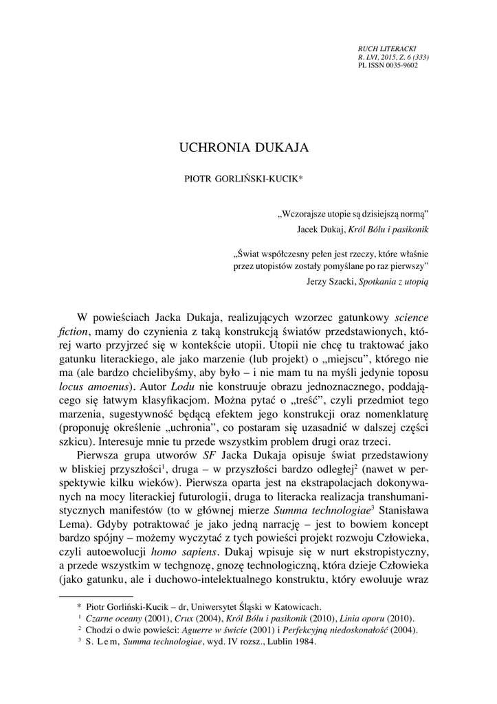 RUCH LITERACKI R. LVI, 2015, Z. 6 (333) PL ISSN 0035-9602 UCHRONIA DUKAJA PIOTR GORLIŃSKI-KUCIK* „Wczorajsze utopie są dzisiejszą normą” Jacek Dukaj, Król Bólu i pasikonik „Świat współczesny pełen jest rzeczy, które właśnie przez utopistów zostały pomyślane po raz pierwszy” Jerzy Szacki, Spotkania z utopią W powieściach Jacka Dukaja, realizujących wzorzec gatunkowy science fiction, mamy do czynienia z taką konstrukcją światów przedstawionych, której warto przyjrzeć się w kontekście utopii. Utopii nie chcę tu traktować jako gatunku literackiego, ale jako marzenie (lub projekt) o „miejscu”, którego nie ma (ale bardzo chcielibyśmy, aby było – i nie mam tu na myśli jedynie toposu locus amoenus). Autor Lodu nie konstruuje obrazu jednoznacznego, poddającego się łatwym klasyfikacjom. Można pytać o „treść”, czyli przedmiot tego marzenia, sugestywność będącą efektem jego konstrukcji oraz nomenklaturę (proponuję określenie „uchronia”, co postaram się uzasadnić w dalszej części szkicu). Interesuje mnie tu przede wszystkim problem drugi oraz trzeci. Pierwsza grupa utworów SF Jacka Dukaja opisuje świat przedstawiony w bliskiej przyszłości1, druga – w przyszłości bardzo odległej2 (nawet w perspektywie kilku wieków). Pierwsza oparta jest na ekstrapolacjach dokonywanych na mocy literackiej futurologii, druga to literacka realizacja transhumanistycznych manifestów (to w głównej mierze Summa technologiae3 Stanisława Lema). Gdyby potraktować je jako jedną narrację – jest to bowiem koncept bardzo spójny – możemy wyczytać z tych powieści projekt rozwoju Człowieka, czyli autoewolucji homo sapiens. Dukaj wpisuje się w nurt ekstropistyczny, a przede wszystkim w techgnozę, gnozę technologiczną, która dzieje Człowieka (jako gatunku, ale i duchowo-intelektualnego konstruktu, który ewoluuje wraz * Piotr Gorliński-Kucik – dr, Uniwersytet Śląski w Katowicach. 1 Czarne oceany (2001), Crux (2004), Król Bólu i pasikonik (2010), Linia oporu (2010). 2 Chodzi o dwie powieści: Aguerre w świcie (2001) i Perfekcyjną niedoskonałość (2004). 3 S. L e m, Summa technologiae, wyd. IV rozsz., Lublin 1984. 614 Piotr Gorliński-Kucik z całym Wszechświatem) interpretuje głównie jako ewolucję techniki, mającej przynieść człowiekowi upragnione „samo-zbawienie”, rozumiane w kategoriach gnostycznych. Najlepszym przykładem jest tu zbawienie od świata materii (Gnoju, Gliny) dzięki przeniesieniu się w światy wirtualne („państwa Ducha”) i digitalizacji człowieka (lub wyewoluowanie aż do stadium AI, sztucznej inteligencji). O kilku innych aspektach przedmiotu tej uchronii wspomnę jeszcze w dalszej części. Uchronia Jacka Dukaja jest przekonująca i sugestywna dzięki kilku zabiegom zastosowanym przy jej konstruowaniu. Są to: futurologiczne ekstrapolacje; swoiste połączenie elementów optymistycznej utopii o proweniencji oświeceniowej i pesymistycznej dystopii o charakterze ponowoczesnym oraz opisanie zarówno awersu i rewersu tej uchronii; ukazanie zmienności pojęcia utopii w czasie (jej uhistorycznienie); wprowadzenie elementów języka naukowego do dyskursu powieściowego; oparcie całości konceptu na ewolucjonizmie sensu largo. Istnieją dwa sposoby budowania futurologicznych ekstrapolacji4. „Futurolog albo przedłuża w przyszłość obserwowane właśnie trendy, albo wykrywa w historii jakąś ogólną, porządkującą ją regułę i dopisuje do niej następny logiczny krok”5. Oba jednak zawodzą: pierwszy nie jest w stanie przewidzieć efektów zderzania się ze sobą bardzo wielu trendów; drugi – jest na takim stopniu ogólności, że da się obronić niemal zawsze. „Literatura do futurologii ma się mniej więcej tak, jak psychoanaliza do tomografii komputerowej mózgu”6 – wyznaje Dukaj, ale dodaje – „Ponieważ jest to literatura, nie nauka, operacja może dać tu dobry wynik, nawet, gdy wszystkie użyte narzędzia są felerne”, bowiem „Fikcja i sen mówią czasem więcej prawdy niż najwierniejszy opis”7. Dukaj podejmuje tę próbę i odnosi się przy tym do wzorca klasycznej SF, której celem było dawanie naukowych (unaukowionych) prognoz na przyszłość. Takiej science fiction domagał się Stanisław Lem w swoich tekstach dyskursywnych, i w kontekście jej zaniku wieszczył upadek futurologii jako (literackiego) przewidywania przyszłości8. Sądzę, że Jacek Dukaj podejmuje próbę kontynuacji tej tradycji, a nawet jej odnowienia. Wzorcem, do którego odnosi się autor Lodu, jest zatem właśnie SF, i w efekcie realizacji tego wzorca (takiej, a nie 4 Odnotujmy na marginesie jak relację między futurologią a utopizmem opisuje Jerzy Szacki. Jego zdaniem futurolog nie chce zmieniać świata, lecz przewiduje, co się stanie, jeśli zmianom nie ulegnie; interesują go fakty, ale jego działalność ożywia myślenie utopijne (niektórzy utopiści byli poprzednikami futurologów w ćwiczeniu socjologicznej wyobraźni). Futurolog podąża za trendami i prognozuje, utopista swój eksperyment zaczyna od wyobrażenia całości i domyśla się procesów, które go do tego stanu mają doprowadzić. Myślenie o przyszłości ożywiane jest przez rozwój nauki i techniki, co z kolei prowokuje projektowanie rozmaitych technoutopii, zob. J. S z a c k i, Spotkania z utopią, Warszawa 1980, s. 186–191. 5 J. D u k a j, Wstęp [w:] PL+50. Historie przyszłości, red. tenże, Kraków 2004, s. 7. 6 Tamże, s. 6. 7 Tamże, s. 7. 8 Zob.: S. L e m, Fantastyka i futurologia, wyd. II, T. I i II, Kraków 1973. Uchronia Dukaja 615 innej realizacji) wyłania się specyficzna uchronia (rzecz jasna nie każda powieść science fiction posiada utopijne pierwiastki, lub – tym bardziej – jest jakąś formą utopii). O odnajdywaniu „ogólnej, porządkującej historię” reguły i dopisywaniu do niej „następnego logicznego kroku” opowiem przy okazji omawiania ewolucjonizmu w 