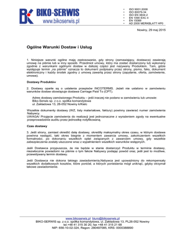 • • • • • • ISO 9001:2008 ISO 80079-34 ISO EN 3834-2 EN 1090 EXC 4 EN 15089 AD 2000 MERKBLATT HP0 Nowiny, 29 maj 2015 Ogólne Warunki Dostaw i Usług 1. Niniejsze warunki ogólne mają zastosowanie, gdy strony (zamawiający, dostawca) zawierają umowę na piśmie lub w inny sposób. Przedmiot umowy, który ma zostać dostarczony lub wykonany zgodnie z warunkami ogólnymi dostaw w dalszej części jest nazywany Produktem. Tam, gdzie występuje termin „na piśmie” oznacza to dokument podpisany przez strony, pismo, faks, dokument elektroniczny i każdy środek zgodny z umową zawartą przez strony (zapytanie, oferta, zamówienie, umowa). Dostawy Produktów 2. Dostawy oparte są o ustalenia przepisów INCOTERMS. Jeżeli nie ustalono w zamówieniu warunków dostaw obowiązuje dostawa Carriage Paid To (CPT). Adres dostawy zamówionego Produktu – jeśli inaczej nie podano w zamówieniu lub umowie: Biko-Serwis sp. z o.o. spółka komandytowa ul. Zakładowa 13, 26-052 Nowiny k/Kielc Wszelkie dokumenty dostawy (WZ, listy materiałowe, faktury) powinny zawierać numer zamówienia Nabywcy. UWAGA/ Przyjęcie zamówienia do realizacji jest jednoznaczne z wyrażeniem zgody na ewentualne przeprowadzenie auditu przez jednostkę notyfikowaną. Czas dostawy 3. Jeśli strony, zamiast określić datę dostawy, określiły maksymalny okres czasu, w którym dostawa powinna nastąpić, taki okres biegnie z momentem zawarcia umowy, zakończeniem wszelkich formalności, po dokonaniu wszelkich opłat związanych z zawarciem umowy, gdy wszelkie zabezpieczenia zostały uiszczone wraz z wypełnieniem wszelkich warunków wstępnych. Jeśli Dostawca przypuszcza, że nie będzie w stanie dostarczyć Produktu w terminie dostawy, niezwłocznie powiadomi na piśmie o tym fakcie Nabywcy podając powód oraz, jeśli jest to możliwe, przewidywany termin dostawy. Jeśli Dostawca nie dokona takiego zawiadomienia,Nabywca jest upoważniony do rekompensaty wszelkich dodatkowych kosztów, które poniósł, a których poniesienia mógł uniknąć, gdyby otrzymał takowe zawiadomienie. www.bikoserwis.pl [email protected] BIKO-SERWIS sp. z o.o. spółka komandytowa, ul. Zakładowa 13, PL26-052 Nowiny tel.+48 41 315 30 20, fax +48 41 315 21 68 NIP: 656-10-02-324, Regon: 290497085, KRS: 0000388890 • • • • • • ISO 9001:2008 ISO 80079-34 ISO EN 3834-2 EN 1090 EXC 4 EN 15089 AD 2000 MERKBLATT HP0 Opóźnienia 4. Jeśli Produkt nie został dostarczony w terminie dostawy (określonym w zamówieniu, umowie) Nabywca jest upoważniony do odszkodowania od daty, w której dostawa powinna mieć miejsce. Odszkodowanie płatne jest w wysokości 1 procenta ceny nabycia za każdy zakończony dzień opóźnienia. Odszkodowanie nie przekracza 15 procent ceny nabycia. Nabywca ma także prawo do zakończenia umowy poprzez pisemne zawiadomienie Dostawcy, jeśli z okoliczności jasno wynika, że nastąpi opóźnienie w dostawie, które zgodnie uprawnia Nabywcę do maksymalnego odszkodowania (15% wartości zamówienia). W przypadku zakończenia umowy z tego powodu, Nabywca jest uprawniony do maksymalnego odszkodowania oraz rekompensaty. Zapłata 5. Termin płatności jest każdorazowo określony w zamówieniu (umowy), przy czym nie może być krótszy niż 30 dni. Termin płatności biegnie od daty otrzymania prawidłowo wystawionej faktury. Za datę płatności uznaje się obciążenie rachunku bankowego Nabywcy. Zobowiązania z tytułu usterek 6. Dostawca zlikwiduje wszelkie usterki lub niedogodności (zwane dalej usterkami) wynikające z błędnego projektu, materiałów lub robocizny. Odpowiedzialność Dostawcy jest ograniczona do usterek, które wystąpią w okresie dwóch lat od dostawy. Jeśli usterka w części Produktu została usunięta, Dostawca odpowiada za usterki w naprawionej lub wymienionej części na takich samych zasadach i warunkach, jak te odnoszące się do oryginalnego produktu przez okres jednego roku. W odniesieniu do pozostałych części Produktu okres zostaje przedłużony jedynie o okres równy okresowi, przez który Produkt został wyłączony z działania w wyniku usterki. Nabywca bezzwłocznie powiadomi Dostawcę na piśmie o wszelkich pojawiających się usterkach. Zawiadomienie zawiera opis usterki. Tam, gdzie usterka może spowodować dalsze straty i uszkodzenia, Nabywca może sam dokonać niezbędnych napraw a kosztami obciążyć dostawcę Produktu. Dostawca usuwa usterkę bez niepotrzebnej zwłoki i na swój koszt. Naprawa zostanie przeprowadzona na miejscu, gdzie znajduje się Produkt chyba, że Dostawca będzie uważał za stosowne, aby wadliwa część Produktu została mu zwrócona do naprawy lub wymiany. Dostawca jest zobowiązany do przeprowadzenia demontażu oraz ponownej instalacji części, jeśli wymaga to wiedzy specjalistycznej. Jeśli taka wiedza specjalistyczna nie jest wymagana, Dostawca wypełnia swoje zobowiązania w odniesieniu do usterki, kiedy dostarczy do Nabywcy odpowiednio naprawioną i wymienioną część. Jeśli Dostawca nie wypełni swoich zobowiązań w ostatecznym terminie, Nabywca sam podejmuje się lub zatrudnia osobę trzecią w celu podjęcia niezbędnych prac naprawczych na ryzyko i koszt Dostawcy. Tam, gdzie udane prace naprawcze zostały dokonane przez Nabywcę lub osobę trzecią, wynagrodzenie ze strony Dostawcy za uzasadnione koszty poniesione przez Nabywcę zostaną w pełni rozliczone jako zobowiązania Dostawcy z tytułu wymienionej usterki. Jeśli usterki nie dało się w pełni usunąć Nabywca jest uprawniony do redukcji ceny nabycia proporcjonalnie do obniżonej wartości Produktu, zakładając, że okoliczności takiej redukcji nie przekraczają 20 procent ceny nabycia, lub tam, gdzie usterka jest tak istotna, że wyraźnie pozbawia Nabywcę korzyści płynących z umowy, Nabywca może wypowiedzieć zamówienie/umowę na piśmie do Dostawcy. Nabywca jest wtedy upoważniony do rekompensaty z tytułu poniesionych strat, maksymalnie do 20 procent