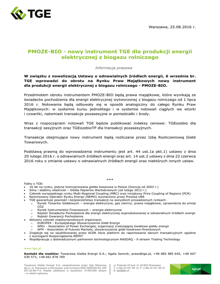 Warszawa, 25.08.2016 r. PMOZE-BIO - nowy instrument TGE dla produkcji energii elektrycznej z biogazu rolniczego Informacja prasowa W związku z nowelizacją Ustawy o odnawialnych źródłach energii, 6 września br. TGE wprowadzi do obrotu na Rynku Praw Majątkowych nowy instrument dla produkcji energii elektrycznej z biogazu rolniczego - PMOZE-BIO. Przedmiotem obrotu instrumentem PMOZE-BIO będą prawa majątkowe, które wynikają ze świadectw pochodzenia dla energii elektrycznej wytworzonej z biogazu rolniczego od 1 lipca 2016 r. Notowania będą odbywały się w sposób analogiczny do całego Rynku Praw Majątkowych: w systemie kursu jednolitego i w systemie notowań ciągłych we wtorki i czwartki, natomiast transakcje pozasesyjne w poniedziałki i środy. Wraz z rozpoczęciem notowań TGE będzie publikować indeksy cenowe: TGEozebio dla transakcji sesyjnych oraz TGEozebioTP dla transakcji pozasesyjnych. Transakcje obejmujące nowy instrument będą rozliczane przez Izbę Rozliczeniową Giełd Towarowych. Podstawą prawną do wprowadzenia instrumentu jest art. 44 ust.1a pkt.1) ustawy z dnia 20 lutego 2016 r. o odnawialnych źródłach energii oraz art. 14 ust.2 ustawy z dnia 22 czerwca 2016 roku o zmianie ustawy o odnawialnych źródłach energii oraz niektórych innych ustaw. *** Fakty o TGE: 16 lat na rynku, jedyna licencjonowana giełda towarowa w Polsce (licencja od 2003 r.) Silny i stabilny właściciel – Giełda Papierów Wartościowych (od lutego 2012 r.) Członek europejskiego rynku Multi-Regional Coupling (MRC) oraz inicjatywy Price Coupling of Regions (PCR) Nominowany Operator Rynku Energii (NEMO) wyznaczony przez Prezesa URE TGE gwarantuje pewność i bezpieczeństwo transakcji na wszystkich prowadzonych rynkach: o Rynek Towarów Giełdowych – energia elektryczna, gaz ziemny, prawa majątkowe, uprawnienia do emisji CO2 o Rynek Instrumentów Finansowych – energia elektryczna o Rejestr Świadectw Pochodzenia dla energii elektrycznej wyprodukowanej w odnawialnych źródłach energii o Rejestr Gwarancji Pochodzenia Aktywny członek międzynarodowych organizacji: o EUROPEX - Europejskiego Stowarzyszenia Giełd Energii o APEx - Association of Power Exchanges, organizacji zrzeszającej światowe giełdy energii o AFM - Association of Futures Markets, stowarzyszenia giełd towarowo-finansowych Znajduje się na opublikowanej przez ACER liście platform do raportowania danych transakcyjnych zgodnie z wymogami Rozporządzenia REMIT Współpracuje z doświadczonym partnerem technologicznym NASDAQ - X-stream Trading Technology www.tge.pl Kontakt dla mediów: Towarowa Giełda Energii S.A.; Agata Samcik; [email protected], +48 885 885 645, +48 607 030 573, +48 661 878 769 Towarowa Giełda Energii S.A. zarejestrowana przez Sąd Rejonowy dla m. st. Warszawy w Warszawie, pod numerem KRS 0000030144, NIP 527-22-66-714. Kapitał zakładowy w wysokości 14.500.000 złotych – w całości opłacony ul. Poleczki 23 bud. H, 02-822 Warszawa T: (+48) 22 341 99 12, F: (+48) 22 341 99 10 E: [email protected]
