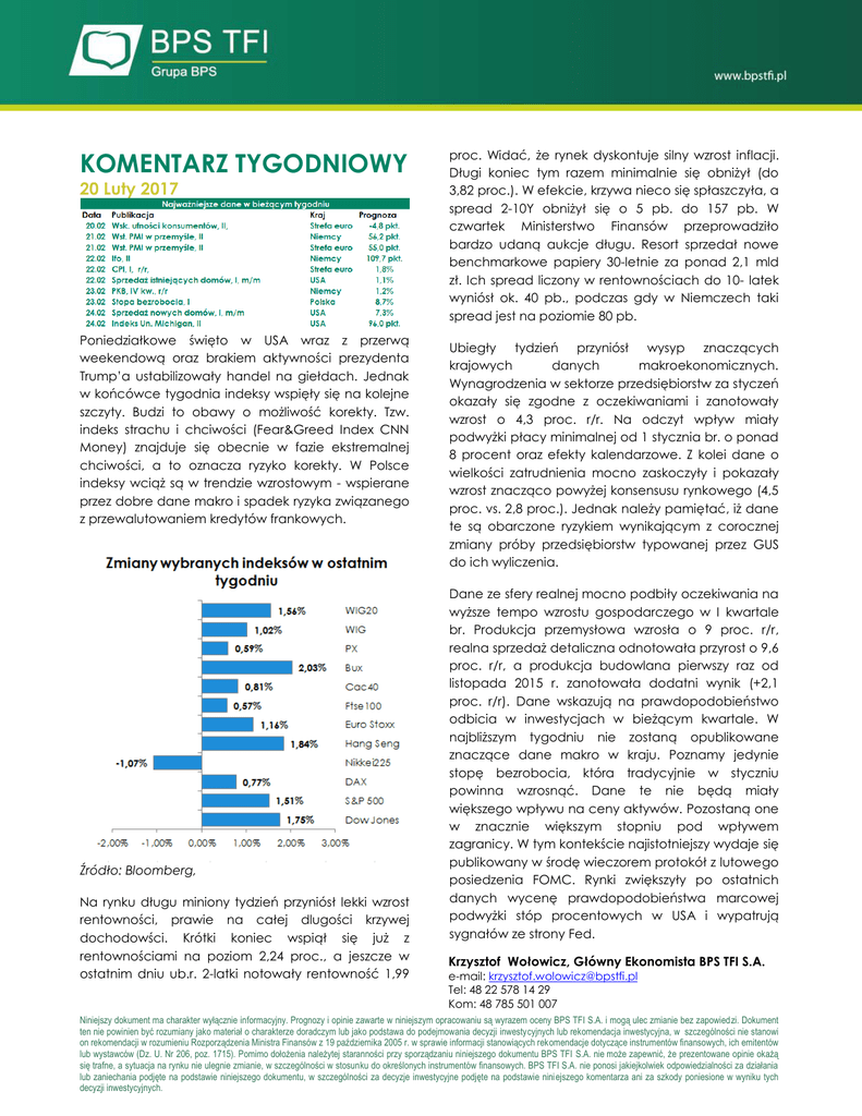 KOMENTARZ TYGODNIOWY 20 Luty 2017 Poniedziałkowe święto w USA wraz z przerwą weekendową oraz brakiem aktywności prezydenta Trump’a ustabilizowały handel na giełdach. Jednak w końcówce tygodnia indeksy wspięły się na kolejne szczyty. Budzi to obawy o możliwość korekty. Tzw. indeks strachu i chciwości (Fear&Greed Index CNN Money) znajduje się obecnie w fazie ekstremalnej chciwości, a to oznacza ryzyko korekty. W Polsce indeksy wciąż są w trendzie wzrostowym - wspierane przez dobre dane makro i spadek ryzyka związanego z przewalutowaniem kredytów frankowych. Źródło: Bloomberg, Na rynku długu miniony tydzień przyniósł lekki wzrost rentowności, prawie na całej dlugości krzywej dochodowści. Krótki koniec wspiął się już z rentownościami na poziom 2,24 proc., a jeszcze w ostatnim dniu ub.r. 2-latki notowały rentowność 1,99 proc. Widać, że rynek dyskontuje silny wzrost inflacji. Długi koniec tym razem minimalnie się obniżył (do 3,82 proc.). W efekcie, krzywa nieco się spłaszczyła, a spread 2-10Y obniżył się o 5 pb. do 157 pb. W czwartek Ministerstwo Finansów przeprowadziło bardzo udaną aukcje długu. Resort sprzedał nowe benchmarkowe papiery 30-letnie za ponad 2,1 mld zł. Ich spread liczony w rentownościach do 10- latek wyniósł ok. 40 pb., podczas gdy w Niemczech taki spread jest na poziomie 80 pb. Ubiegły tydzień przyniósł wysyp znaczących krajowych danych makroekonomicznych. Wynagrodzenia w sektorze przedsiębiorstw za styczeń okazały się zgodne z oczekiwaniami i zanotowały wzrost o 4,3 proc. r/r. Na odczyt wpływ miały podwyżki płacy minimalnej od 1 stycznia br. o ponad 8 procent oraz efekty kalendarzowe. Z kolei dane o wielkości zatrudnienia mocno zaskoczyły i pokazały wzrost znacząco powyżej konsensusu rynkowego (4,5 proc. vs. 2,8 proc.). Jednak należy pamiętać, iż dane te są obarczone ryzykiem wynikającym z corocznej zmiany próby przedsiębiorstw typowanej przez GUS do ich wyliczenia. Dane ze sfery realnej mocno podbiły oczekiwania na wyższe tempo wzrostu gospodarczego w I kwartale br. Produkcja przemysłowa wzrosła o 9 proc. r/r, realna sprzedaż detaliczna odnotowała przyrost o 9,6 proc. r/r, a produkcja budowlana pierwszy raz od listopada 2015 r. zanotowała dodatni wynik (+2,1 proc. r/r). Dane wskazują na prawdopodobieństwo odbicia w inwestycjach w bieżącym kwartale. W najbliższym tygodniu nie zostaną opublikowane znaczące dane makro w kraju. Poznamy jedynie stopę bezrobocia, która tradycyjnie w styczniu powinna wzrosnąć. Dane te nie będą miały większego wpływu na ceny aktywów. Pozostaną one w znacznie większym stopniu pod wpływem zagranicy. W tym kontekście najistotniejszy wydaje się publikowany w środę wieczorem protokół z lutowego posiedzenia FOMC. Rynki zwiększyły po ostatnich danych wycenę prawdopodobieństwa marcowej podwyżki stóp procentowych w USA i wypatrują sygnałów ze strony Fed. Krzysztof Wołowicz, Główny Ekonomista BPS TFI S.A. e-mail: [email protected] Tel: 48 22 578 14 29 Kom: 48 785 501 007 Niniejszy dokument ma charakter wyłącznie informacyjny. Prognozy i opinie zawarte w niniejszym opracowaniu są wyrazem oceny BPS TFI S.A. i mogą ulec zmianie bez zapowiedzi. Dokument ten nie powinien być rozumiany jako materiał o charakterze doradczym lub jako podstawa do podejmowania decyzji inwestycyjnych lub rekomendacja inwestycyjna, w szczególności nie stanowi on rekomendacji w rozumieniu Rozporządzenia Ministra Finansów z 19 października 2005 r. w sprawie informacji stanowiących rekomendacje dotyczące instrumentów finansowych, ich emitentów lub wystawców (Dz. U. Nr 206, poz. 1715). Pomimo dołożenia należytej staranności przy sporządzaniu niniejszego dokumentu BPS TFI S.A. nie może zapewnić, że prezentowane opinie okażą się trafne, a sytuacja na rynku nie ulegnie zmianie, w szczególności w stosunku do określonych instrumentów finansowych. BPS TFI S.A. nie ponosi jakiejkolwiek odpowiedzialności za działania lub zaniechania podjęte na podstawie niniejszego dokumentu, w szczególności za decyzje inwestycyjne podjęte na podstawie niniejszego komentarza ani za szkody poniesione w wyniku tych decyzji inwestycyjnych.