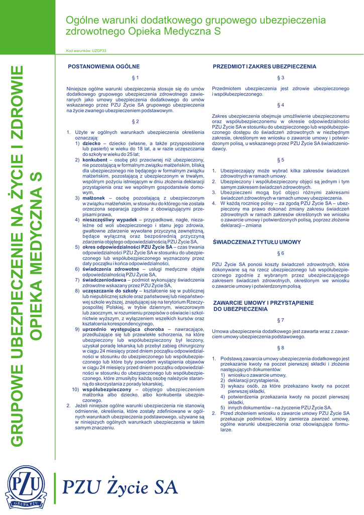 Ogólne warunki dodatkowego grupowego ubezpieczenia zdrowotnego Opieka Medyczna S Kod warunków: UZGP33 POSTANOWIENIA OGÓLNE PRZEDMIOT I ZAKRES UBEZPIECZENIA §1 §3 Niniejsze ogólne warunki ubezpieczenia stosuje się do umów dodatkowego grupowego ubezpieczenia zdrowotnego zawieranych jako umowy ubezpieczenia dodatkowego do umów wskazanego przez PZU Życie SA grupowego ubezpieczenia na życie zwanego ubezpieczeniem podstawowym. Przedmiotem ubezpieczenia jest zdrowie ubezpieczonego i współubezpieczonego. §2 1. Użyte w ogólnych warunkach ubezpieczenia określenia oznaczają: 1) dziecko – dziecko (własne, a także przysposobione lub pasierb) w wieku do 18 lat, a w razie uczęszczania do szkoły w wieku do 25 lat; 2) konkubent – osobę płci przeciwnej niż ubezpieczony, nie pozostającą w formalnym związku małżeńskim, bliską dla ubezpieczonego nie będącego w formalnym związku małżeńskim, pozostającą z ubezpieczonym w trwałym, wspólnym pożyciu istniejącym w dniu złożenia deklaracji przystąpienia oraz we wspólnym gospodarstwie domowym, 3) małżonek – osobę pozostającą z ubezpieczonym w związku małżeńskim, w stosunku do którego nie została orzeczona separacja zgodnie z obowiązującymi przepisami prawa, 4) nieszczęśliwy wypadek – przypadkowe, nagłe, niezależne od woli ubezpieczonego i stanu jego zdrowia, gwałtowne zdarzenie wywołane przyczyną zewnętrzną, będące wyłączną oraz bezpośrednią przyczyną zdarzenia objętego odpowiedzialnością PZU Życie SA, 5) okres odpowiedzialności PZU Życie SA – czas trwania odpowiedzialności PZU Życie SA w stosunku do ubezpieczonego lub współubezpieczonego wyznaczony przez daty początku i końca odpowiedzialności, 6) świadczenia zdrowotne – usługi medyczne objęte odpowiedzialnością PZU Życie SA, 7) świadczeniodawca – podmiot wykonujący świadczenia zdrowotne wskazany przez PZU Życie SA, 8) uczęszczanie do szkoły – kształcenie się w publicznej lub niepublicznej szkole oraz państwowej lub niepaństwowej szkole wyższej, znajdującej się na terytorium Rzeczypospolitej Polskiej, w trybie dziennym, wieczorowym lub zaocznym, w rozumieniu przepisów o oświacie i szkolnictwie wyższym, z wyłączeniem wszelkich kursów oraz kształcenia korespondencyjnego, 9) uprzednio występująca choroba – nawracające, przedłużające się lub przewlekłe schorzenia, na które ubezpieczony lub współubezpieczony był leczony, uzyskał poradę lekarską lub przebył zabieg chirurgiczny w ciągu 24 miesięcy przed dniem początku odpowiedzialności w stosunku do ubezpieczonego lub współubezpieczonego lub które były powodem wystąpienia objawów w ciągu 24 miesięcy przed dniem początku odpowiedzialności w stosunku do ubezpieczonego lub współubezpieczonego, które zmusiłyby każdą osobę należycie staranną do skorzystania z porady lekarskiej, 10) współubezpieczony – objętego ubezpieczeniem małżonka albo dziecko, albo konkubenta ubezpieczonego. 2. Jeżeli niniejsze ogólne warunki ubezpieczenia nie stanowią odmiennie, określenia, które zostały zdefiniowane w ogólnych warunkach ubezpieczenia podstawowego, używane są w niniejszych ogólnych warunkach ubezpieczenia w takim samym znaczeniu. §4 Zakres ubezpieczenia obejmuje umożliwienie ubezpieczonemu oraz współubezpieczonemu w okresie odpowiedzialności PZU Życie SA w stosunku do ubezpieczonego lub współubezpieczonego dostępu do świadczeń zdrowotnych w niezbędnym zakresie, określonym we wniosku o zawarcie umowy i potwierdzonym polisą, u wskazanego przez PZU Życie SA świadczeniodawcy. §5 1. Ubezpieczający może wybrać kilka zakresów świadczeń zdrowotnych w ramach umowy. 2. Ubezpieczony i współubezpieczony objęci są jednym i tym samym zakresem świadczeń zdrowotnych. 3. Ubezpieczeni mogą być objęci różnymi zakresami świadczeń zdrowotnych w ramach umowy ubezpieczenia. 4. W każdą rocznicę polisy – za zgodą PZU Życie SA – ubezpieczony ma prawo dokonać zmiany zakresu świadczeń zdrowotnych w ramach zakresów określonych we wniosku o zawarcie umowy i potwierdzonych polisą, poprzez złożenie deklaracji – zmiana ŚWIADCZENIA Z TYTUŁU UMOWY §6 PZU Życie SA ponosi koszty świadczeń zdrowotnych, które dokonywane są na rzecz ubezpieczonego lub współubezpieczonego zgodnie z wybranym przez ubezpieczającego zakresem świadczeń zdrowotnych, określonym we wniosku o zawarcie umowy i potwierdzonym polisą. ZAWARCIE UMOWY I PRZYSTĄPIENIE DO UBEZPIECZENIA §7 Umowa ubezpieczenia dodatkowego jest zawarta wraz z zawarciem umowy ubezpieczenia podstawowego. §8 1. Podstawą zawarcia umowy ubezpieczenia dodatkowego jest przekazanie kwoty na poczet pierwszej składki i złożenie następujących dokumentów: 1) wniosku o zawarcie umowy, 2) deklaracji przystąpienia, 3) wykazu osób, za które przekazano kwoty na poczet pierwszej składki, 4) potwierdzenia przekazania kwoty na poczet pierwszej składki, 5) innych dokumentów – na życzenie PZU Życie SA. 2. Przed złożeniem wniosku o zawarcie umowy PZU Życie SA przekazuje podmiotowi, który zamierza zawrzeć umowę, ogólne warunki ubezpieczenia oraz obowiązujące formularze. 3. PZU Życie SA może odmówić zawarcia umowy. W tym przypadku PZU Życie SA zwraca ubezpieczającemu kwotę przekazaną, na poczet pierwszej składki w pełnej wysokości. 4. PZU Życie SA potwierdza zawarcie umowy polisą. 5. Umowę uważa się za zawartą z chwilą doręczenia polisy ubezpieczającemu, przy czym odpowiedzialność PZU Życie SA w stosunku do poszczególnych ubezpieczonych lub współubezpieczonych rozpoczyna się nie wcześniej niż w terminie ustalonym zgodnie z § 17. ZMIANA UMOWY § 15 Wszelkie zmiany w umowie są dokonywane w drodze rokowań, w trybie ofertowym bądź w inny przewidziany ogólnie obowiązującymi przepisami prawa sposób i potwierdzane w formie pisemnej, z wyjątkiem zmian, których dopuszczalny zakres określon
