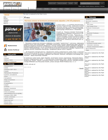 Biznes b E Firma Fundusze -2 d Gie Liderzy Konkursy Mechanizmy Portfel |łPodatki 006 013 iznes od a klasa poleca biznesu podstaw 2004 2007 Finansowe Startuj z nami Dodaj do zakładek Kontakt szukana fraza... RSS Piątek 4 marca, imieniny Adrianny, Kazimierza i Wacława Finanse Firma Gospodarka Dotacje Prawo Prestiż Ekologia Kraj Świat This text is replaced by the Flash movie. GIEŁDA WIG + WIG20 + mWIG40 + sWIG80 + WIG -PL + News Wiadomo ści Pierwsza umowa na termiczne przetwarzanie odpadów z PO IiŚ podpisana Banki 3 marca 2011 r. w siedzibie Ministerstwa Rozwoju Regionalnego podpisana zosta ła pierwsza umowa w zakresie termicznego przetwarzania odpadów w ramach Programu Operacyjnego Infrastruktura i Środowisko. Projekt pt. "Budowa Zak ładu Termicznego Przekszta łcania Odpadów Komunalnych dla Bydgosko –Toruńs k i e g o O b s z a r u Metropolitalnego" otrzyma ł dofinansowanie unijne w wysoko ści prawie 340 mln z ł, a jego całkowita warto ść wynosi ponad 619 mln z ł. Zako ńczenie inwestycji planowane jest na 2013 rok. Wydawnictwo Zamów Portfel.pl Barometr inwestora - Dzisiejsza umowa jest pierwsz ą podpisaną na projekt "spalarniowy" i pierwsz ą realizowaną wspólnie przez wiele samorz ądów - powiedział wiceminister rozwoju regionalnego Adam Zdzieb ło. Dzięki tej inwestycji mieszkańcy Bydgoszczy i Torunia zyskaj ą spójny system gospodarki odpadami. Ponadto projekt przyczyni si ę do zmniejszenia liczby wysypisk na terenie Bydgosko -Toruńskiego Obszaru Metropolitalnego, a tym samym obni żenia poziomu sk ładowania odpadów. Wp łynie to na poprawę ochrony środowiska naturalnego i polepszenie jako ści życia w regionie. Dla Ciebie Dla Twojej Firmy Fundusze inwestycyjne TFI OFI Barometr Funduszy Emerytury PTE BFE Waluty Kursy walut Archiwum kursów walut Kalkulator walutowy Wykres rentowno ści walut Biura Maklerskie Mapa - W P r o g r a m i e I n f r a s t r u k t u r a i Śr o d o w i s k o m a m y p o d p i s a n y c h 1 2 2 8 u m ó w o w a r t o ści dofinansownaia ponad 60 mld zł. W najbliższym czasie planowane jest podpisanie umów na kolejne This text is replaced by the Flash inwestycje w zakresie gospodarki odpadami dla Krakowa, Olsztyna, subregionu Koni ńskiego oraz movie. Poznania - dodał wiceminister Zdziebło. This text is replaced by the Flash W konferencji udzia ł wzięli: Adam Zdzieb ło, wiceminister rozwoju regionalnego, Aleksandra Malarz, movie. dyrektor Departamentu POIi Ś w Ministerstwie Środowiska, Rafa ł Bruski, prezydent Miasta Bydgoszczy, Micha ł Zaleski, prezydent Miasta Torunia, Ma łgorzata Skucha, zast ępca prezesa This text is replaced by the Flash movie. zarządu NFOŚiGW oraz Mieczysław Serafin, prezes Zarz ądu MKUO ProNatura Sp. z o. o. RSS Kontakt Startuj z nami Dodaj do ulubionych This text is replaced by the Flash movie. Źródło: pois.gov.pl Ubezpieczenia 2011-03-04 Giełda Powrót Fundusze 2007-2013 Podatki Mechanizmy Finansowe Systemy zarz ądzania Praca This text movie. This text movie. This text movie. This text movie. Zarządzanie Stopy procentowe Konkursy W gospodarce Książki E-biznes Rozwój i inwestycje Szkolenia Firma od podstaw Wprowadzanie firm na gie łdę Fundusze 2004-2006 Trendy w biznesie Liderzy biznesu Warto tam być Biznes klasa Portfel poleca O portalu | Polityka prywatno ści | Kontakt | RSS Copyright 2007 -2011 Portfel.pl. Wszelkie prawa zastrze żone. is replaced by the Flash is replaced by the Flash is replaced by the Flash is replaced by the Flash