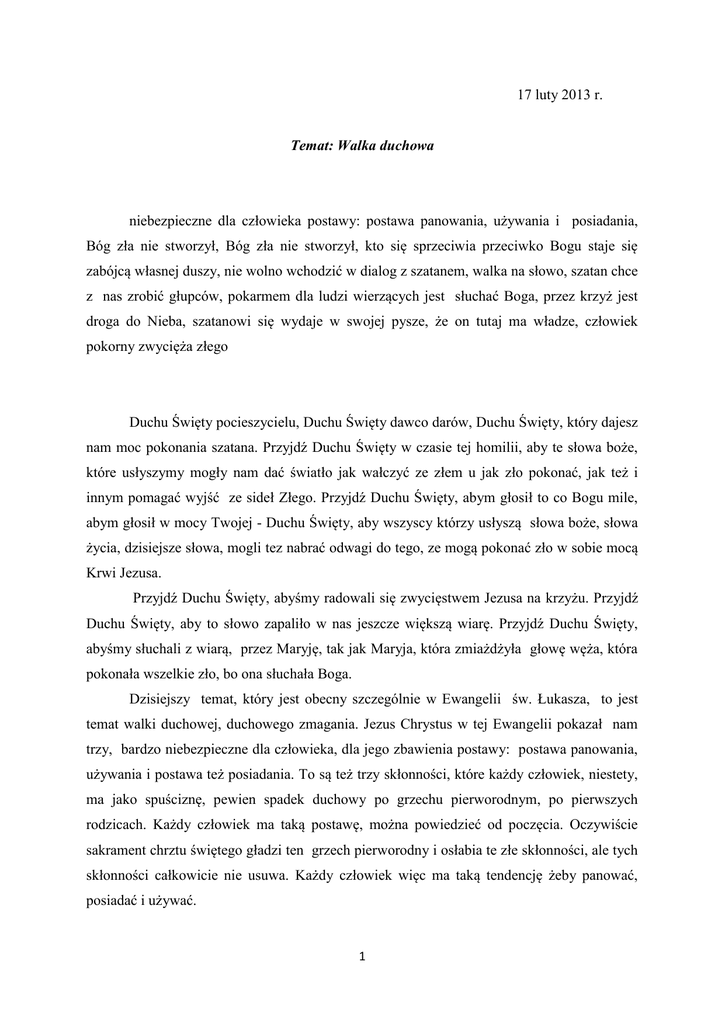17 luty 2013 r. Temat: Walka duchowa niebezpieczne dla człowieka postawy: postawa panowania, używania i posiadania, Bóg zła nie stworzył, Bóg zła nie stworzył, kto się sprzeciwia przeciwko Bogu staje się zabójcą własnej duszy, nie wolno wchodzić w dialog z szatanem, walka na słowo, szatan chce z nas zrobić głupców, pokarmem dla ludzi wierzących jest słuchać Boga, przez krzyż jest droga do Nieba, szatanowi się wydaje w swojej pysze, że on tutaj ma władze, człowiek pokorny zwycięża złego Duchu Święty pocieszycielu, Duchu Święty dawco darów, Duchu Święty, który dajesz nam moc pokonania szatana. Przyjdź Duchu Święty w czasie tej homilii, aby te słowa boże, które usłyszymy mogły nam dać światło jak wałczyć ze złem u jak zło pokonać, jak też i innym pomagać wyjść ze sideł Złego. Przyjdź Duchu Święty, abym głosił to co Bogu mile, abym głosił w mocy Twojej - Duchu Święty, aby wszyscy którzy usłyszą słowa boże, słowa życia, dzisiejsze słowa, mogli tez nabrać odwagi do tego, ze mogą pokonać zło w sobie mocą Krwi Jezusa. Przyjdź Duchu Święty, abyśmy radowali się zwycięstwem Jezusa na krzyżu. Przyjdź Duchu Święty, aby to słowo zapaliło w nas jeszcze większą wiarę. Przyjdź Duchu Święty, abyśmy słuchali z wiarą, przez Maryję, tak jak Maryja, która zmiażdżyła głowę węża, która pokonała wszelkie zło, bo ona słuchała Boga. Dzisiejszy temat, który jest obecny szczególnie w Ewangelii św. Łukasza, to jest temat walki duchowej, duchowego zmagania. Jezus Chrystus w tej Ewangelii pokazał nam trzy, bardzo niebezpieczne dla człowieka, dla jego zbawienia postawy: postawa panowania, używania i postawa też posiadania. To są też trzy skłonności, które każdy człowiek, niestety, ma jako spuściznę, pewien spadek duchowy po grzechu pierworodnym, po pierwszych rodzicach. Każdy człowiek ma taką postawę, można powiedzieć od poczęcia. Oczywiście sakrament chrztu świętego gładzi ten grzech pierworodny i osłabia te złe skłonności, ale tych skłonności całkowicie nie usuwa. Każdy człowiek więc ma taką tendencję żeby panować, posiadać i używać. 1 Jezus Chrystus, w dzisiejszej Ewangelii, pokazuje, że na te postawy, które są postawami od Złego, bo szatan ma właśnie w sobie taką postawę, panowania bez Boga, oczywiście, posiadania tego co ma Bóg i używania tego zgodnie ze swoimi pragnieniami. Jego pragnieniem, pragnieniem szatana było to żeby stać się Bogiem, żeby panować, panować nad Aniołami. To był jeden z Aniołów, właściwie największy Anioł. Anioł który otrzymał od Boga największe dary, największy, najbliżej Pana Boga, najbardziej też będący w relacji z Bogiem, żył w relacji przecież, przyjaźni z Bogiem, na początku oczywiście, ale zapragnął żeby stać się takim jak Bóg. Nie wystarczyło mu to, że w imieniu Boga też ma władzę nad Aniołami, chciał mieć władzę nad Bogiem. Można powiedzieć, skąd w jego umyśle anielskim pojawiła się taka myśl, żeby być jak Bóg? Miał przecież wszystko. Sądzę, że Pan Bóg doskonale wiedział, że tworząc takiego Anioła ryzykuje tym, że ten Anioł od Niego odejdzie, że stanie się największym buntownikiem, że najbardziej będzie sprzeciwiał się Jego Woli, ale Pan Bóg taką ma miłość do każdo stworzenia, że wiedząc nawet, że to stworzenie odwróci się od Niego, stwarza je. Stworzył więc szatana, bo niektórzy się pytają dlaczego jest szatan, dlaczego jest zło, skąd to jest, przecież w Bogu nie ma zła. Jak to jest, że wzięło się zło, ale zła tak naprawdę nie ma. Zło to jest, można powiedzieć, konkretnie, tak bardziej filozoficznie, teologicznie, że to jest brak dobra. Zło to jest sprzeciw wobec dobra, sprzeciw wobec Boga, bo tylko Bóg jest dobry i w Bogu nigdy nie było i nigdy nie będzie żadnego zła. Bóg mimo, że jest tak wielki i nieskończony. Bóg jest pokorny, nawet może szatan, zły duch zobaczył, że Bóg jest pokorny, że jest łagodny, że Bóg jest Bogiem o wrażliwym sercu i może wtedy ta myśl się pojawiła żeby zapanować nad Bogiem. Mówię taki wstęp żeby pokazać nam, że Bóg zła nie stworzył. Zła nie było i Bóg się nie cieszy ze zła. Można powiedzieć, że w pewnym sensie w naszym języku, że Bóg zła nie stworzył, ale zła nigdy nie chciał. I w dzisiejszej Ewangelii Pan Jezus pokazuje nam, że można pokonać tego szatana, czyli największego upadłego Anioła, najbardziej inteligentnego, najbardziej przewrotnego, zakłamanego. Jak mówi Pan Jezus o nim w ewangelii, że jest zabójcą, ojcem kłamstwa. Na czym polega to, że jest zabójcą? Można powiedzieć zabił Boga w sobie w pewnym sensie. To znaczy zabił też łaskę od Boga, którą otrzymał w sobie, wyrzucił Boga ze swojego życia i innych aniołów, a potem również pierwszych rodziców i innych ludzi tym samym kusi, żeby zabić swoją duszę przez to, że się sprzeciwi przeciwko Bogu. Ktoś się sprzeciwia przeciwko Bogu, wyrzuca Boga ze swojego życia, wybiera życie bez Boga, umiera. Można powiedzieć, staje się zabójcą własnej duszy. I tak samo zły duch 2 jest nazwany przez Pana Jezus zabójcą, bo zabija w życiu ludzi życie boże, odbiera tą laskę bożą, jest ojcem kłamstwa, bo nas okłamuje. Nie wolno wchodzić w dialog z szatanem. Dzisiaj Pan Jezus, w Ewangelii, nam pokazuje, że On nie rozmawiał z szatanem, że nie uciął sobie jakaś pogawędkę milą, jak to było w dawnych czasach, kiedy po prostu żyli w przyjaźni, jak to było kiedyś pięknie, nie było czegoś takiego. Szatan, który był kiedyś największym przyjacielem Boga, stal się największym wrogiem Boga. Można powiedzieć, przerażające, dla nas niepojęte. Jezus mówi: nie rozmawiające ze złym duchem, nie można z nim rozmawiać. Kiedy są egzorcyzmy to kapłani nie rozmawiają ze złym duchem. Nie mogą sobie właśnie rozmawiać jak tam