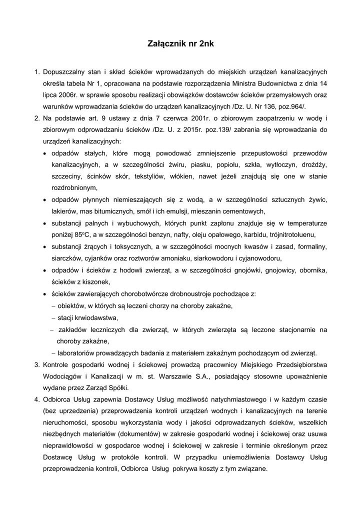 Załącznik nr 2nk 1. Dopuszczalny stan i skład ścieków wprowadzanych do miejskich urządzeń kanalizacyjnych określa tabela Nr 1, opracowana na podstawie rozporządzenia Ministra Budownictwa z dnia 14 lipca 2006r. w sprawie sposobu realizacji obowiązków dostawców ścieków przemysłowych oraz warunków wprowadzania ścieków do urządzeń kanalizacyjnych /Dz. U. Nr 136, poz.964/. 2. Na podstawie art. 9 ustawy z dnia 7 czerwca 2001r. o zbiorowym zaopatrzeniu w wodę i zbiorowym odprowadzaniu ścieków /Dz. U. z 2015r. poz.139/ zabrania się wprowadzania do urządzeń kanalizacyjnych: odpadów stałych, które mogą powodować zmniejszenie przepustowości przewodów kanalizacyjnych, a w szczególności żwiru, piasku, popiołu, szkła, wytłoczyn, drożdży, szczeciny, ścinków skór, tekstyliów, włókien, nawet jeżeli znajdują się one w stanie rozdrobnionym, odpadów płynnych niemieszających się z wodą, a w szczególności sztucznych żywic, lakierów, mas bitumicznych, smół i ich emulsji, mieszanin cementowych, substancji palnych i wybuchowych, których punkt zapłonu znajduje się w temperaturze poniżej 85oC, a w szczególności benzyn, nafty, oleju opałowego, karbidu, trójnitrotoluenu, substancji żrących i toksycznych, a w szczególności mocnych kwasów i zasad, formaliny, siarczków, cyjanków oraz roztworów amoniaku, siarkowodoru i cyjanowodoru, odpadów i ścieków z hodowli zwierząt, a w szczególności gnojówki, gnojowicy, obornika, ścieków z kiszonek, ścieków zawierających chorobotwórcze drobnoustroje pochodzące z: obiektów, w których są leczeni chorzy na choroby zakaźne, stacji krwiodawstwa, zakładów leczniczych dla zwierząt, w których zwierzęta są leczone stacjonarnie na choroby zakaźne, laboratoriów prowadzących badania z materiałem zakaźnym pochodzącym od zwierząt. 3. Kontrole gospodarki wodnej i ściekowej prowadzą pracownicy Miejskiego Przedsiębiorstwa Wodociągów i Kanalizacji w m. st. Warszawie S.A., posiadający stosowne upoważnienie wydane przez Zarząd Spółki. 4. Odbiorca Usług zapewnia Dostawcy Usług możliwość natychmiastowego i w każdym czasie (bez uprzedzenia) przeprowadzenia kontroli urządzeń wodnych i kanalizacyjnych na terenie nieruchomości, sposobu wykorzystania wody i jakości odprowadzanych ścieków, wszelkich niezbędnych materiałów (dokumentów) w zakresie gospodarki wodnej i ściekowej oraz usuwa nieprawidłowości w gospodarce wodnej i ściekowej w zakresie i terminie określonym przez Dostawcę Usług w protokóle kontroli. W przypadku uniemożliwienia Dostawcy Usług przeprowadzenia kontroli, Odbiorca Usług pokrywa koszty z tym związane. 2 Tabela nr 1 Dopuszczalne wartości wskaźników zanieczyszczeń w ściekach wprowadzanych do miejskich urządzeń kanalizacji sanitarnej lub ogólnospławnej Jednostka stężenia Wskaźnik Temperatura Odczyn pH Pięciodniowe biochemiczne zapotrzebowanie tlenu-BZT5 Chemiczne zapotrzebowanie tlenu – ChZT Azot ogólny Azot amonowy Fosfor ogólny Zawiesiny ogólne Substancje ekstrahujące się eterem naftowym Substancje powierzchniowo czynne niejonowe Substancje powierzchniowo czynne anionowe Chlorki Siarczany Ołów Miedź Cynk Kadm Chrom ogólny Chrom+6 Nikiel Żelazo Cyjanki wolne Cyjanki związane Rtęć Węglowodory ropopochodne 2 o C pH mgO2/l mgO2/l mgN/l mgN/l mgP/l mg/l mg/l mg/l mg/l mg/l mg/l mgPb/l mgCu/l mgZn/l mgCd/l mgCr/l mgCr/l mgNi/l mgFe/l mg/l mg/l mgHg/l mg/l Stężenie dopuszczalne 35 i poniżej 6,5 - 9,5 700 i poniżej 1000 i poniżej 220 i poniżej 200 i poniżej 15 i poniżej 500 i poniżej 100 i poniżej 20 i poniżej 15 i poniżej 1000 i poniżej 500 i poniżej 1,0 i poniżej 1,0 i poniżej 5,0 i poniżej 0,4 i poniżej 1,0 i poniżej 0,2 i poniżej 1,0 i poniżej 10 i poniżej 0,5 i poniżej 5,0 i poniżej 0,1 i poniżej 15 i poniżej