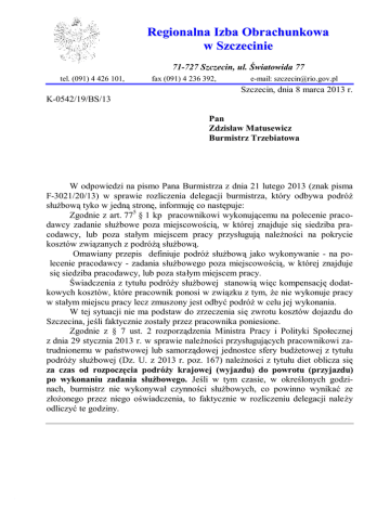 Regionalna Izba Obrachunkowa w Szczecinie 71-727 Szczecin, ul. Światowida 77 tel. (091) 4 426 101, fax (091) 4 236 392, e-mail: [email protected] Szczecin, dnia 8 marca 2013 r. K-0542/19/BS/13 Pan Zdzisław Matusewicz Burmistrz Trzebiatowa W odpowiedzi na pismo Pana Burmistrza z dnia 21 lutego 2013 (znak pisma F-3021/20/13) w sprawie rozliczenia delegacji burmistrza, który odbywa podróż służbową tyko w jedną stronę, informuję co następuje: Zgodnie z art. 775 § 1 kp pracownikowi wykonującemu na polecenie pracodawcy zadanie służbowe poza miejscowością, w której znajduje się siedziba pracodawcy, lub poza stałym miejscem pracy przysługują należności na pokrycie kosztów związanych z podróżą służbową. Omawiany przepis definiuje podróż służbową jako wykonywanie - na polecenie pracodawcy - zadania służbowego poza miejscowością, w której znajduje się siedziba pracodawcy, lub poza stałym miejscem pracy. Świadczenia z tytułu podróży służbowej stanowią więc kompensację dodatkowych kosztów, które pracownik ponosi w związku z tym, że nie wykonuje pracy w stałym miejscu pracy lecz zmuszony jest odbyć podróż w celu jej wykonania. W tej sytuacji nie ma podstaw do zrzeczenia się zwrotu kosztów dojazdu do Szczecina, jeśli faktycznie zostały przez pracownika poniesione. Zgodnie z § 7 ust. 2 rozporządzenia Ministra Pracy i Polityki Społecznej z dnia 29 stycznia 2013 r. w sprawie należności przysługujących pracownikowi zatrudnionemu w państwowej lub samorządowej jednostce sfery budżetowej z tytułu podróży służbowej (Dz. U. z 2013 r. poz. 167) należności z tytułu diet oblicza się za czas od rozpoczęcia podróży krajowej (wyjazdu) do powrotu (przyjazdu) po wykonaniu zadania służbowego. Jeśli w tym czasie, w określonych godzinach, burmistrz nie wykonywał czynności służbowych, co powinno wynikać ze złożonego przez niego oświadczenia, to faktycznie w rozliczeniu delegacji należy odliczyć te godziny.